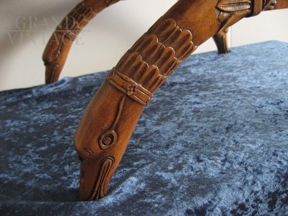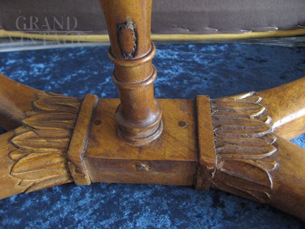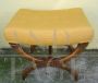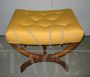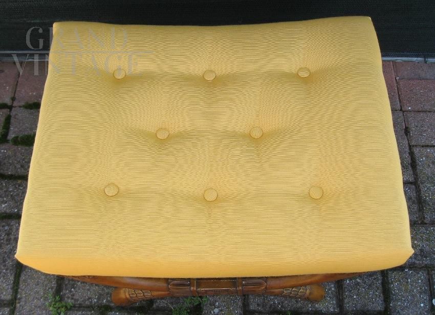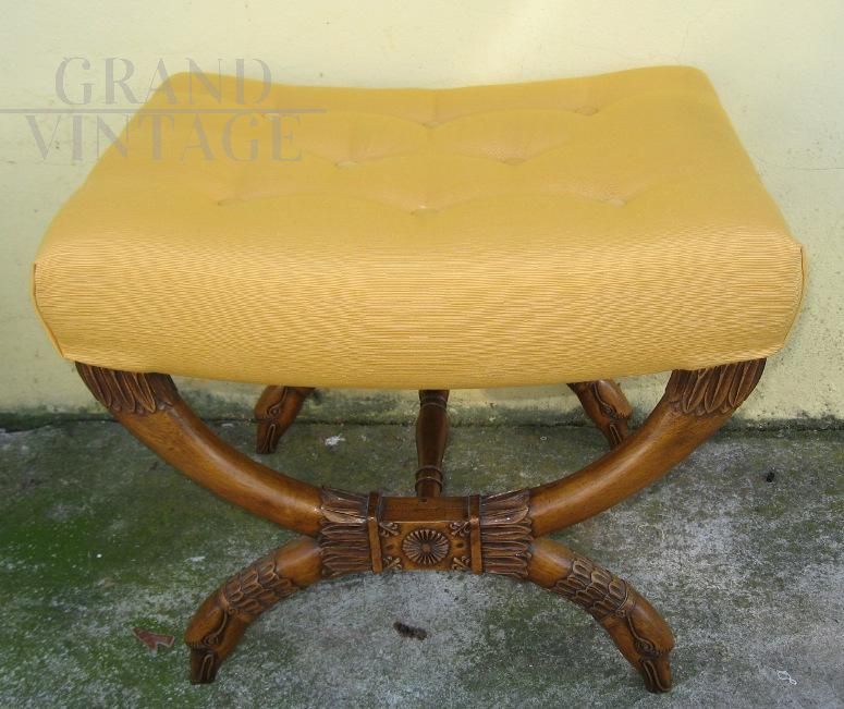 Panchetto sgabello vintage in stile Impero con struttura in noce massello intagliata a mano a collo d'oca e seduta tappezzata in tessuto giallo. Il panchetto è in ottime condizioni, compresa l’imbottitura. Realizzato negli anni '70 circa vintage in stile Impero.