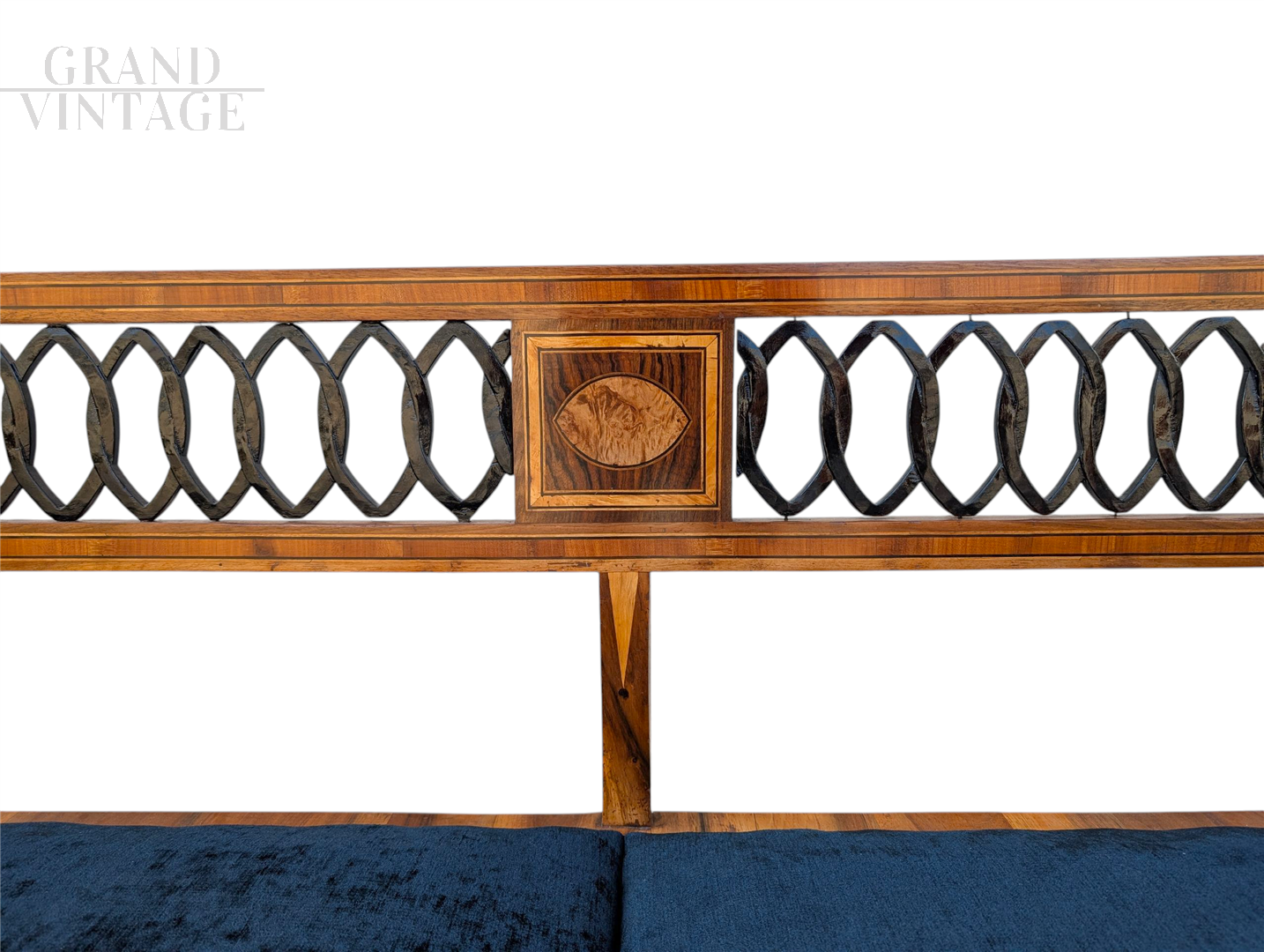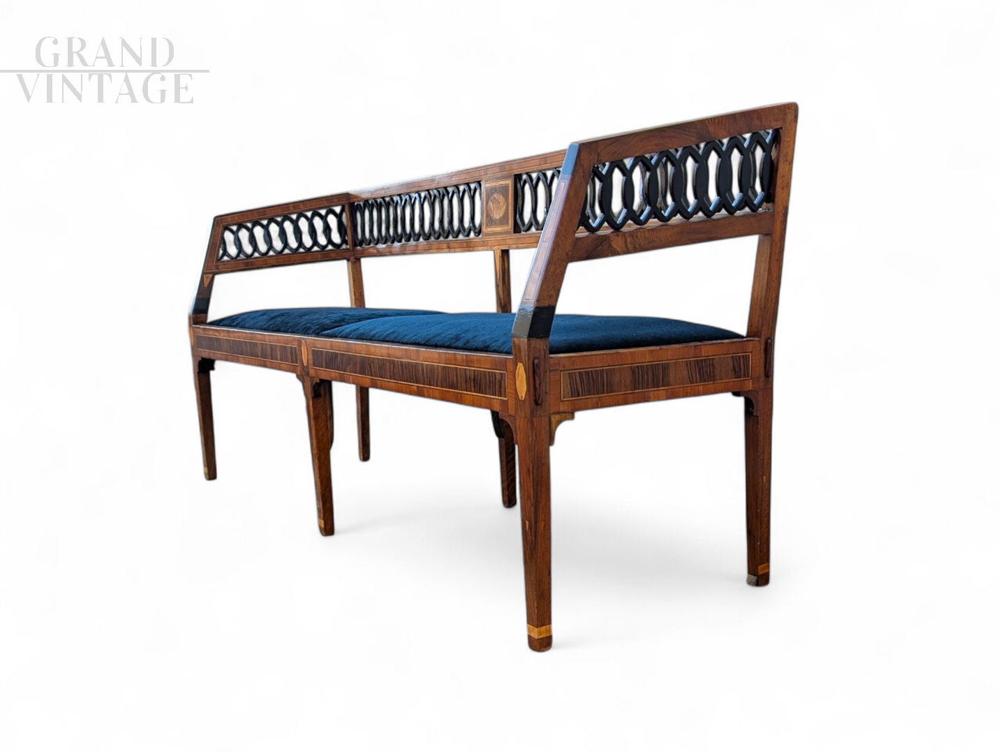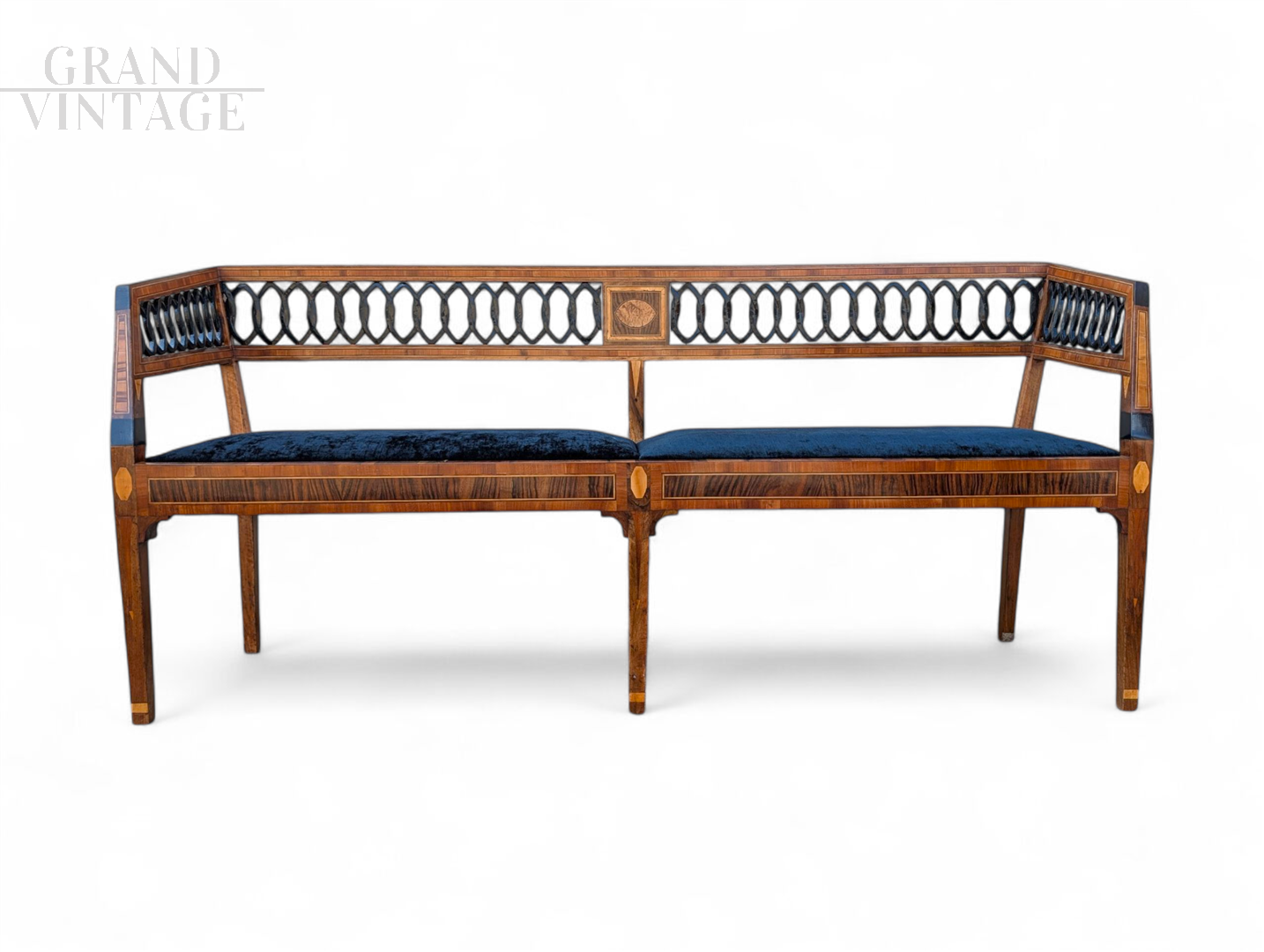 Raffinata panchina da interno realizzata in legno di noce, impreziosita da eleganti intarsi in acero che ne sottolineano il profilo e valorizzano la struttura con dettagli geometrici e decorativi. Lo schienale presenta una traforatura ornamentale di grande impatto visivo, composta da un motivo intrecciato scolpito, che dona leggerezza e movimento al design. Al centro dello schienale spicca una riserva intarsiata con motivo a medaglione in radica, simbolo di pregio e artigianalità. La seduta, imbottita e rivestita in un velluto blu notte, offre un comfort elegante e sobrio, perfettamente in sintonia con la raffinatezza dell’intera struttura. Le gambe dritte, impreziosite anch’esse da filettature in acero, conferiscono solidità e slancio all’arredo.