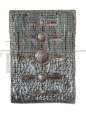 Scudo decorativo dell'artista M'horò realizzato con materiali di recupero. In particolare per quest'opera è stato utilizzato un antico radiatore. La sua colorazione è assolutamente naturale, data dal tempo e dal lavoro svolto negli anni. Le sue opere sono molto particolari non solo per l'utilizzo di soli materiali di recupero, ma anche per l'abilità del maestro nel sottoporli a un'operazione di deformazione, allungamento o perforazione per acquisire nuove forme.