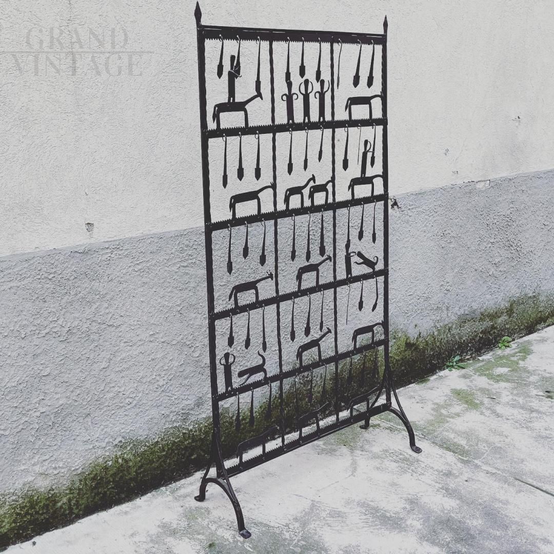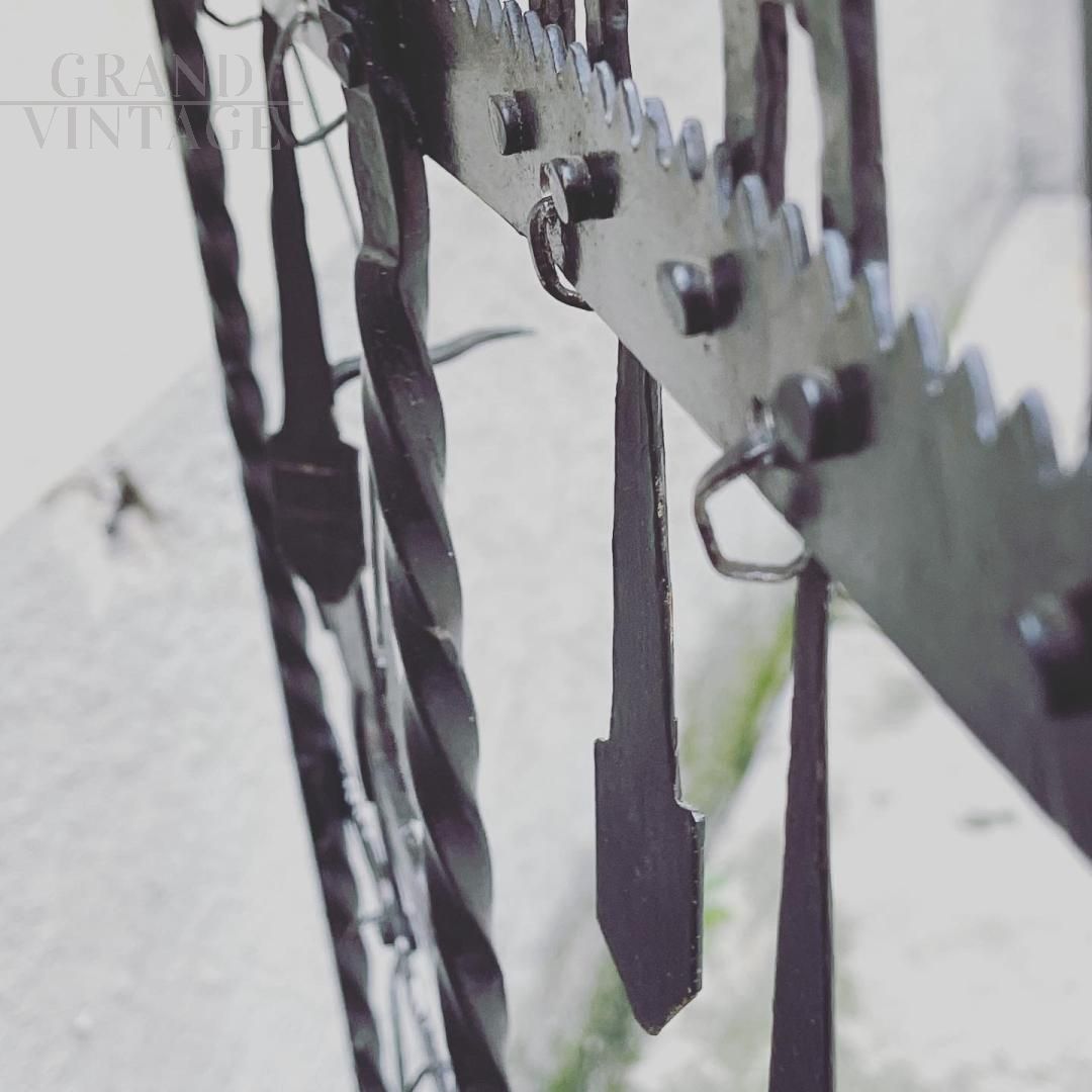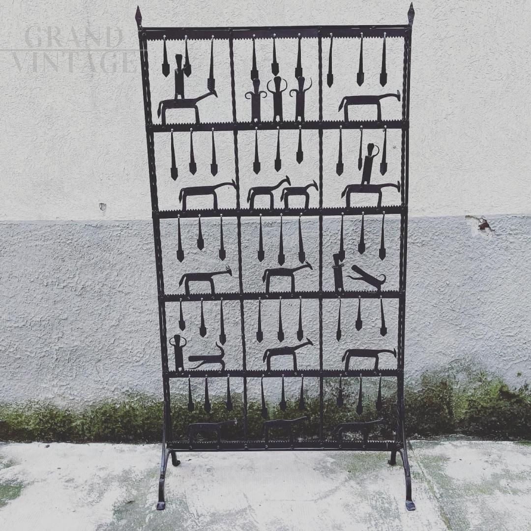 Pannello decorativo in ferro battuto rustico e unico realizzato artigianalmente. Il suo design minimale ricorda l'arte medievale, con figure umane e animali decorate a bulino.