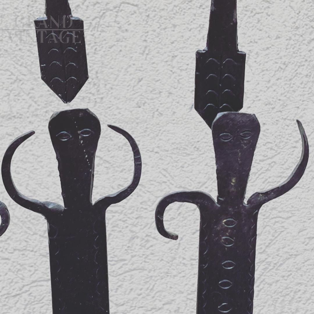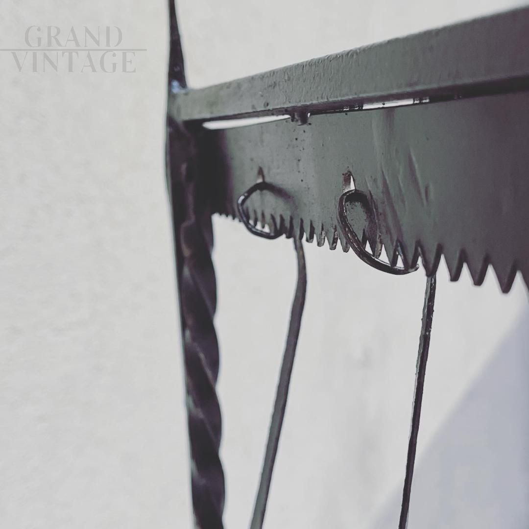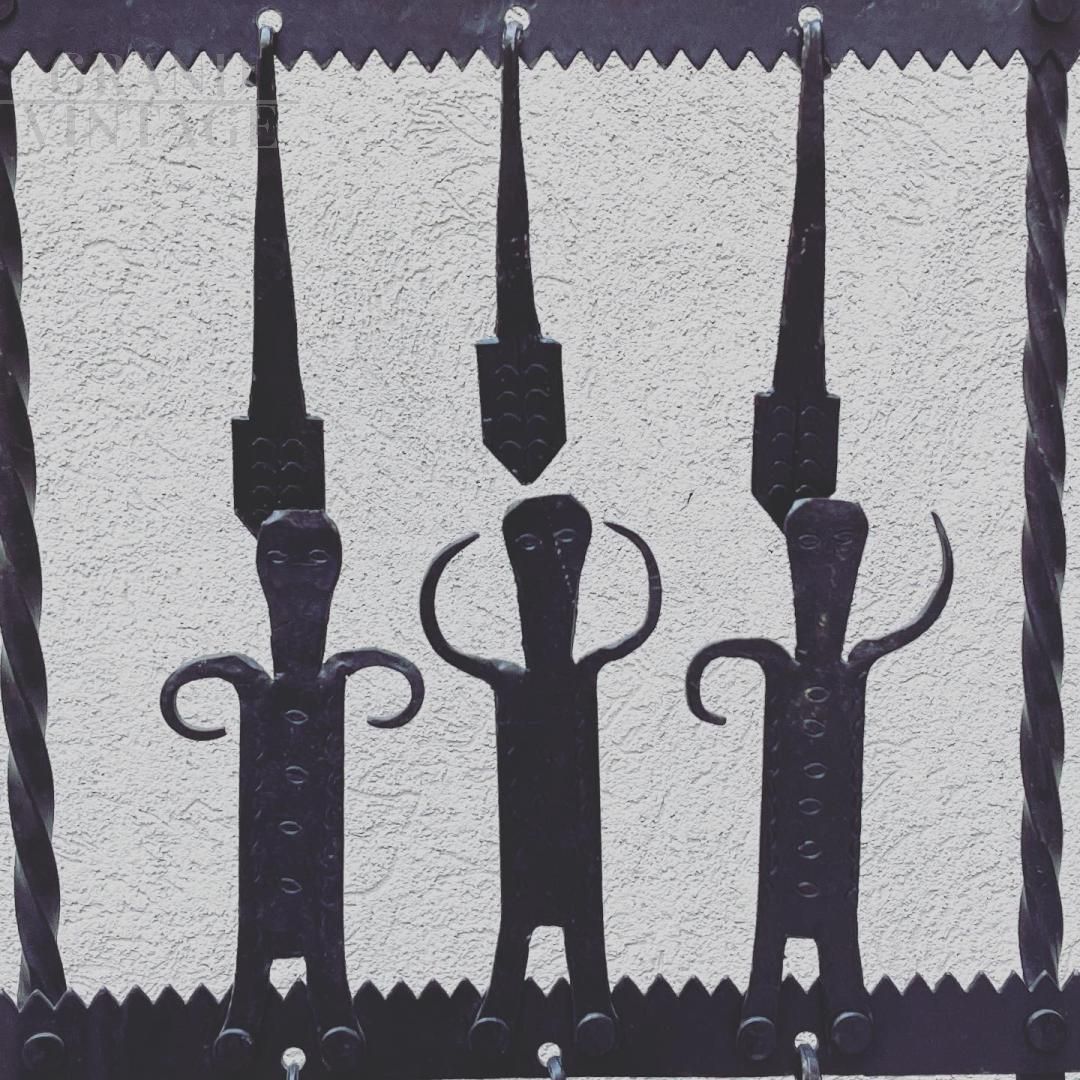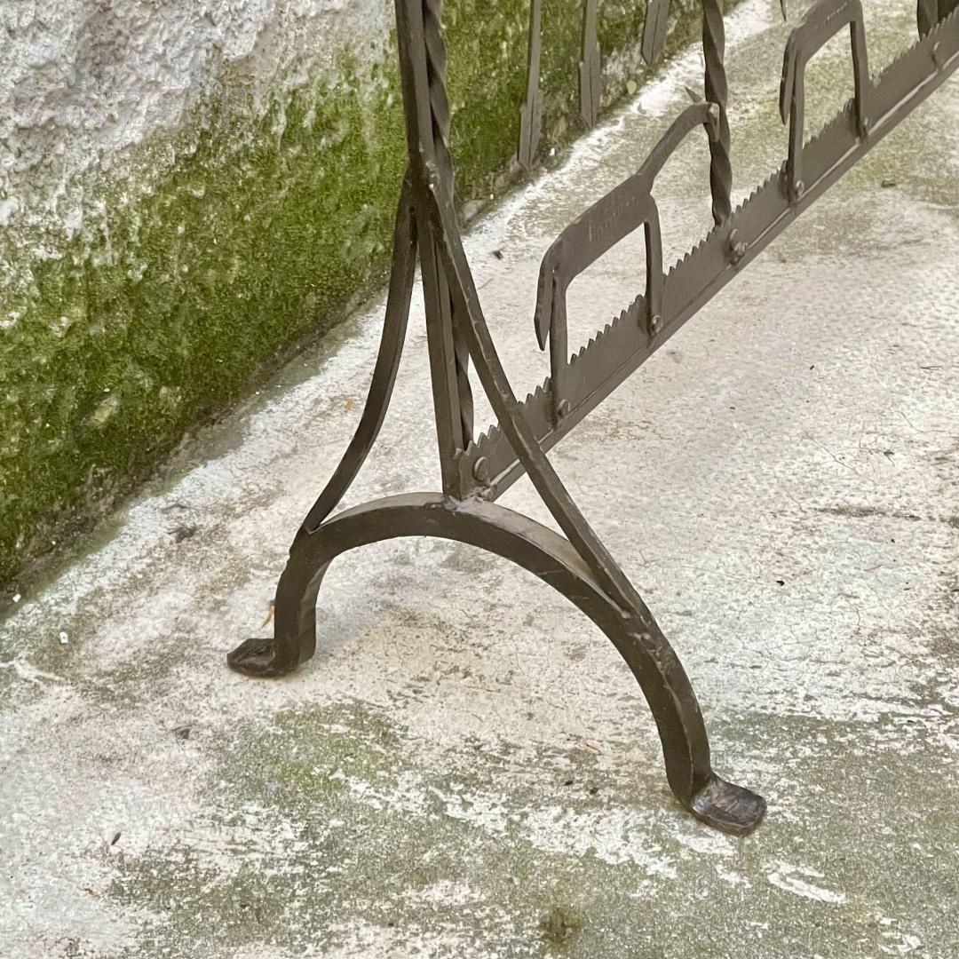 Pannello decorativo in ferro battuto rustico e unico realizzato artigianalmente. Il suo design minimale ricorda l'arte medievale, con figure umane e animali decorate a bulino.