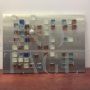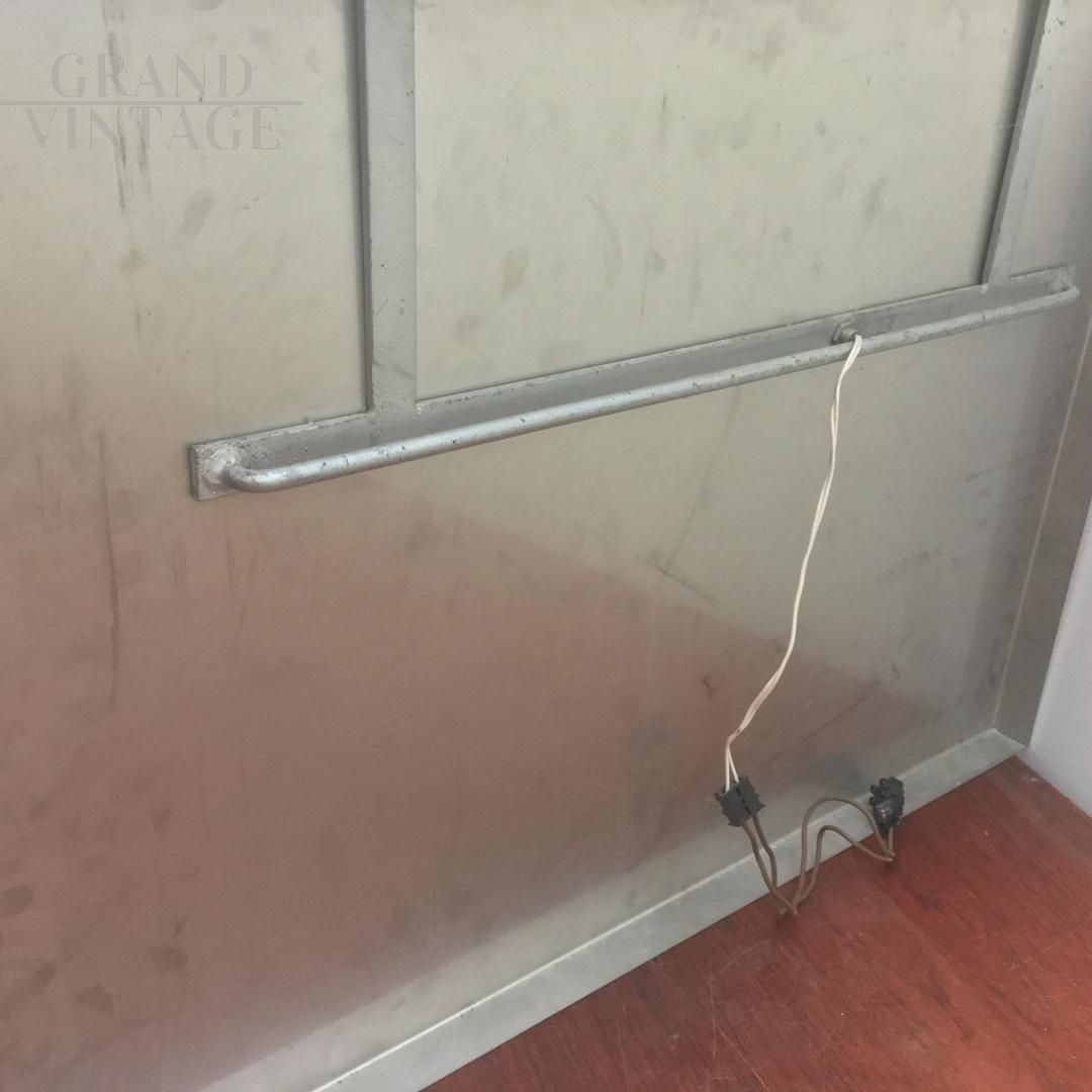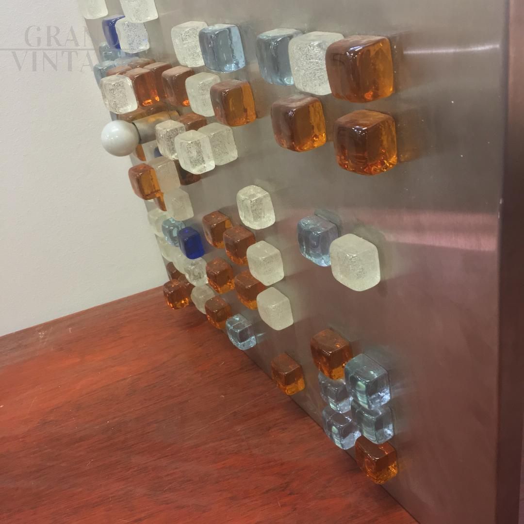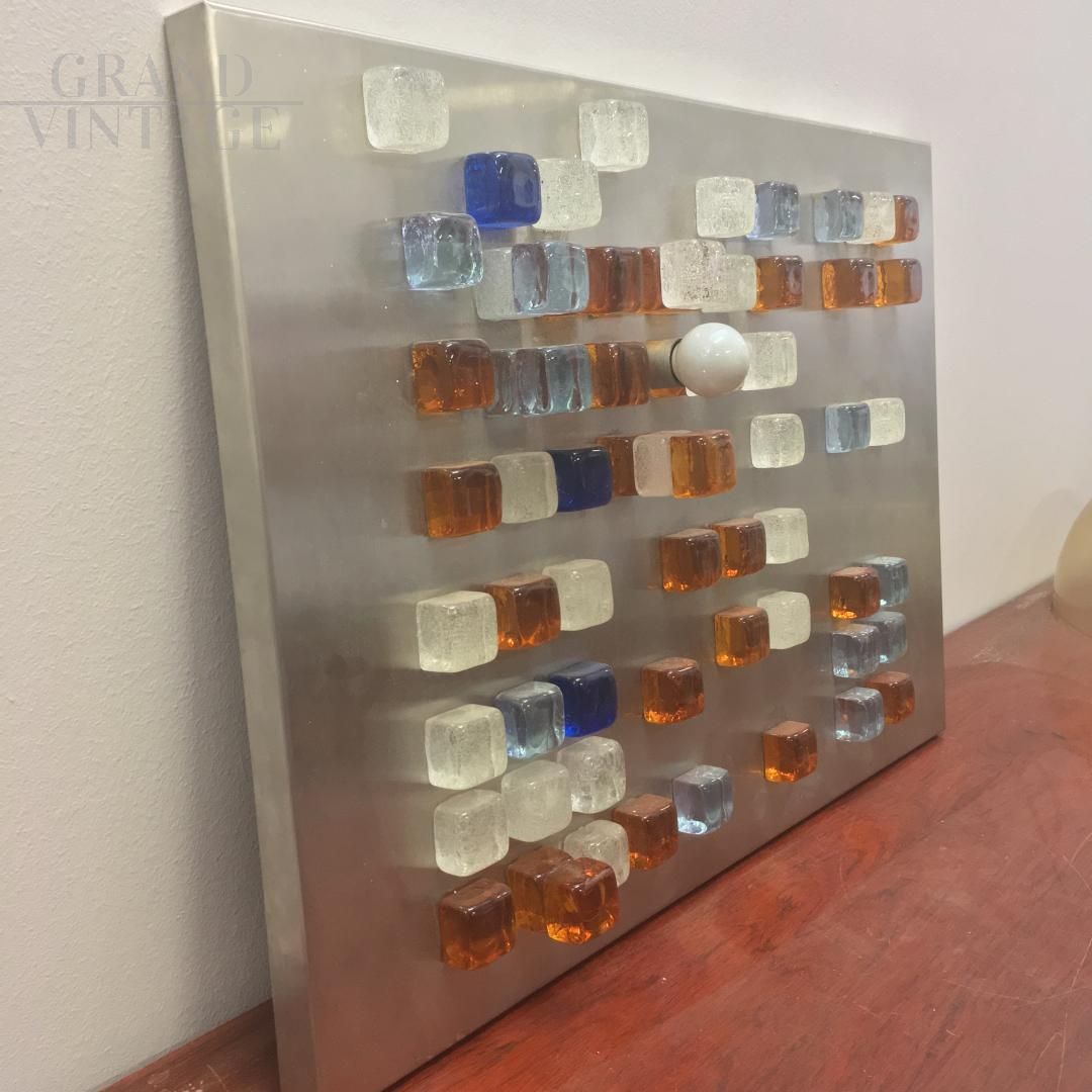 Pannello applique da parete di Poliarte - Progetto Arte Poli di Albano Poli, circa degli anni '70, formato da un grande pannello in acciaio decorato con piccole formelle in vetro colorato, illuminato da una lampadina.