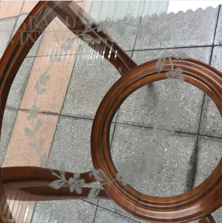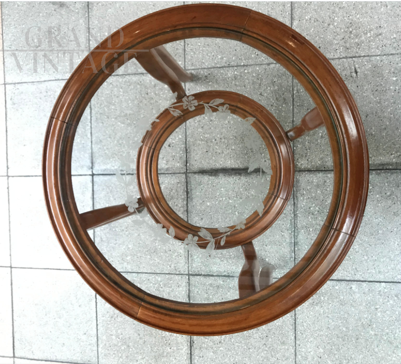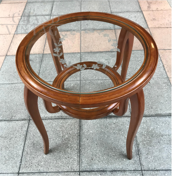 Tavolino gueridon in palissandro e con vetro appoggiato con incisione di motivo floreale, circa1950.