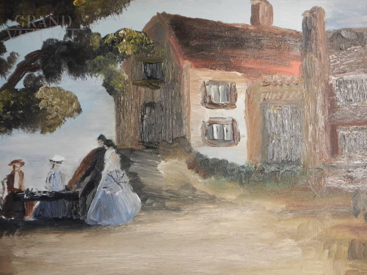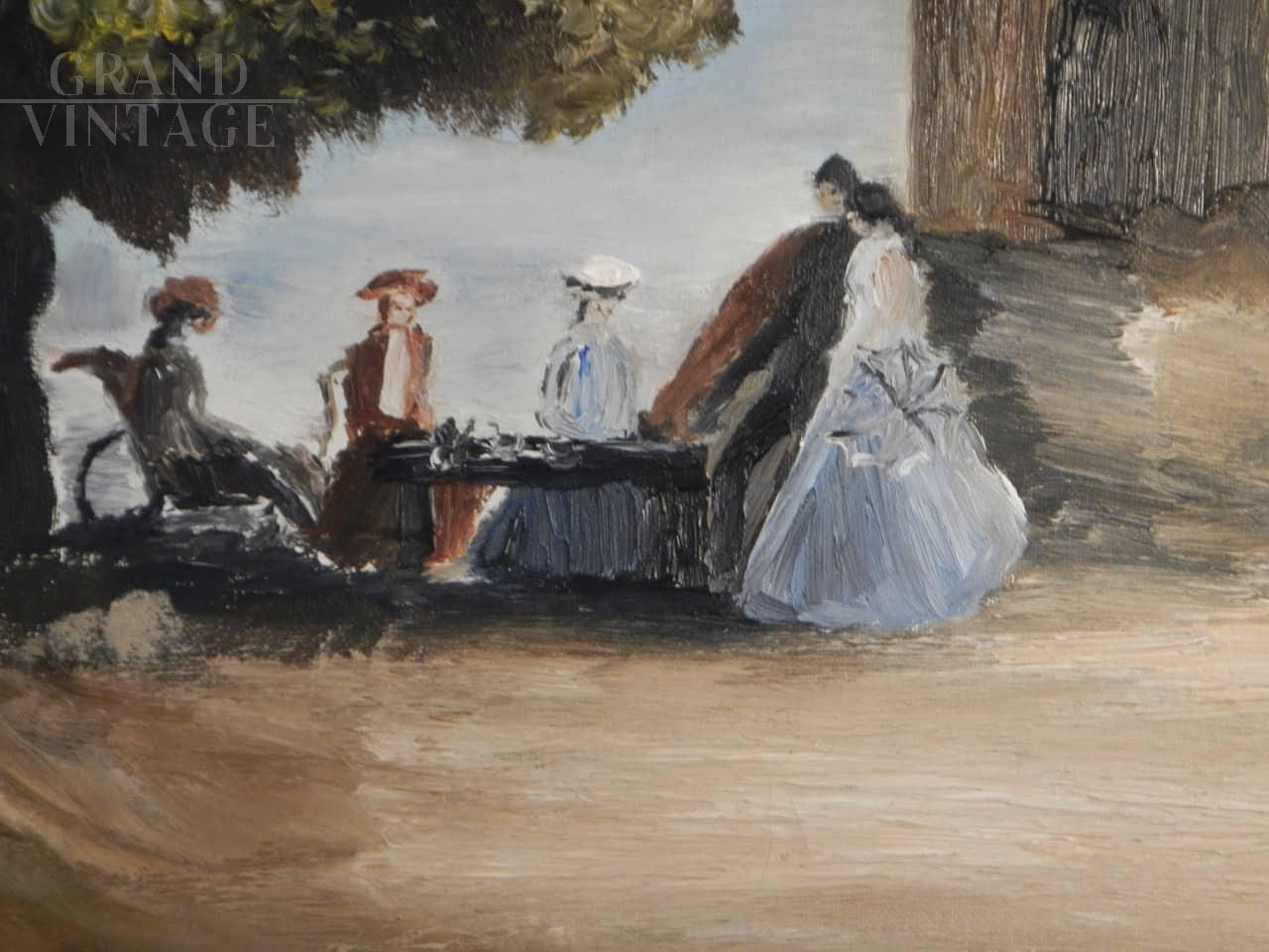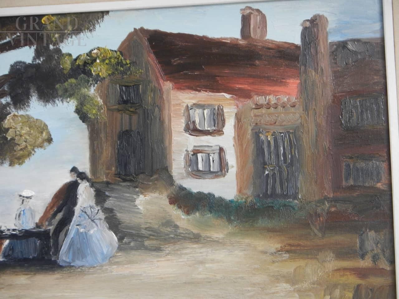 Dipinto con casa di campagna e dame in giardino, di gusto barocco, olio su tela firmato Parolin, completo di doppia cornice.