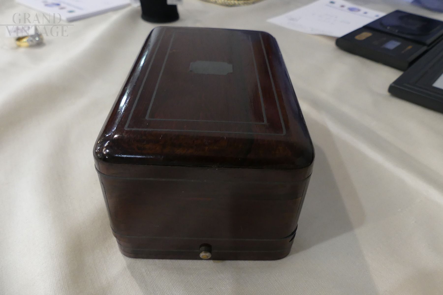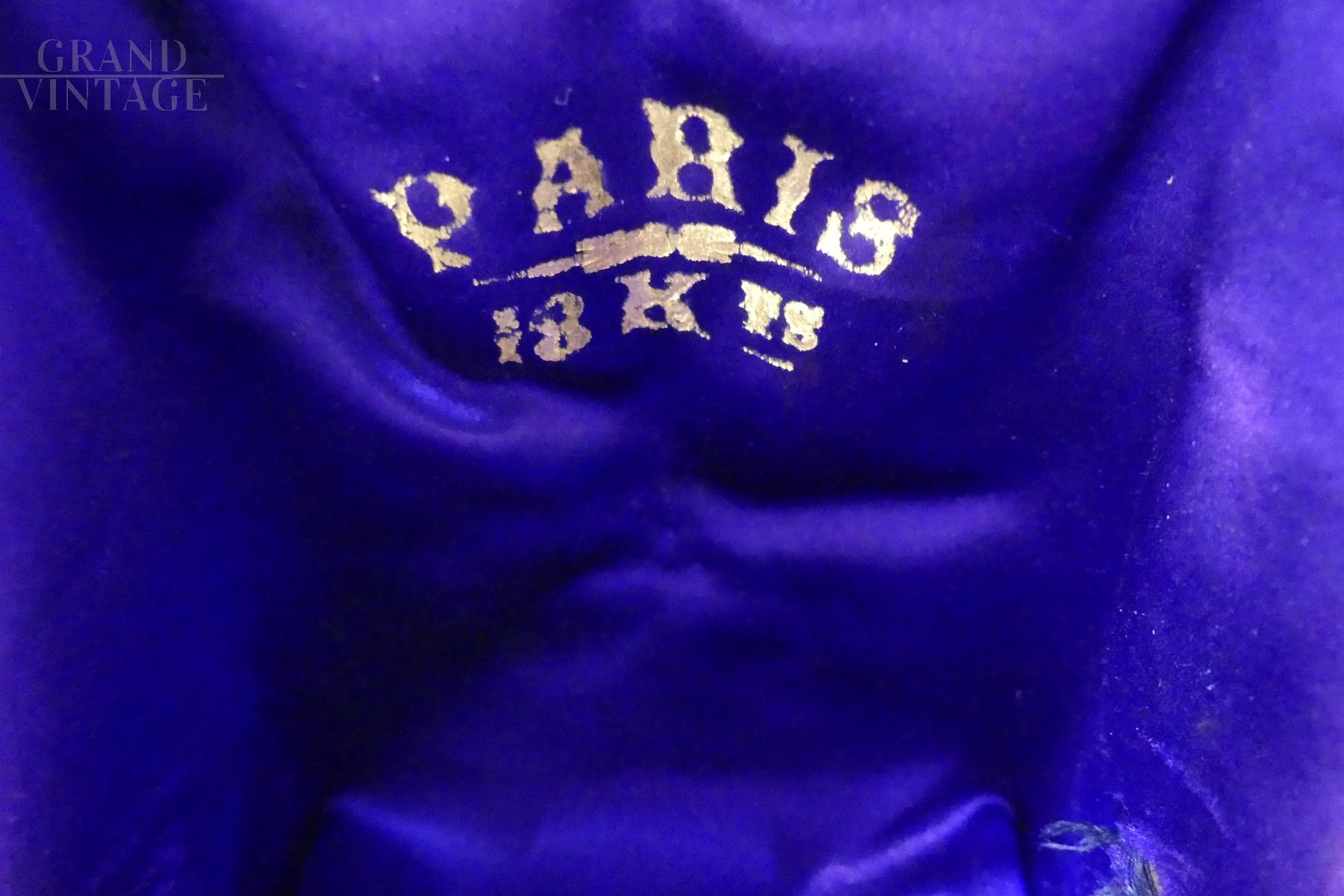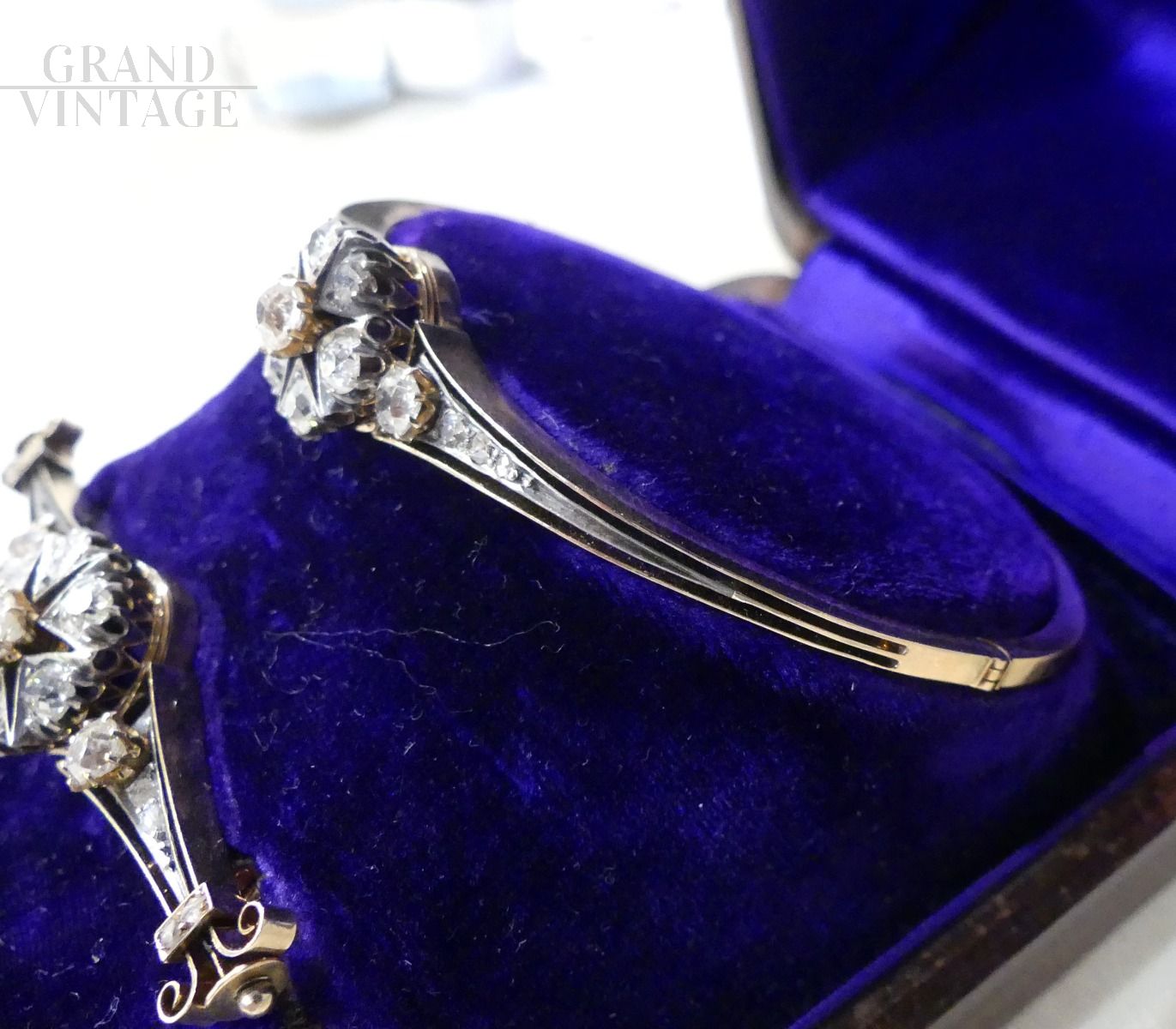 Parure antica di alta gioielleria francese di fine '800 composta da bracciale rigido, orecchini e spilla in oro e argento con diamanti di taglio vecchio. La parure è inserita nella sua scatola originale in legno di palissandro con profili in argento. La scatola riporta il marchio Richter, tipografia napoletana antica che stampava monete, e che chiuse nel 1910, a riprova dell'epoca di realizzazione. La parure è in condizioni quasi perfette!