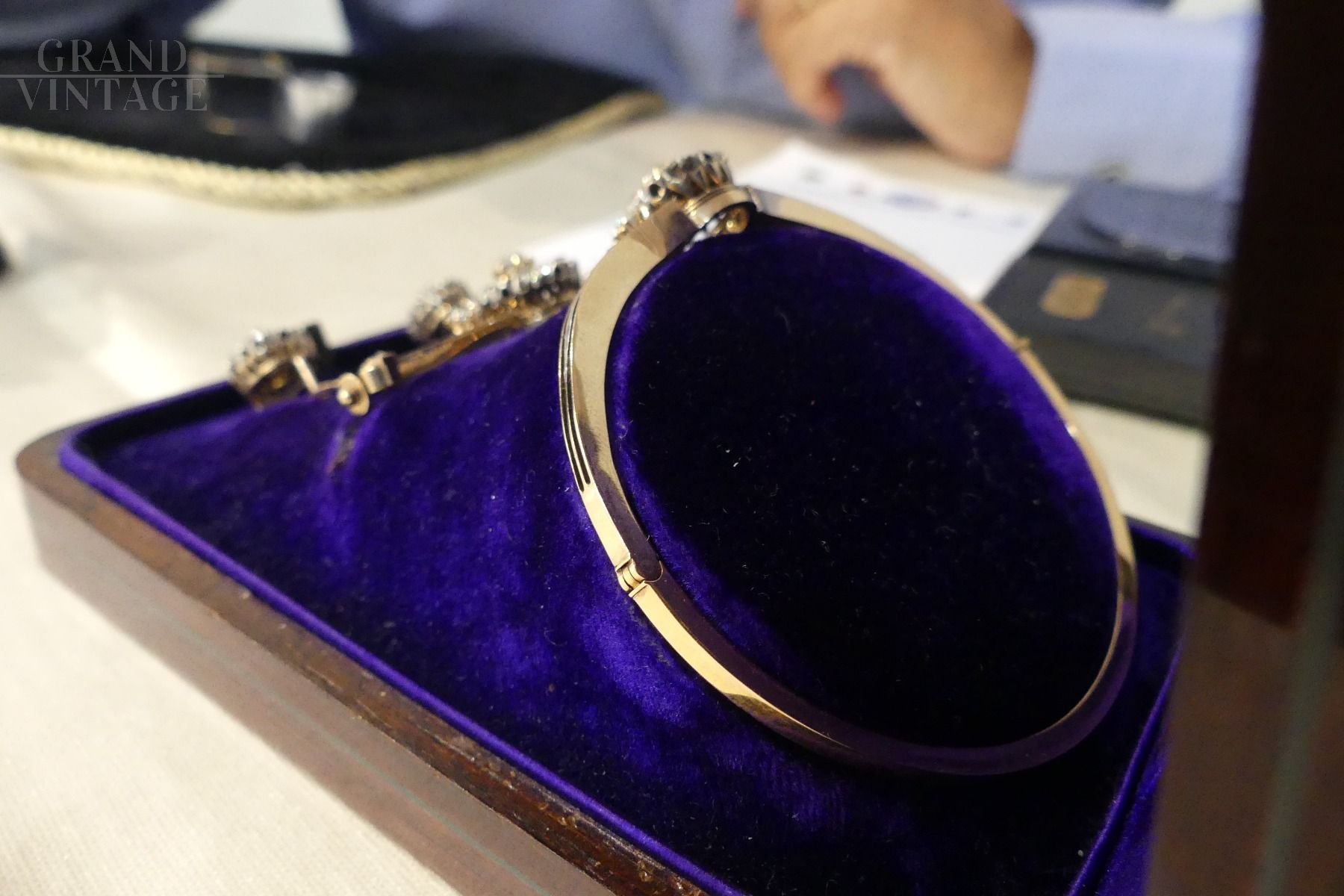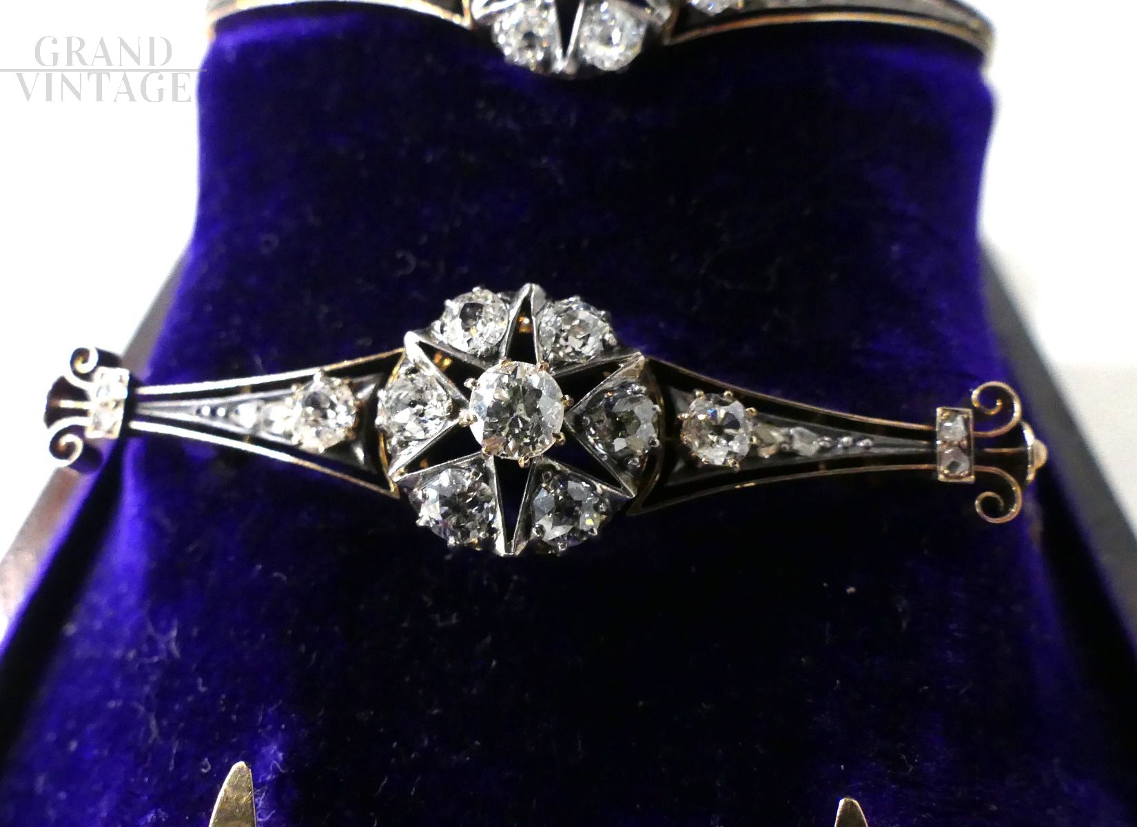 Parure dell'800 con bracciale, spilla e orecchini in oro e argento con diamanti
