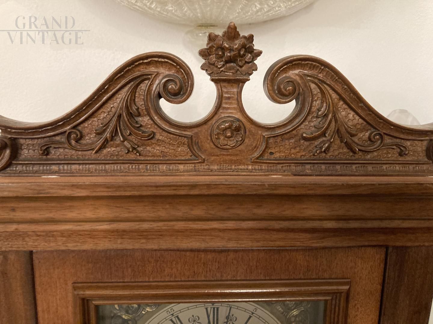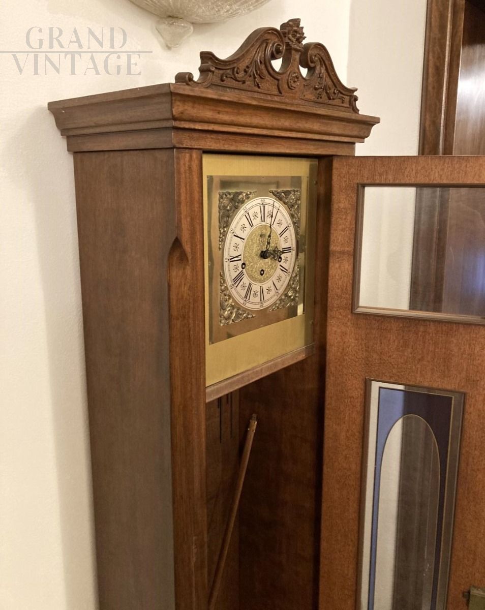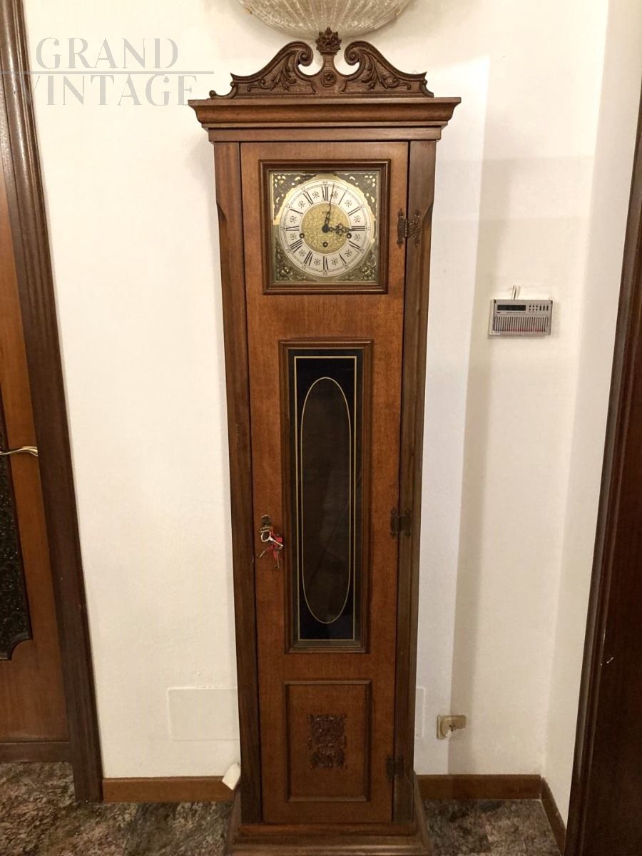 Pendolo a colonna vintage anni '60 in legno intagliato, con anta in vetro e particolari ottonati, in buone condizioni, i pendoli sono staccati, andrebbero sistemari e calibrati.