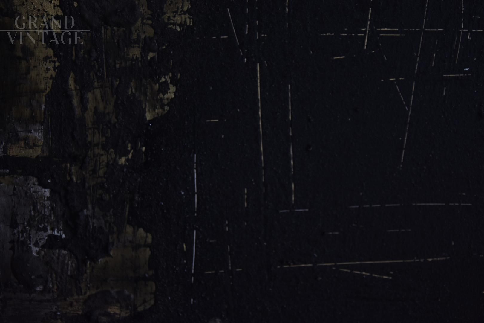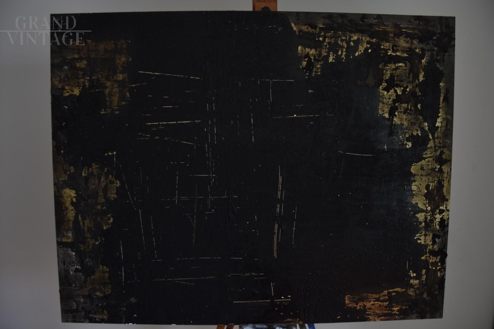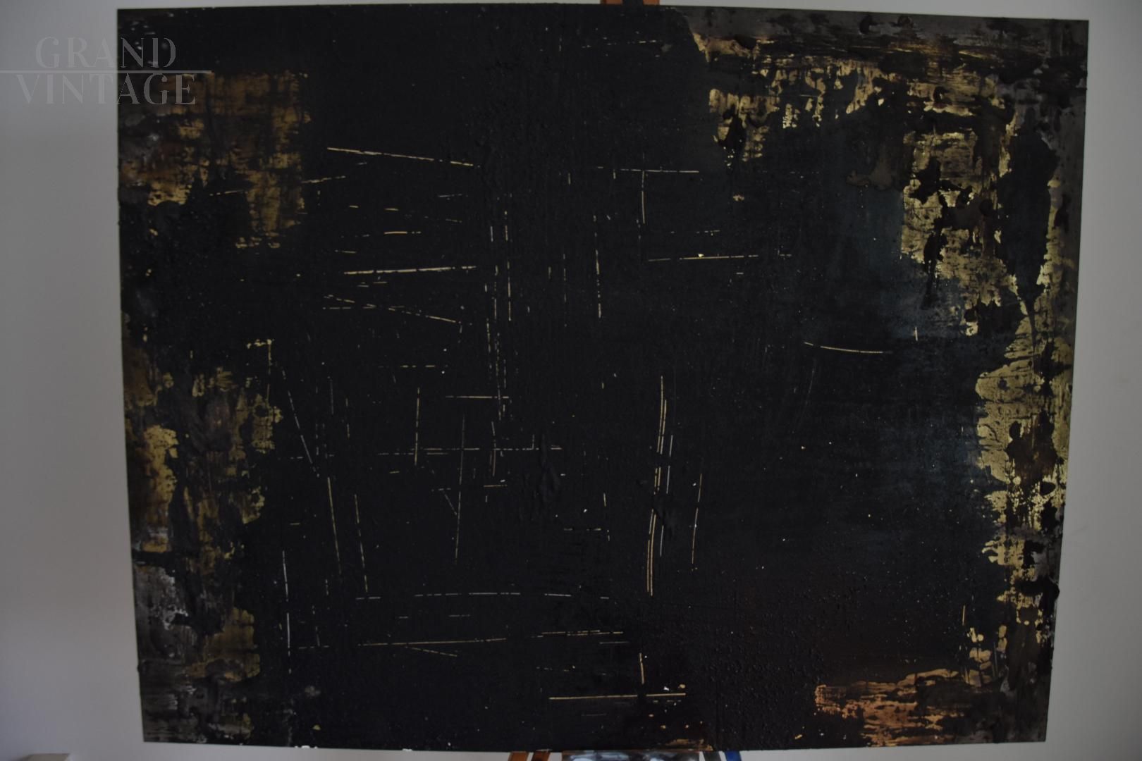 Dipinto astrattista realizzato dall’artista lombardo Andrea Busnelli (1989) con foglia d’oro, acrilico e sabbia su tavola nel 2018. Un'opera contemporanea ideale per ambienti moderni e di design. Una tavola dominata dal colore nero, espressione del petrolio, l’oro liquido di questa società attuale, il cui materiale, vere e proprie foglie d’oro, si rivela pian piano agli occhi dello spettatore grazie alla visionaria creatività dell’artista. Dipinto munito di certificato di originalità firmato dall’artista.