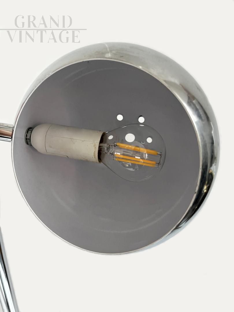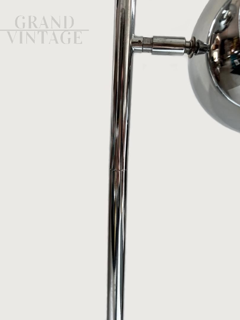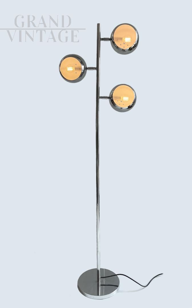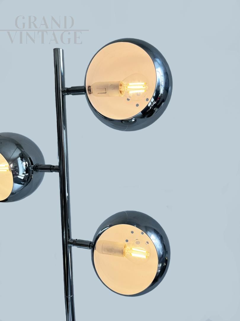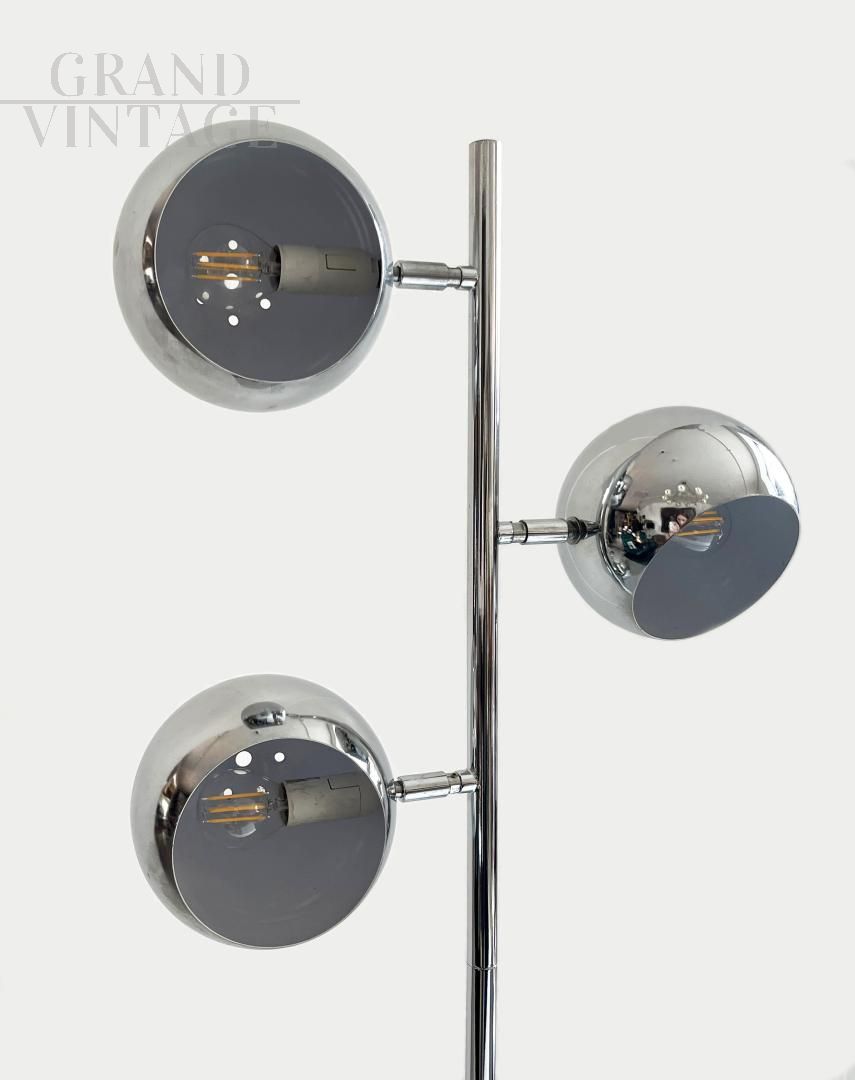 Elegante lampada da terra design in stile Reggiani anni '70 interamente in acciaio con tre punti luce a sfera direzionabili, modernariato italiano.