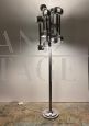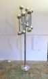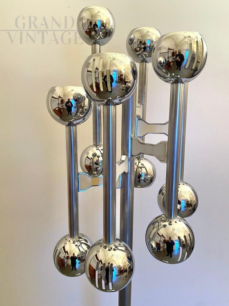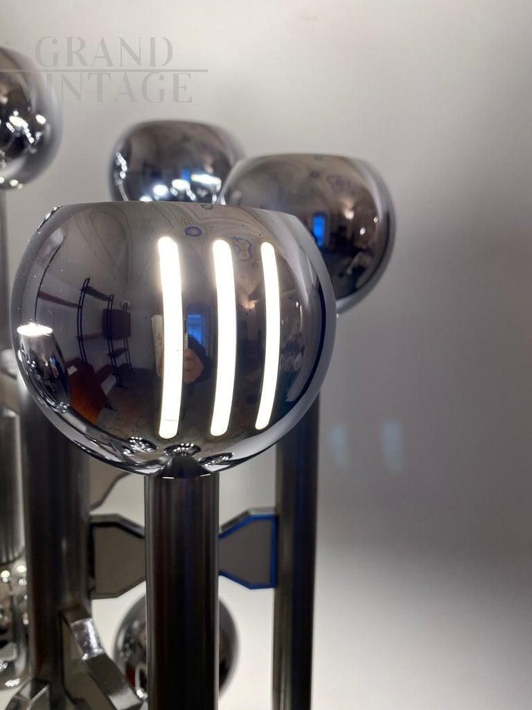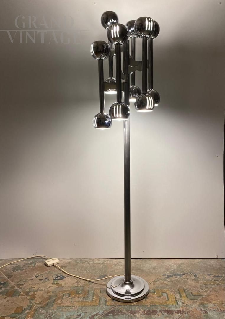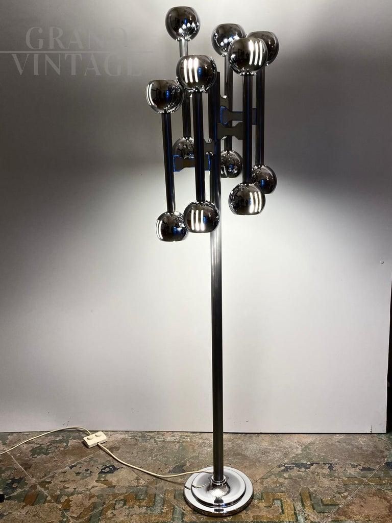 Lampada da terra cromata vintage in stile Space Age realizzata in Italia negli anni '70 nello stile di Gaetano Sciolari. Una lampada da terra vintage color argento a 12 luci con dettagli strutturati e raffinati in acciaio cromato. Articolo di design Space Age degli anni '70 nello stile di Sciolari. La struttura cromata è stata lucidata insieme a un controllo completo delle parti elettriche. In eccellenti condizioni con solo pochi piccoli segni del tempo su struttura e su base. Perfettamente funzionante.