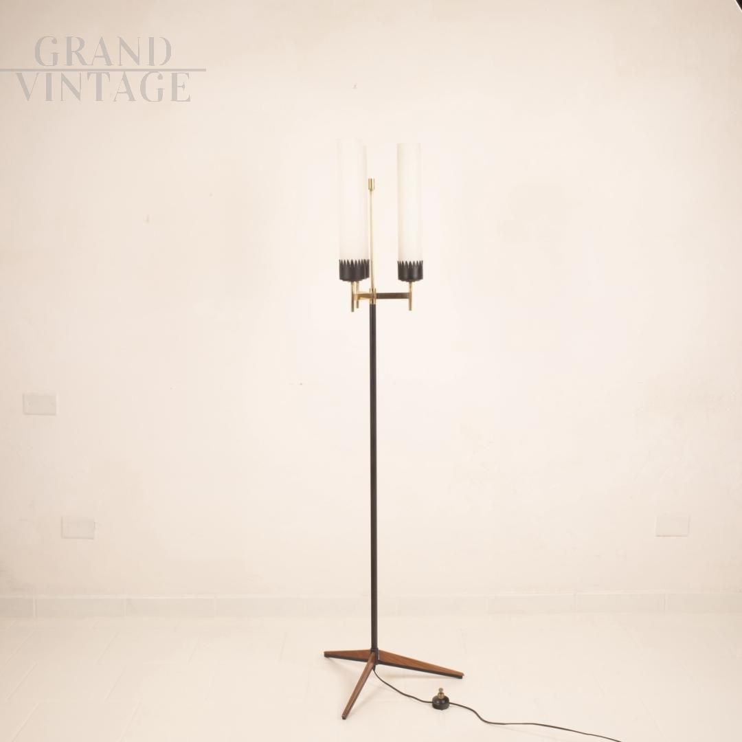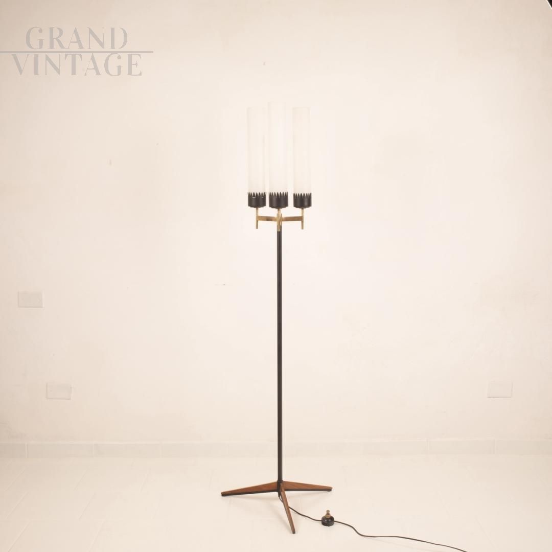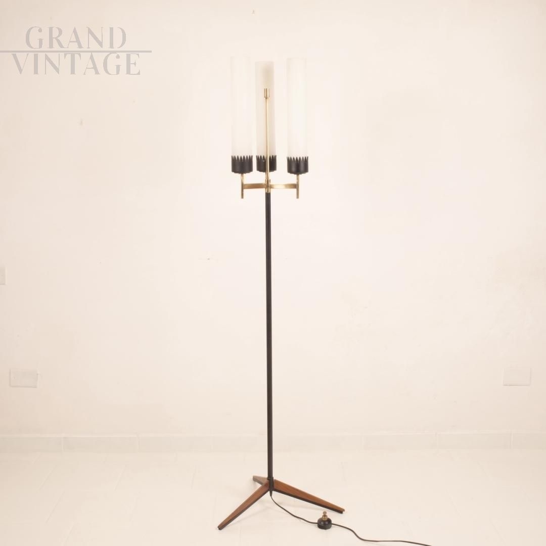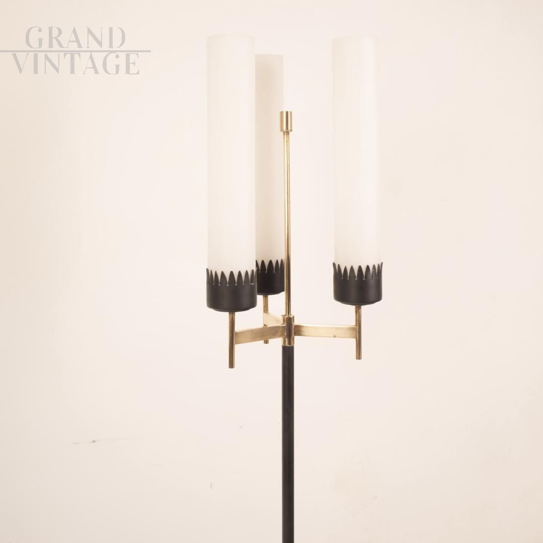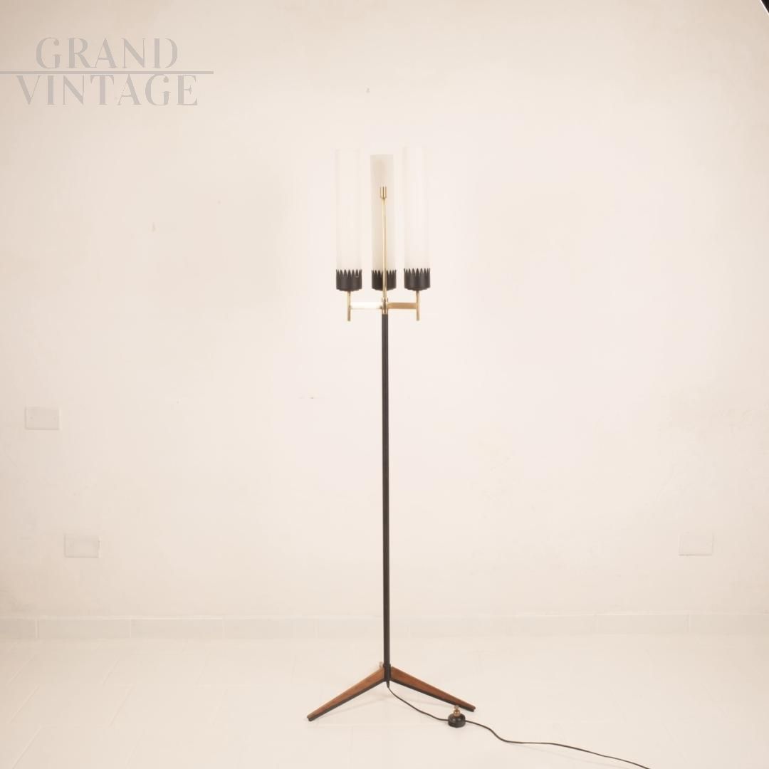 Piantana Stilnovo a tre luci della metà degli anni '50, md-century italiano, con struttura in ferro, legno e ottone massiccio e paralumi cilindrici in vetro opalino.