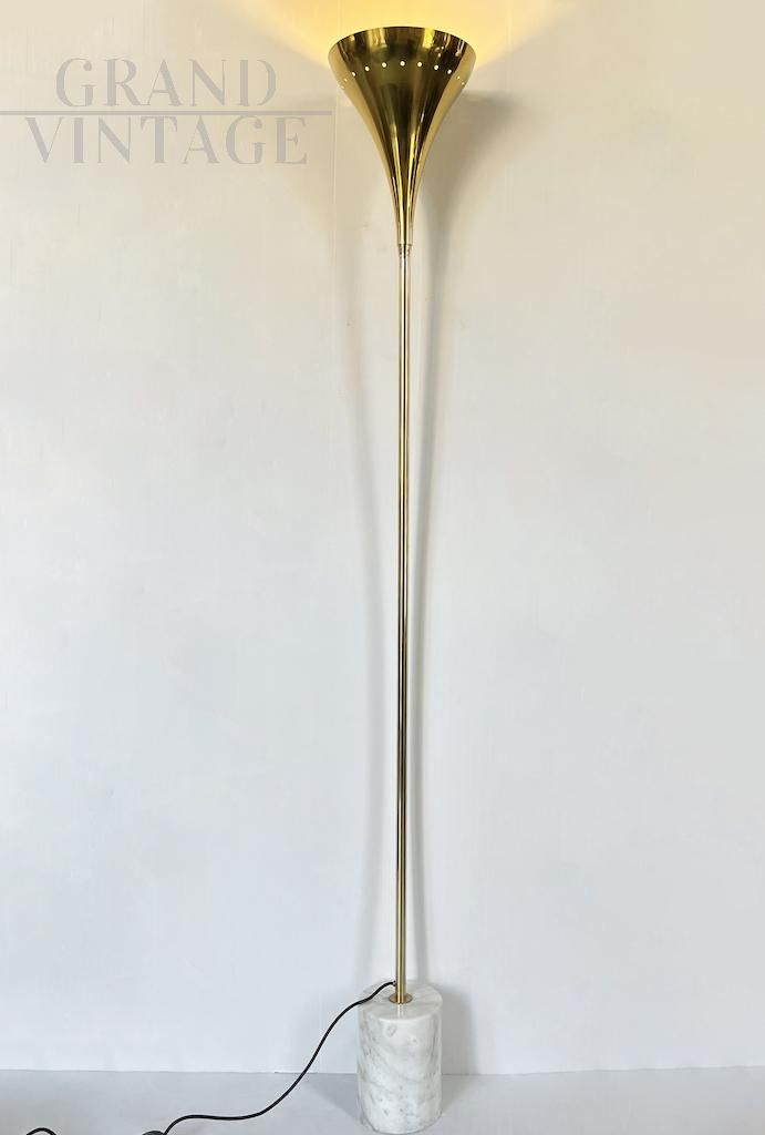 Elegante piantana vintage anni '70 interamente in ottone dorato con base in marmo bianco, di provenienza italiana.