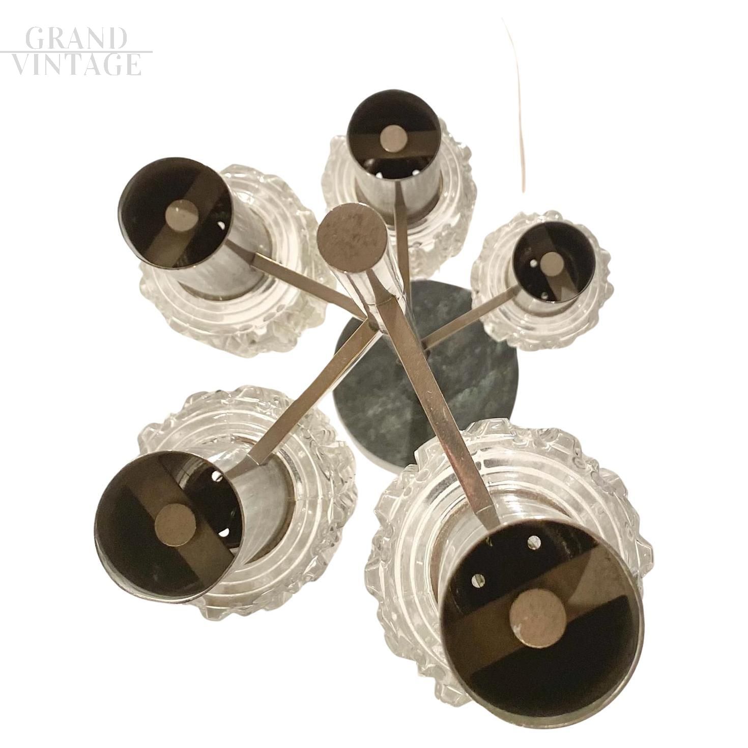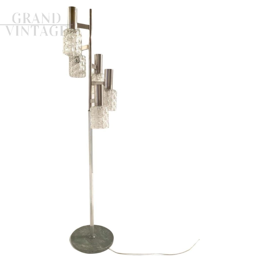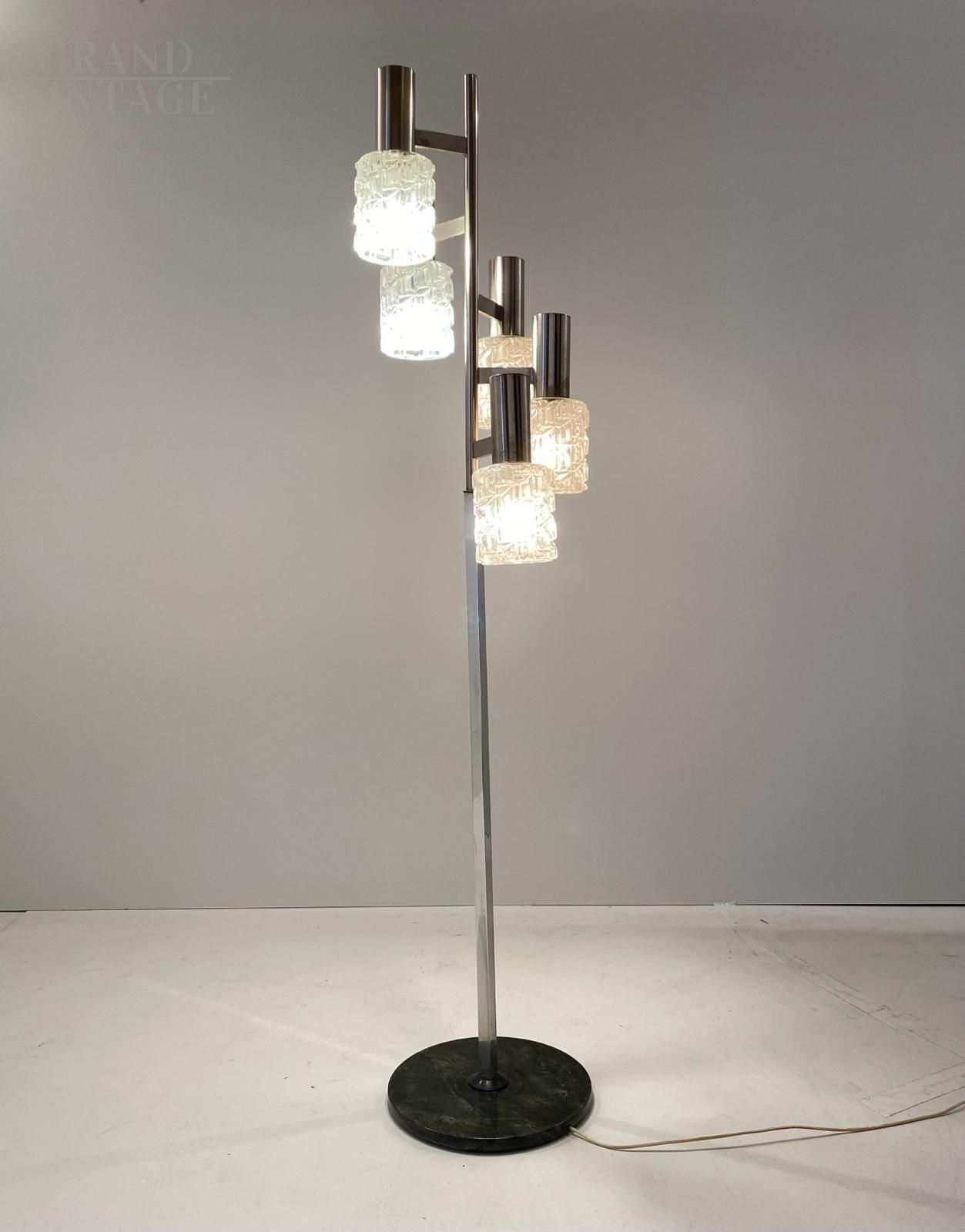 Piantana vintage degli anni '70 con struttura in acciaio, 5 luci con paralumi in vetro finemente lavorato e base in marmo. Parti elettriche revisionate, in condizioni molto buone con i naturali segni del tempo.