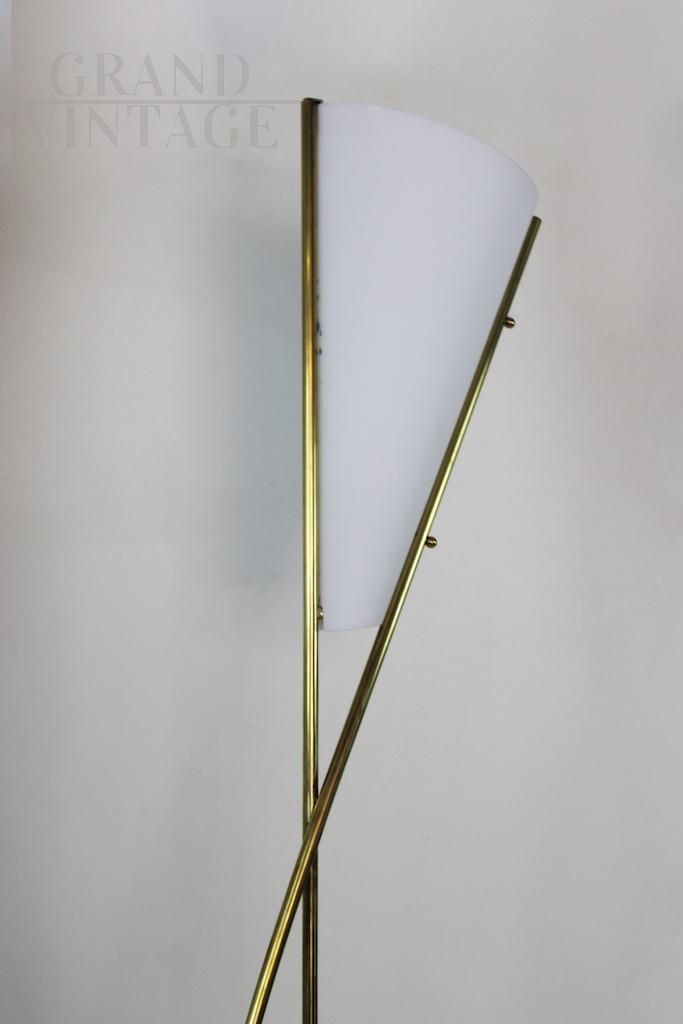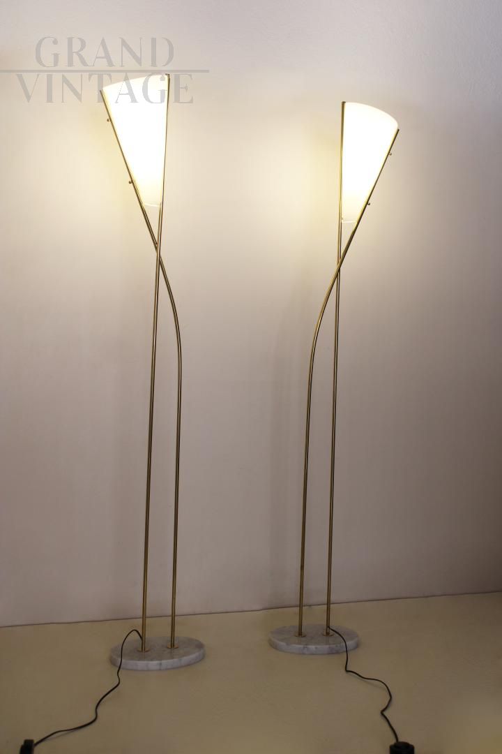 Elegante piantana vintage con base in marmo bianco, doppio stelo intrecciato in ottone e paralume a cono in vetro opalino bianco. Provenienza Italia anni '70, disponibile la coppia, il prezzo si riferisce al singolo pezzo.