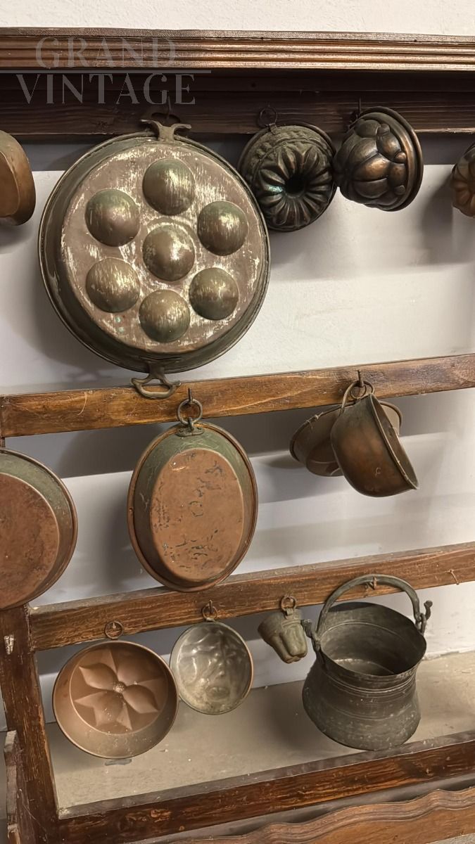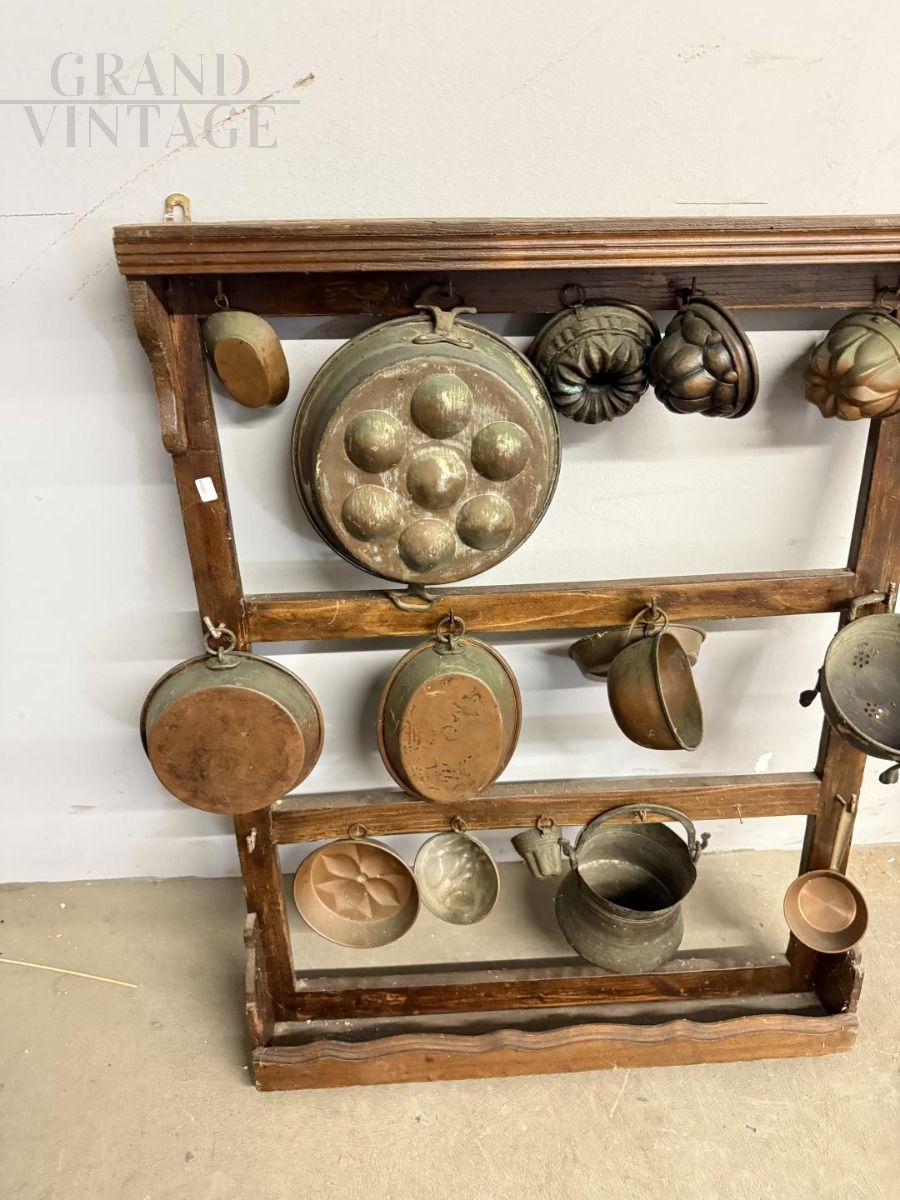 Piattaia ramaiola antica in legno con oggetti da cucina in rame per un totale di 15 pezzi, proveniente dall'Italia dei primi del '900. Misure: 93 x 70 cm.