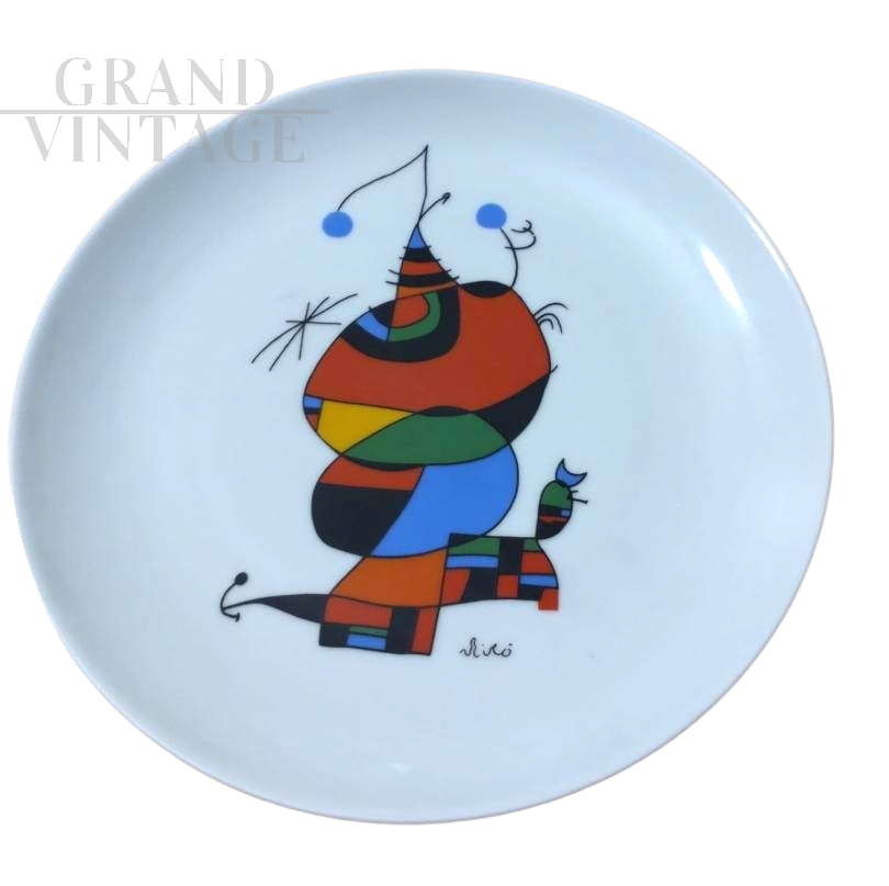 Stupendo piatto di porcellana da collezione con disegno dell'artista Joan Mirò dai tipici disegni e colori vividi, in edizione limitata, presenta il timbro con la firma dell'artista Joan Mirò e la data 1998, autorizzazione alla Successione Mirò. Diametro 21 cm.