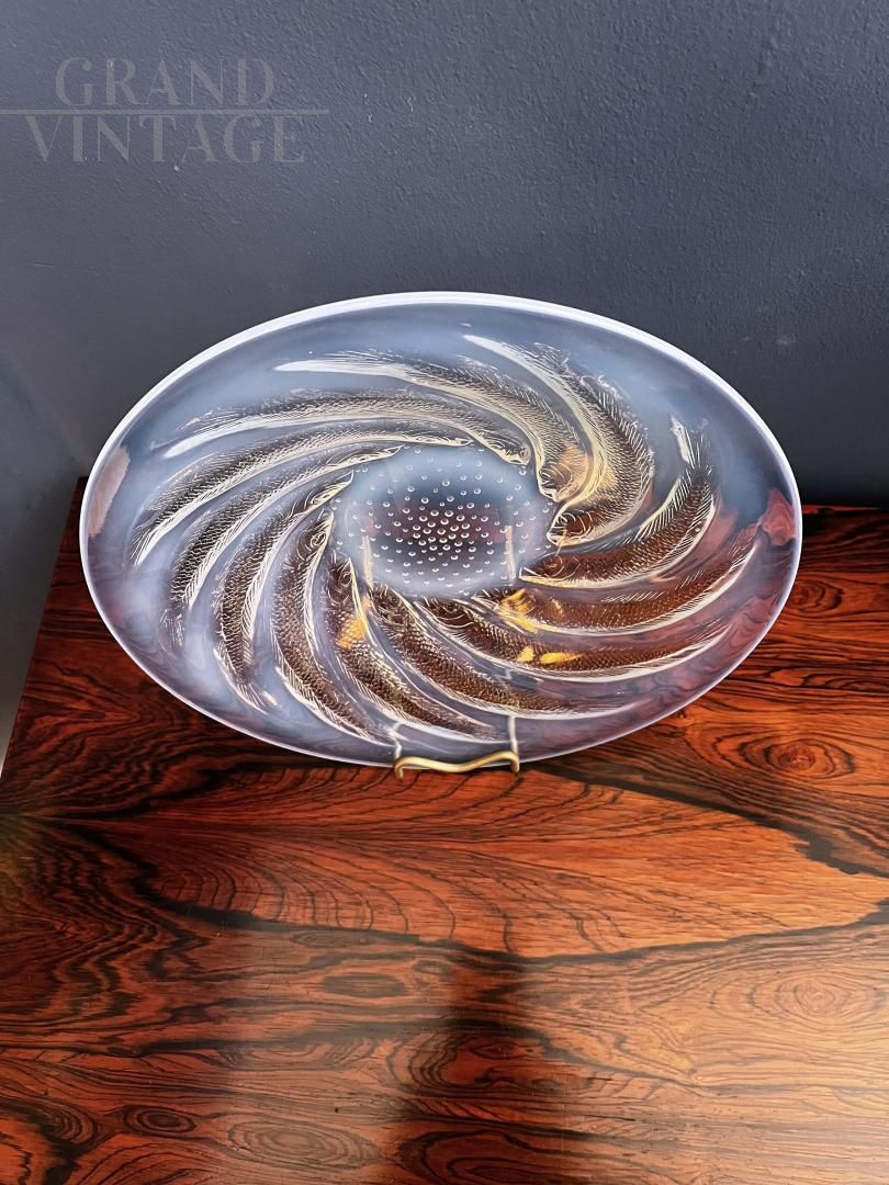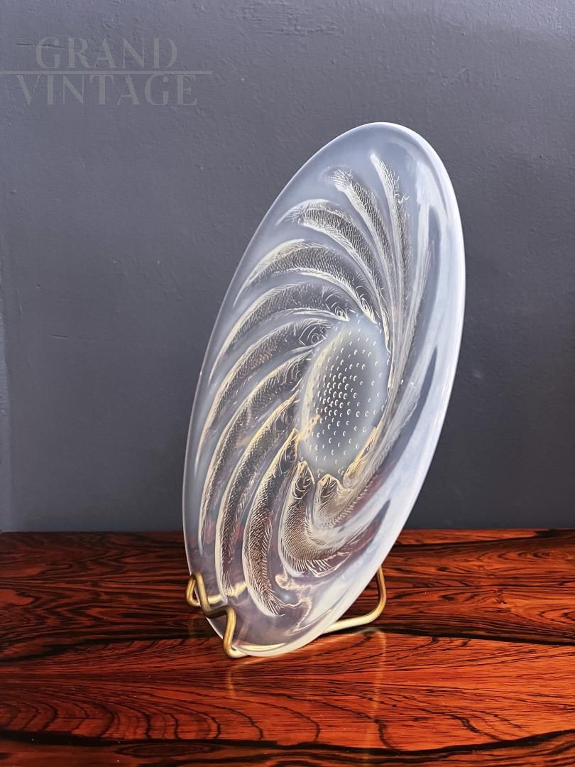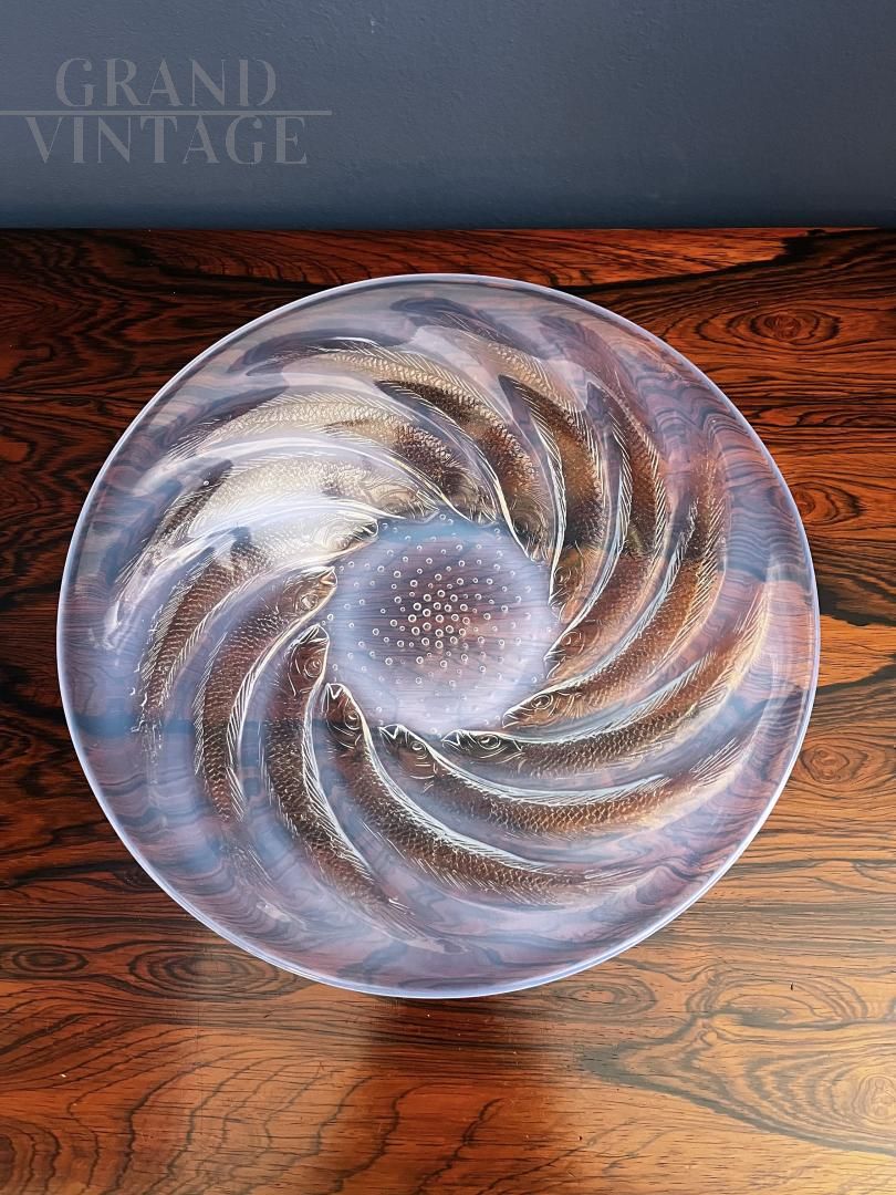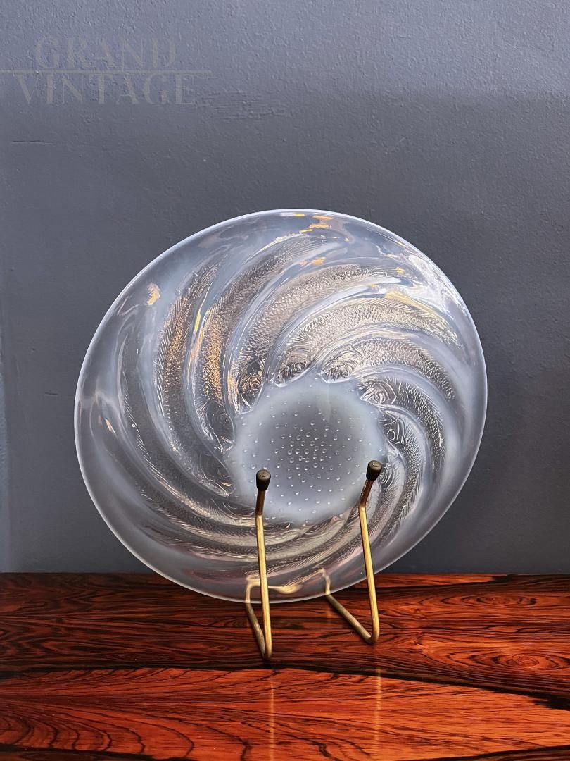 Piatto decorativo nello stile di Poissons di Rene Lalique realizzato in cristallo opalescente, attribuibile ma mancante di firma. Il piatto in questione infatti presenta lo stesso motivo del famoso piatto di Rene Lalique della serie "Poissons" raffigurante una spirale di pesci che si rincorrono.