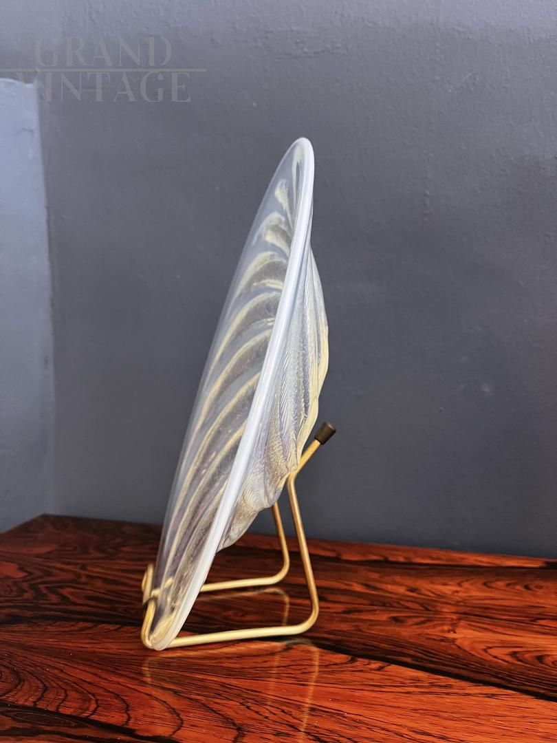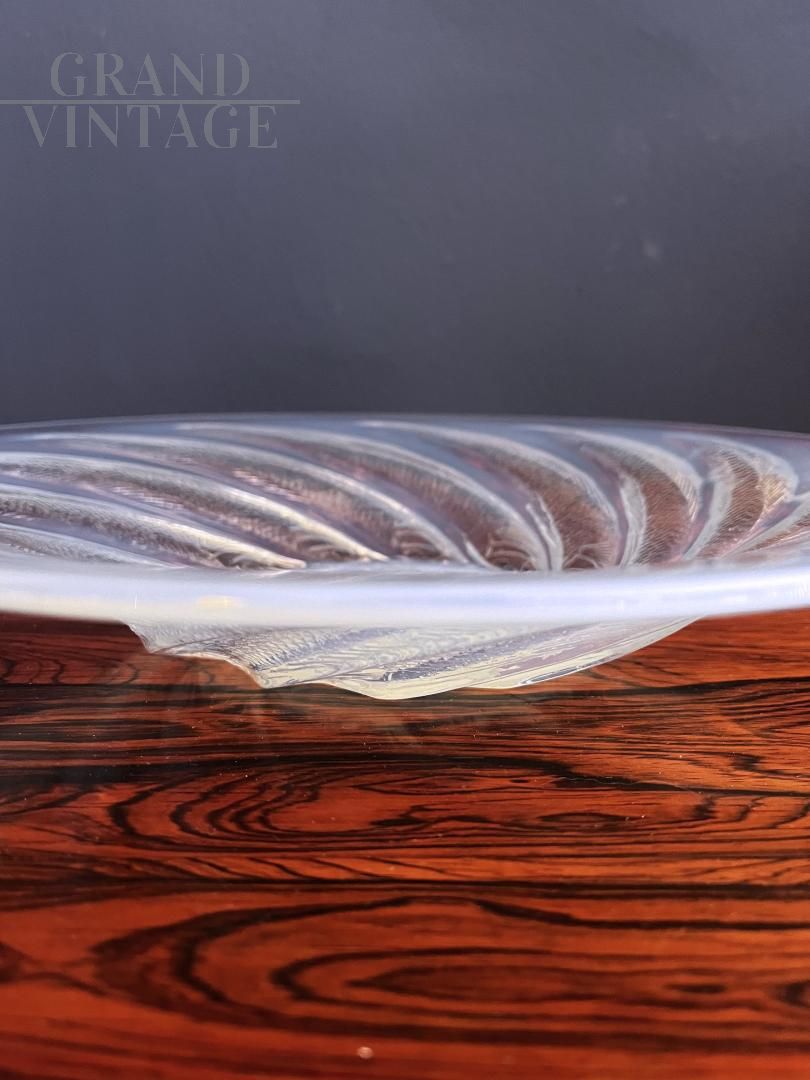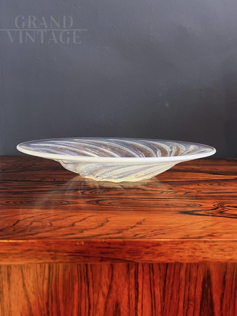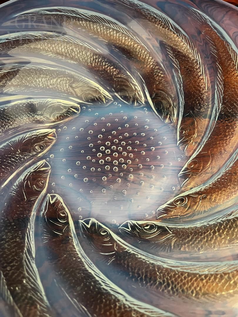 Piatto decorativo nello stile di Poissons di Rene Lalique realizzato in cristallo opalescente, attribuibile ma mancante di firma. Il piatto in questione infatti presenta lo stesso motivo del famoso piatto di Rene Lalique della serie "Poissons" raffigurante una spirale di pesci che si rincorrono.
