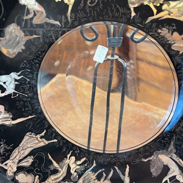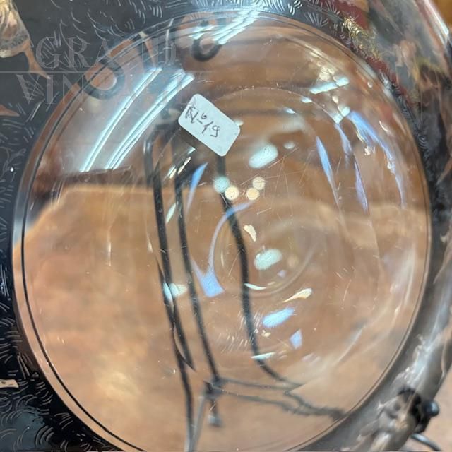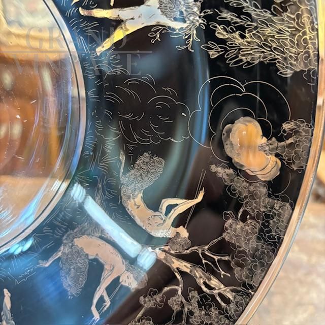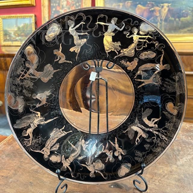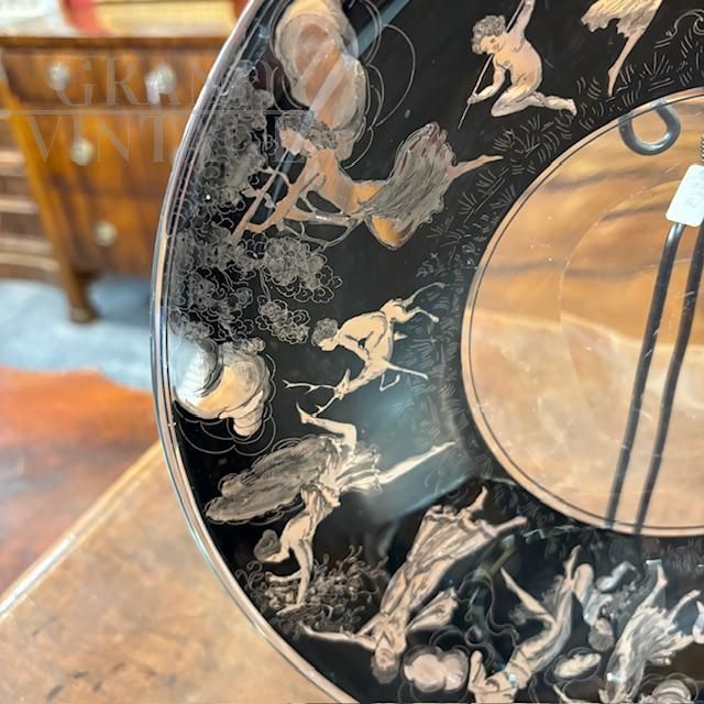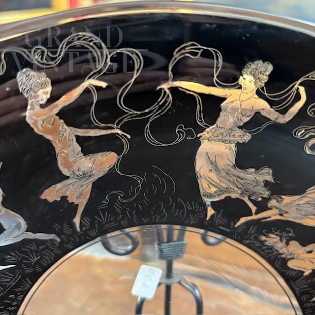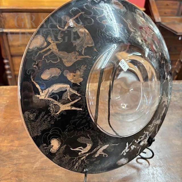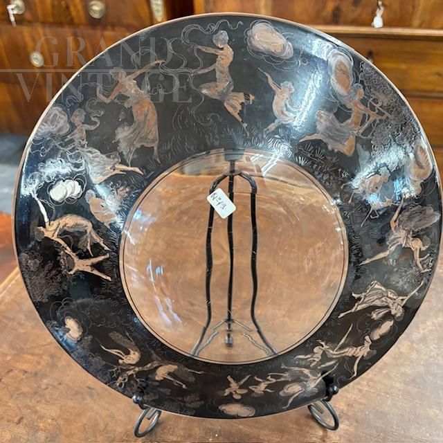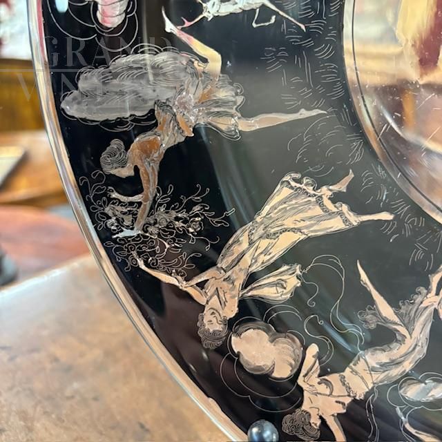 Piatto neoclassico Vedar anni '30 in vetro di Murano trasparente e nero, con splendide figure neoclassiche, Milano anni 30, firmato, in ottimo stato, un vero oggetto da collezione. Diametro 30 cm.