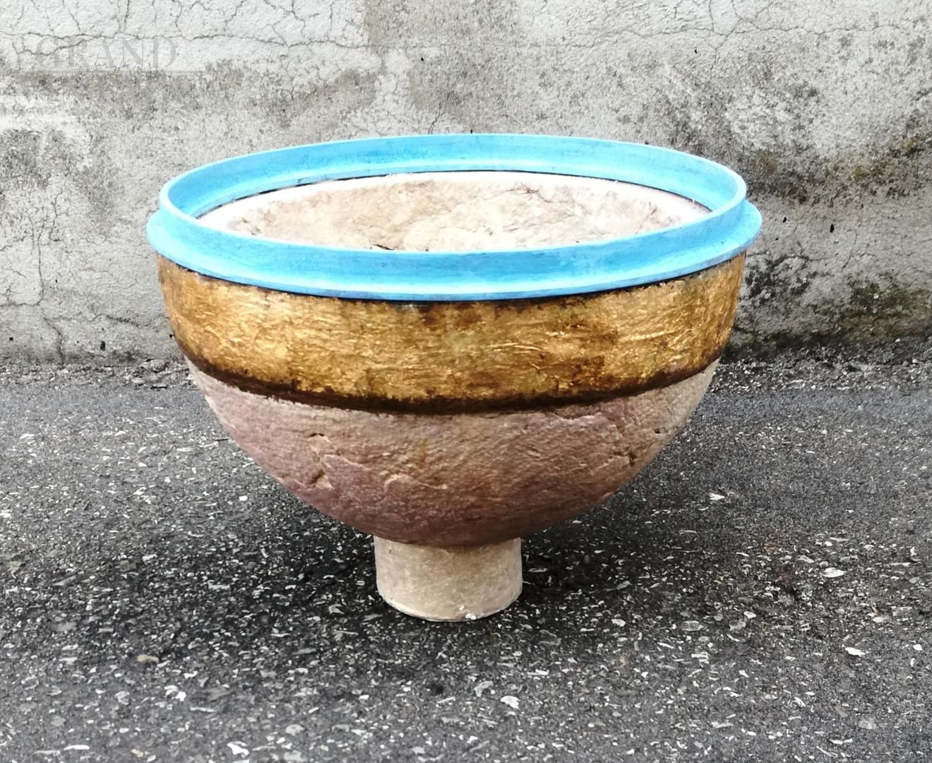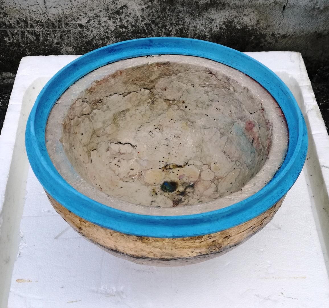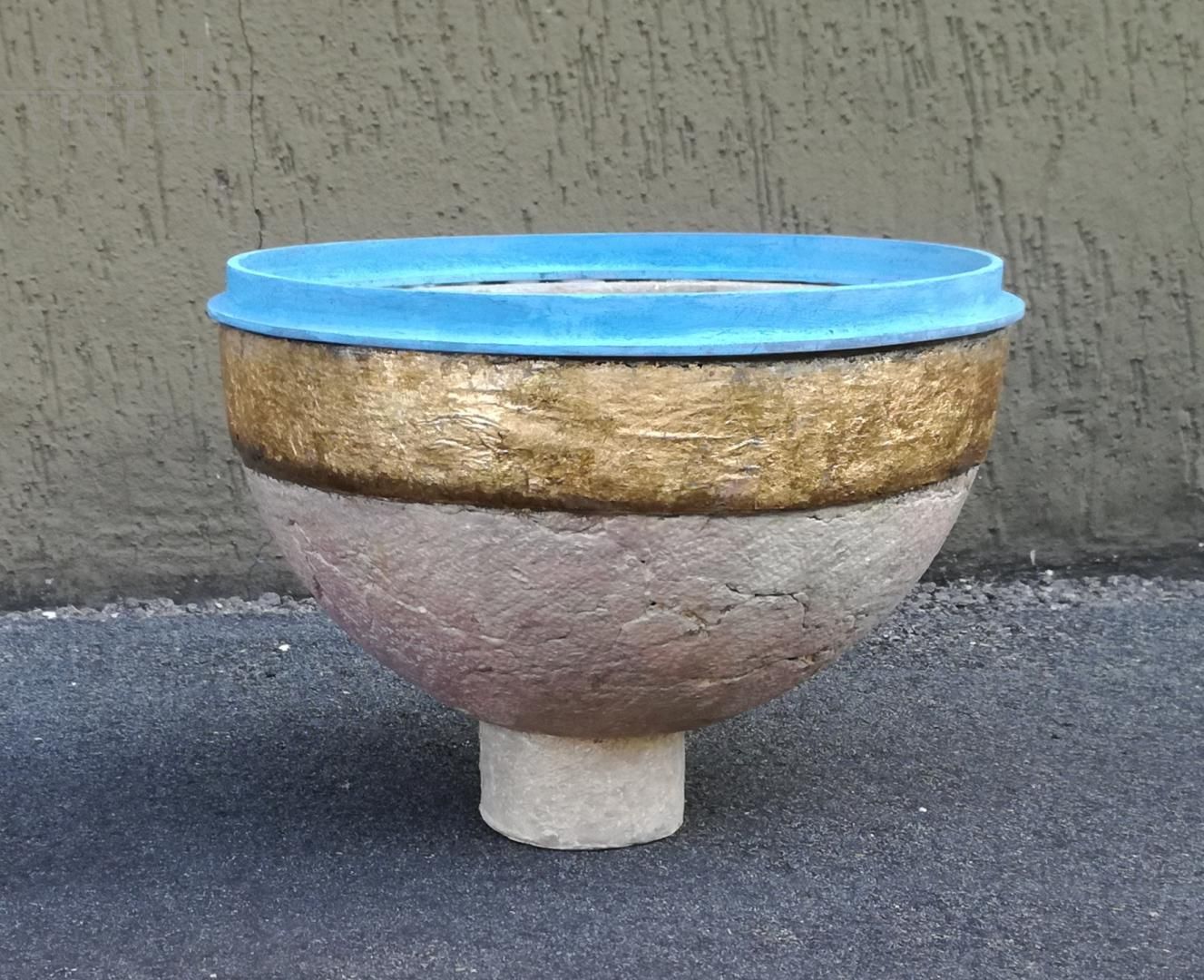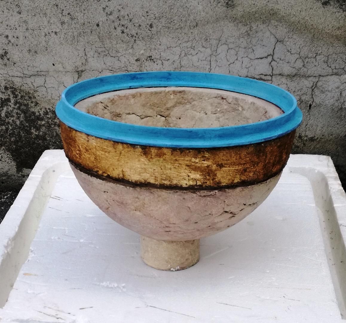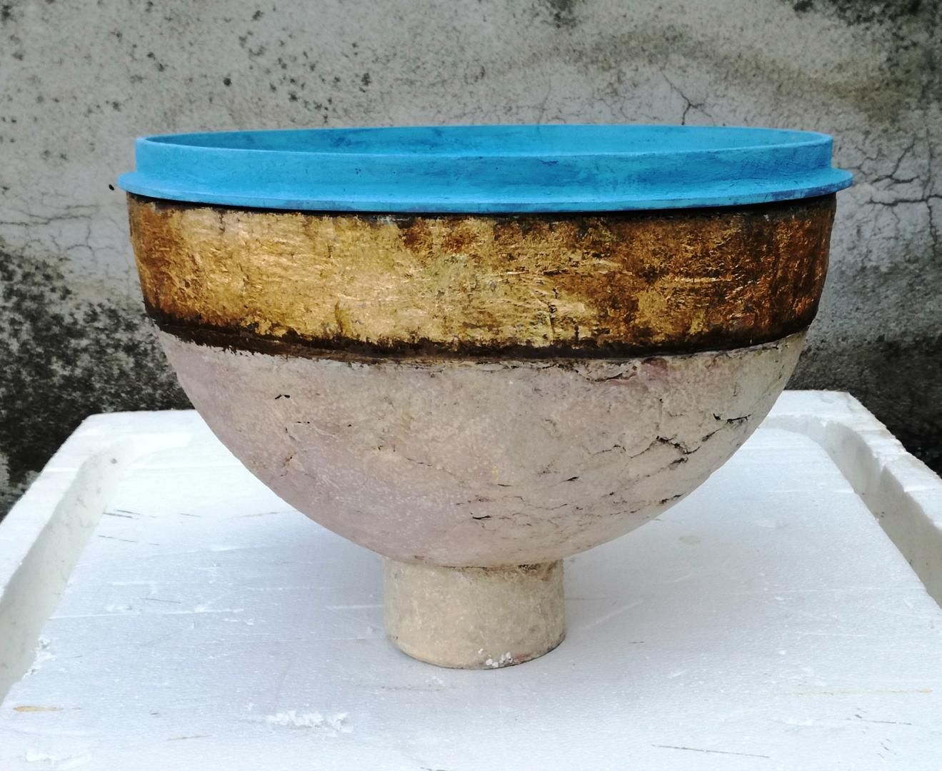 Piccola acquasantiera in pietra di Gerusalemme, originariamente sbeccata e rovinata, è stata trasformata in una scultura dal maestro Valter Berni, il cui intervento ha permesso di ricavarne un piccolo gioiello d'arte. La ciotola è decorata con foglia d'oro a rivestire il margine superiore, e presenta un anello di ferro verniciato di colore rame ossidato. La ciotola è molto pesante, pesa circa circa 6 kg. La base è un'aggiunta voluta dal Maestro Berni.