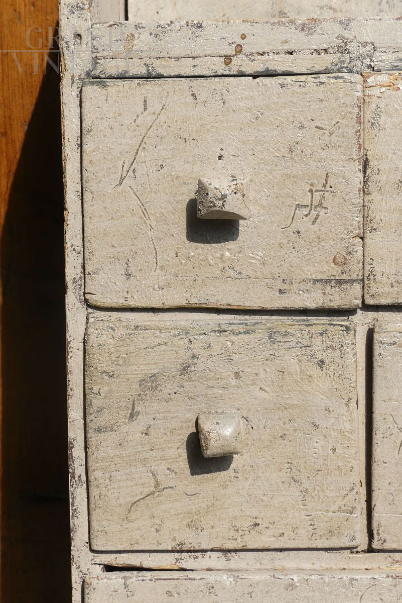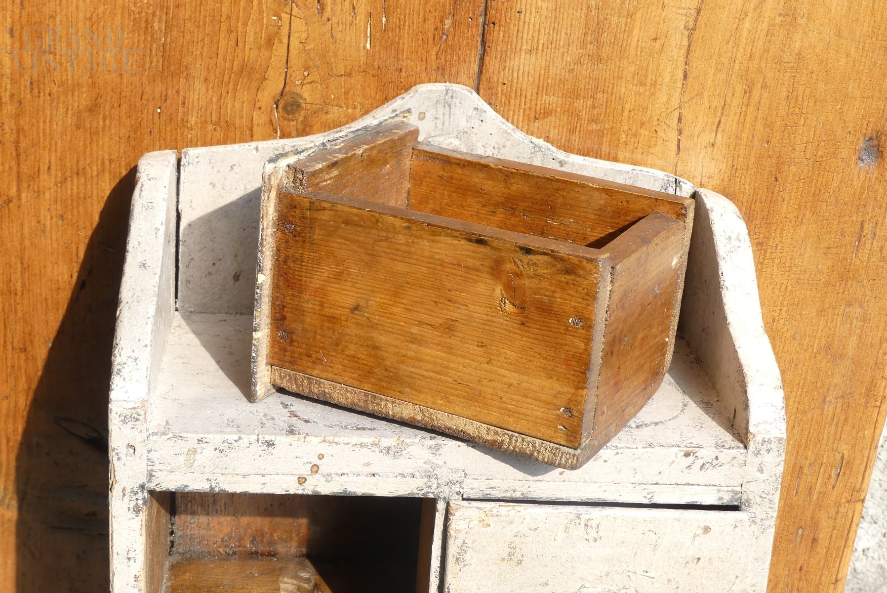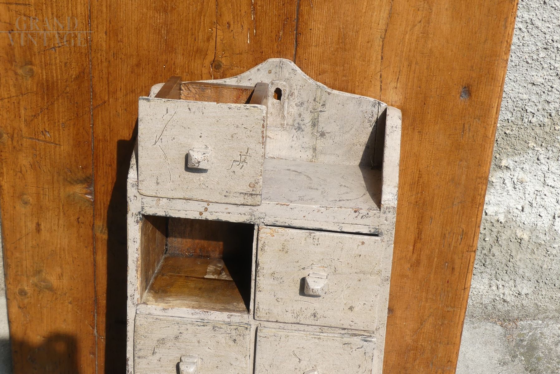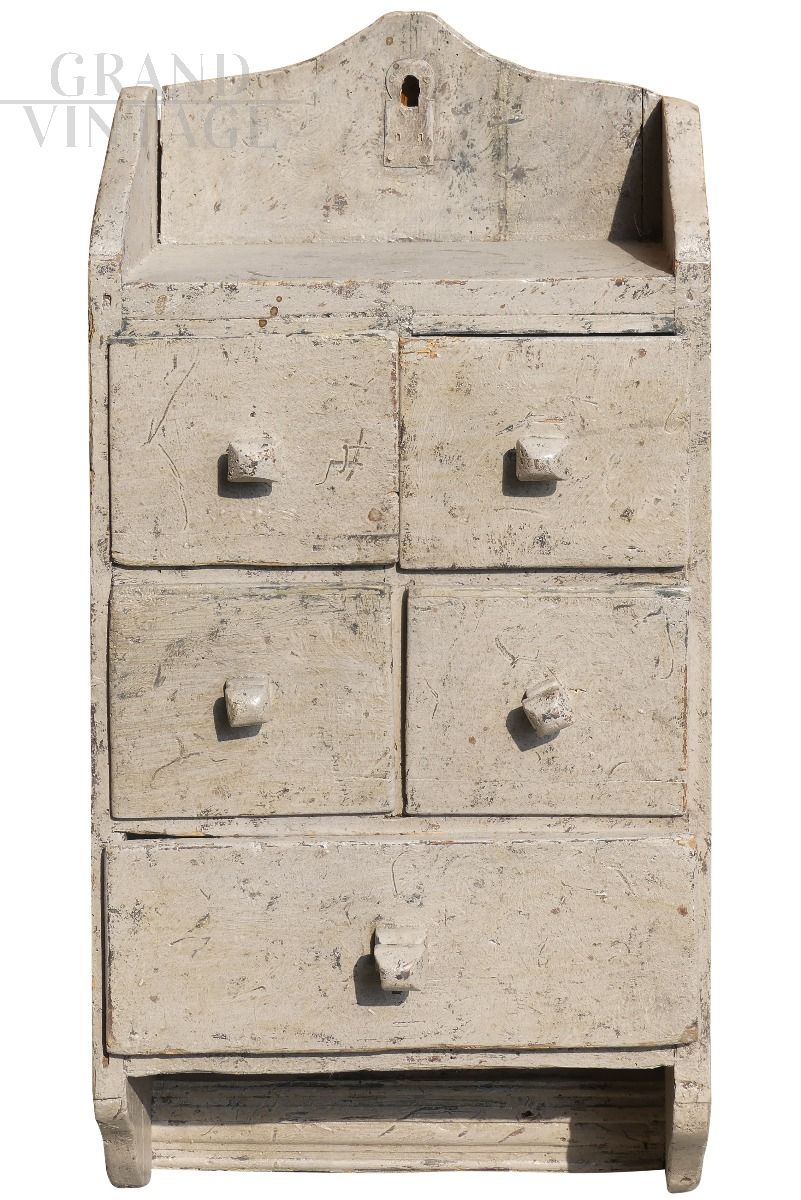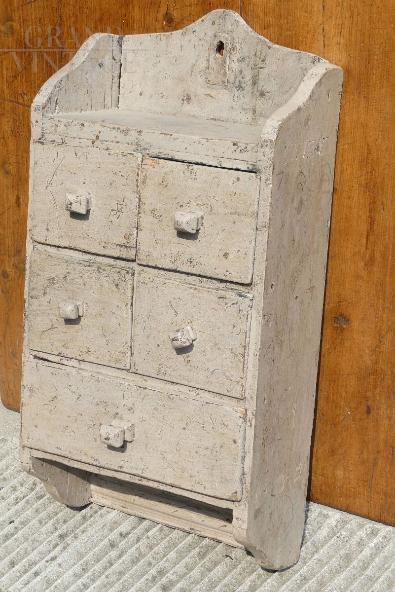 Cassettino pensile portaspezie dei primi del '900 costruito in legno di abete, con 4 cassetti piccoli ed uno grande.