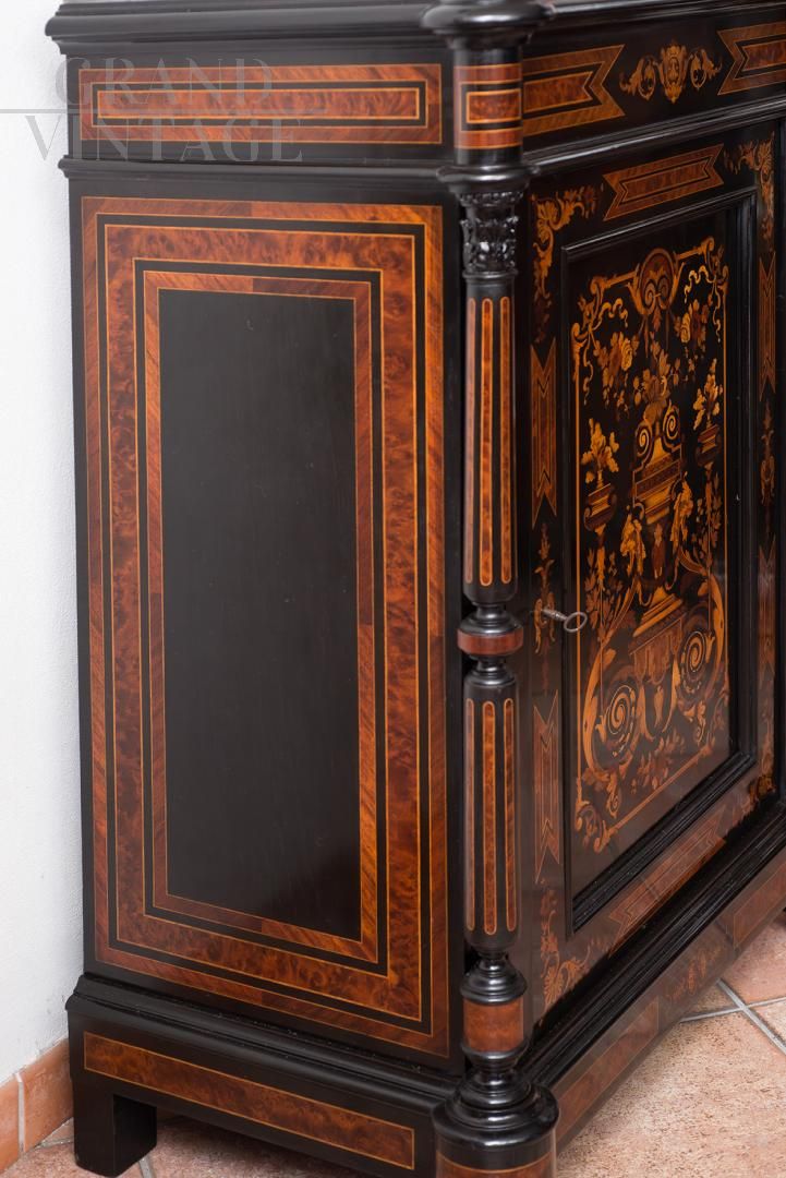 Piccola credenza antica Napoleone III Francese della seconda metà dell'800 in legni esotici pregiati con piano in marmo grigio bardiglio. Il fronte è caratterizzato da un'anta a battente con al centro un intarsio rappresentante un'anfora con fiori. Ad impreziosire i laterali vi sono due colonne scanalate terminanti con capitelli corinzi in legno scolpito. Internamente vi è una mensola regolabile, chiave e serratura sono originali dell'epoca.