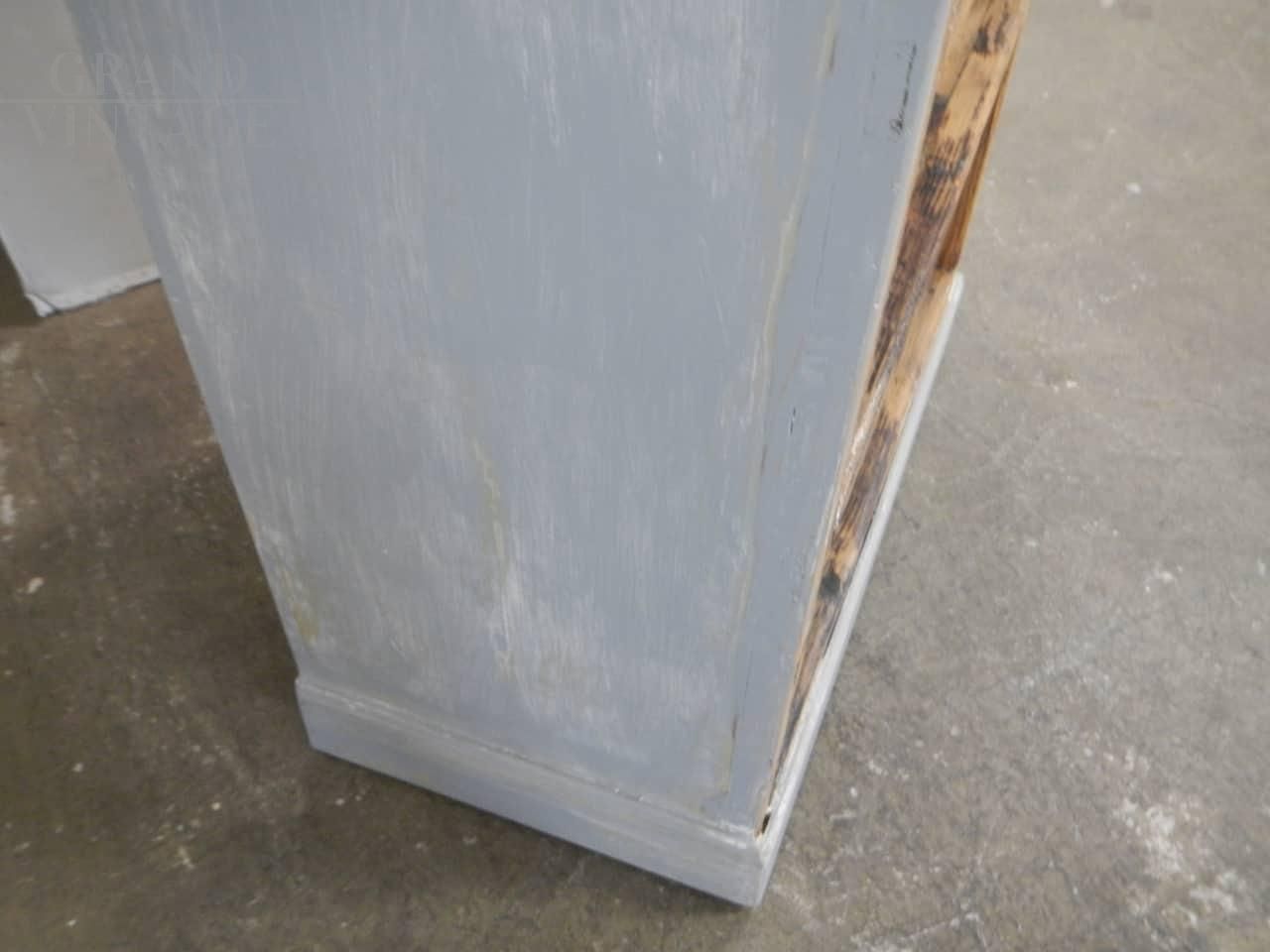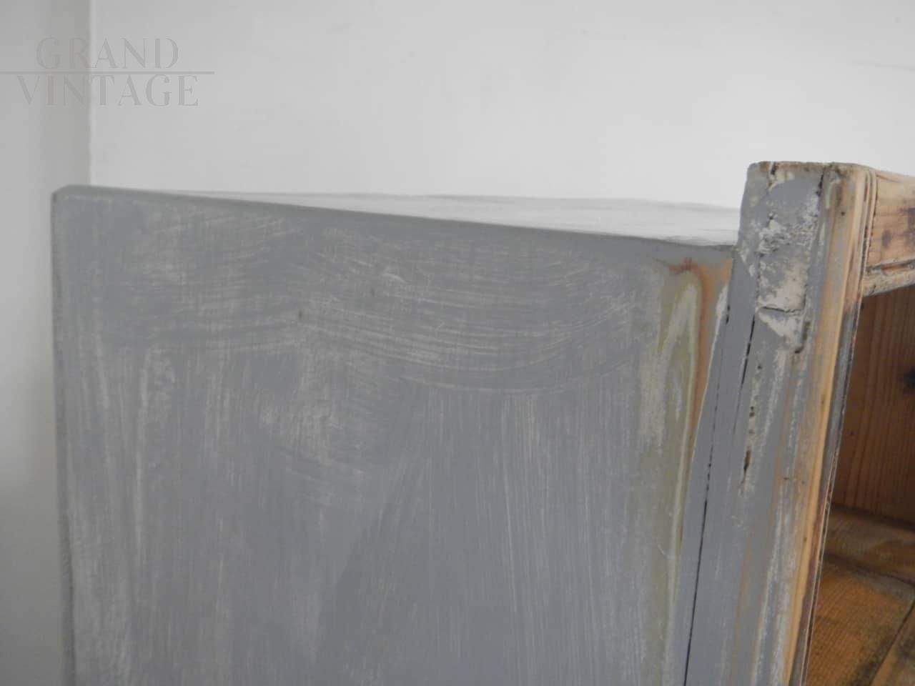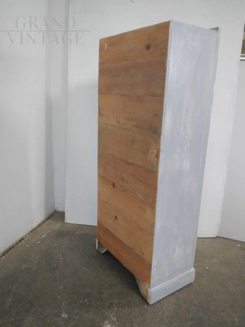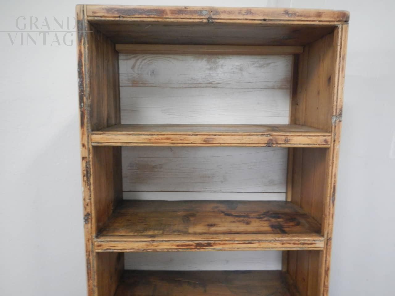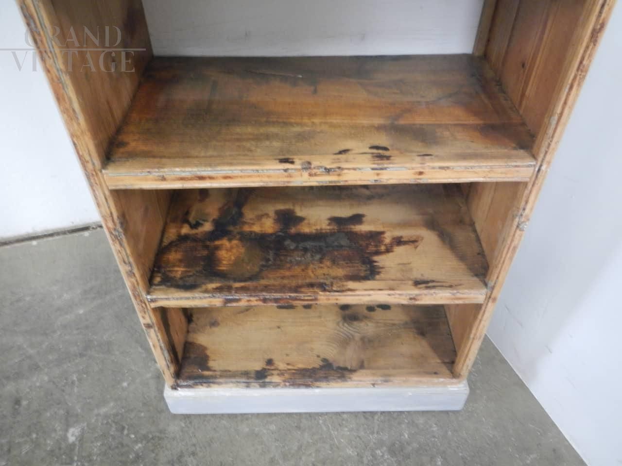Piccola libreria a giorno espositore o scaffale in stile rustico industriale in legno di abete esternamente laccato, dotata di 4 ripiani in legno naturale trattato con vernice. Lo spazio tra le mensole è di cm 24 - 26. In buone condizioni, parzialmente restaurato.