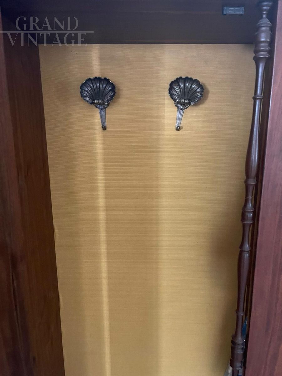 Armadio da ingresso a due ante in legno di palissandro, Italia anni '50, con interno foderato in stoffa gialla, completo di due appendiabiti decorati allinterno e di uno specchietto sull'anta.