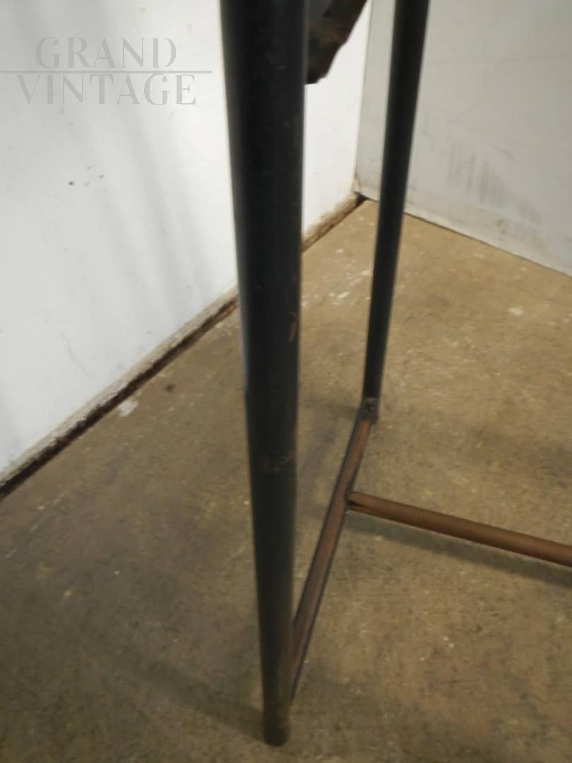 Banchetto da scuola vintage in legno compresso rivestito di formica verde, con struttura in ferro laccato nero. Presenta i naturali segni dell’uso.