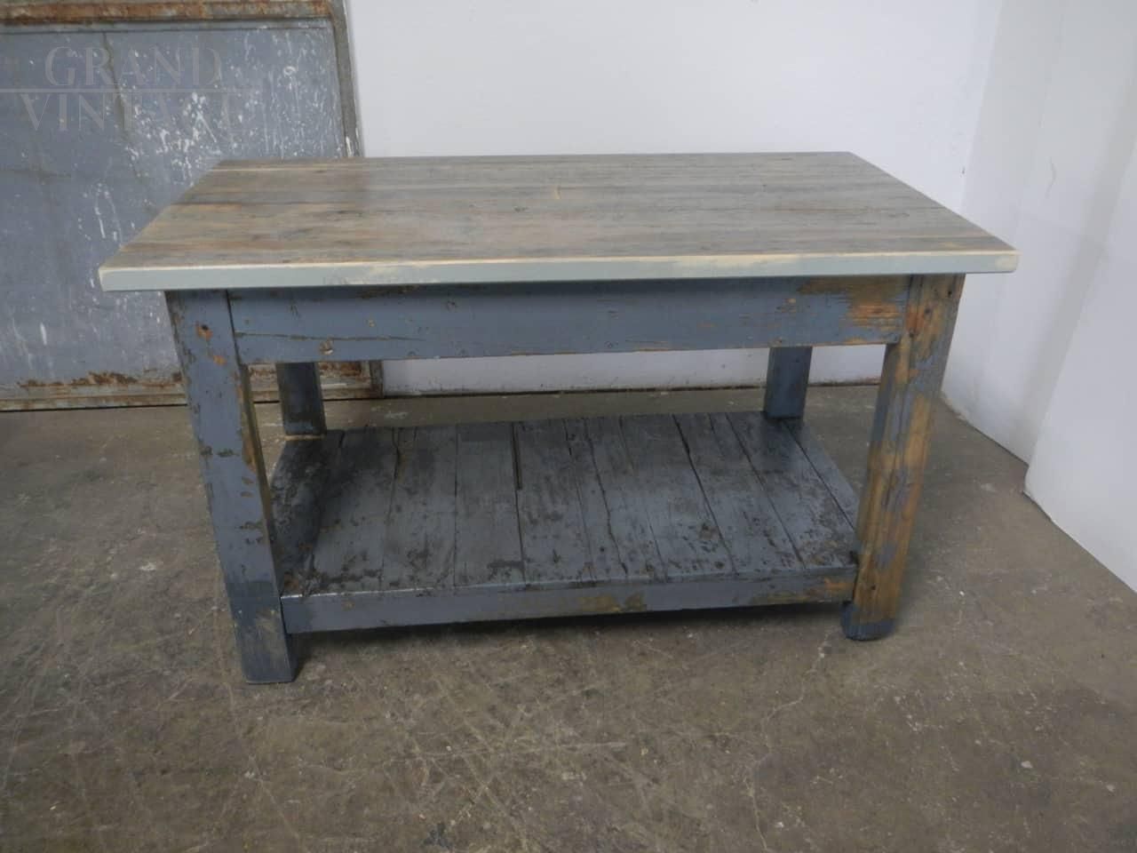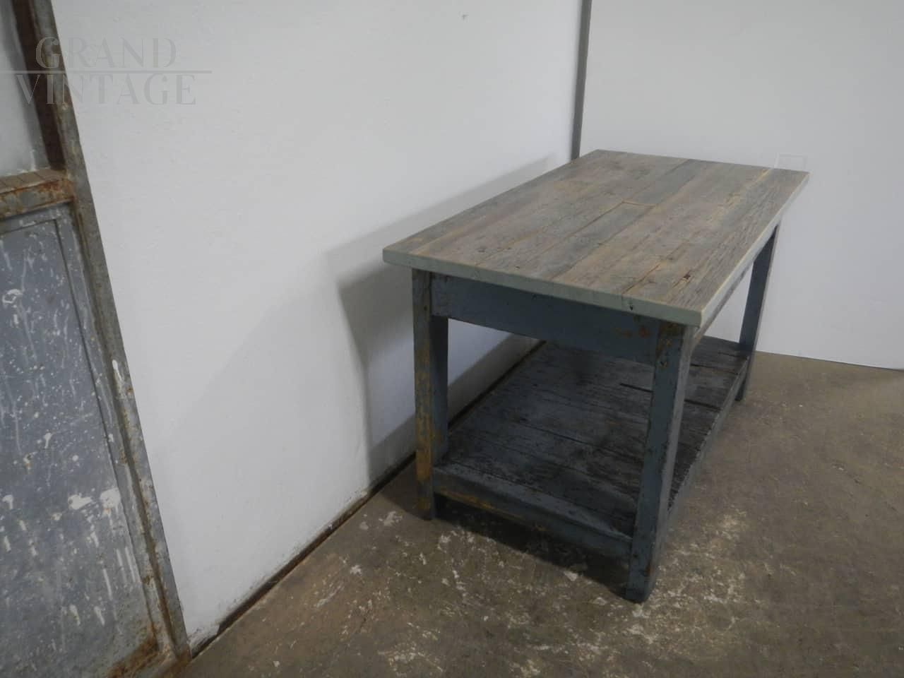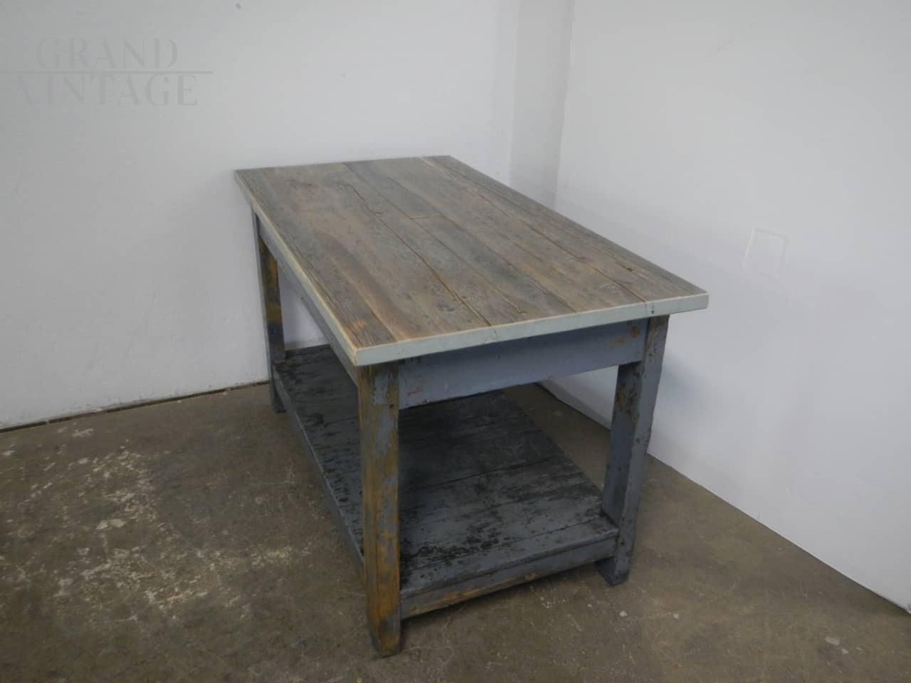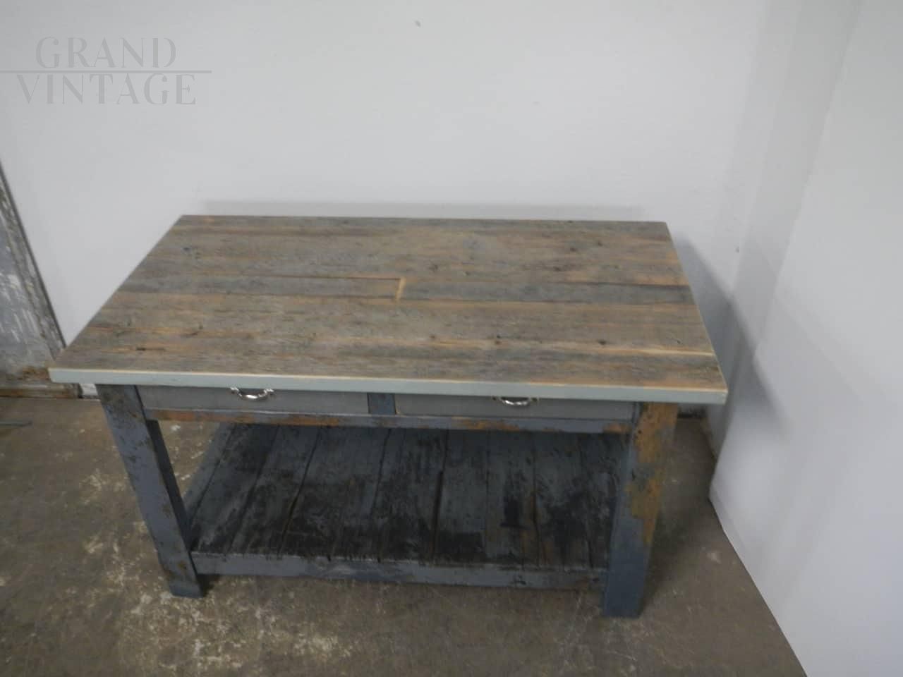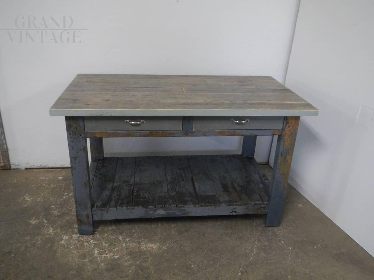 Piccolo bancone da negozio o da lavoro vintage industriale in legno di abete in pittura grigia, dotato di due cassetti di 52 x 46 x h 7 cm e di un sotto piano, restaurato con sostituzione piano e realizzazione cassetti. Lo spazio inferiore ha un'altezza di 47 cm.
