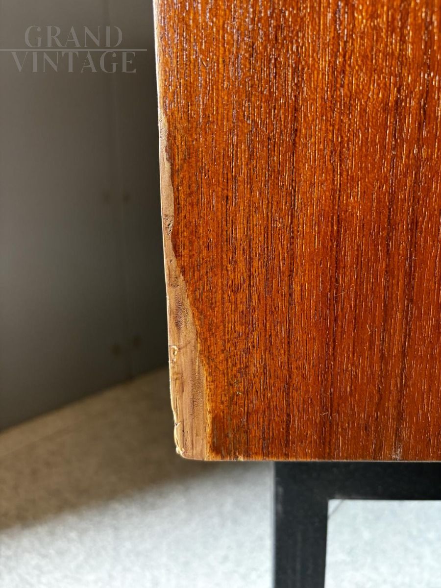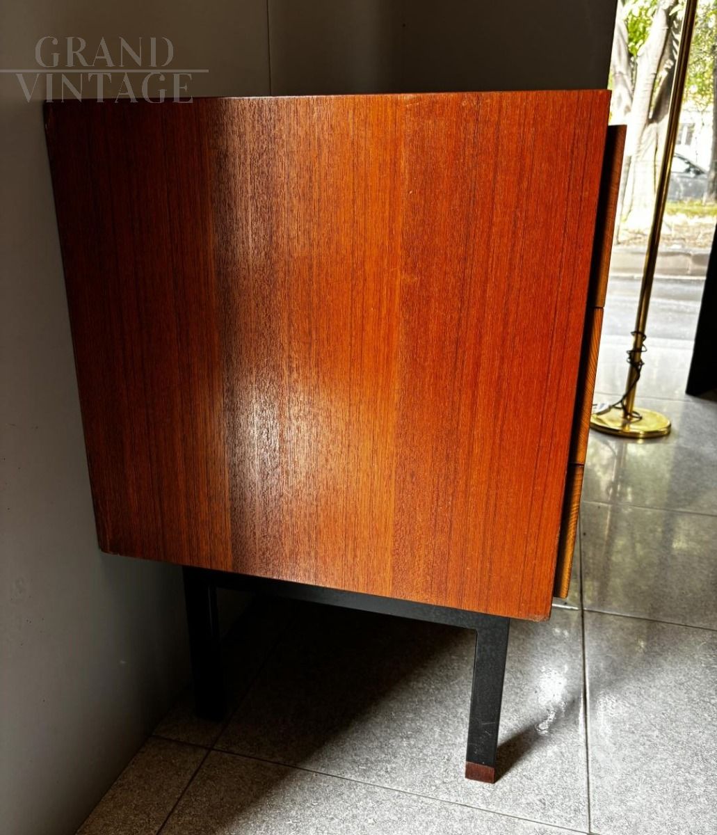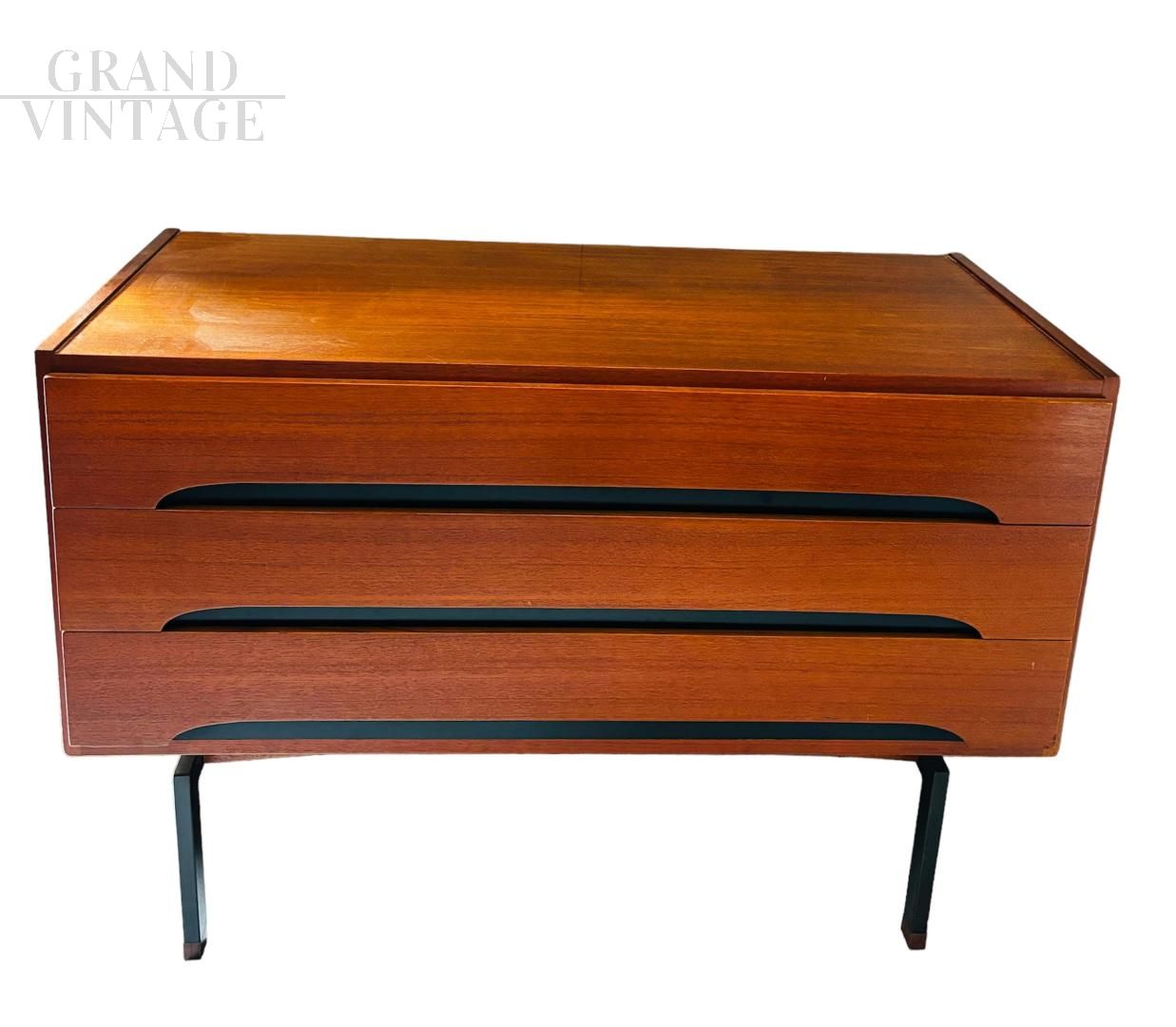 Piccolo comò cassettiera vintage italiana in legno teak con gambe in ferro, dal bellissimo stile scandinavo degli anni '60. In ottime condizioni, presenta normali segni di usura compatibili con l’epoca e una piccola stuccatura nello spigolo in basso del fianco sinistro, come da foto.