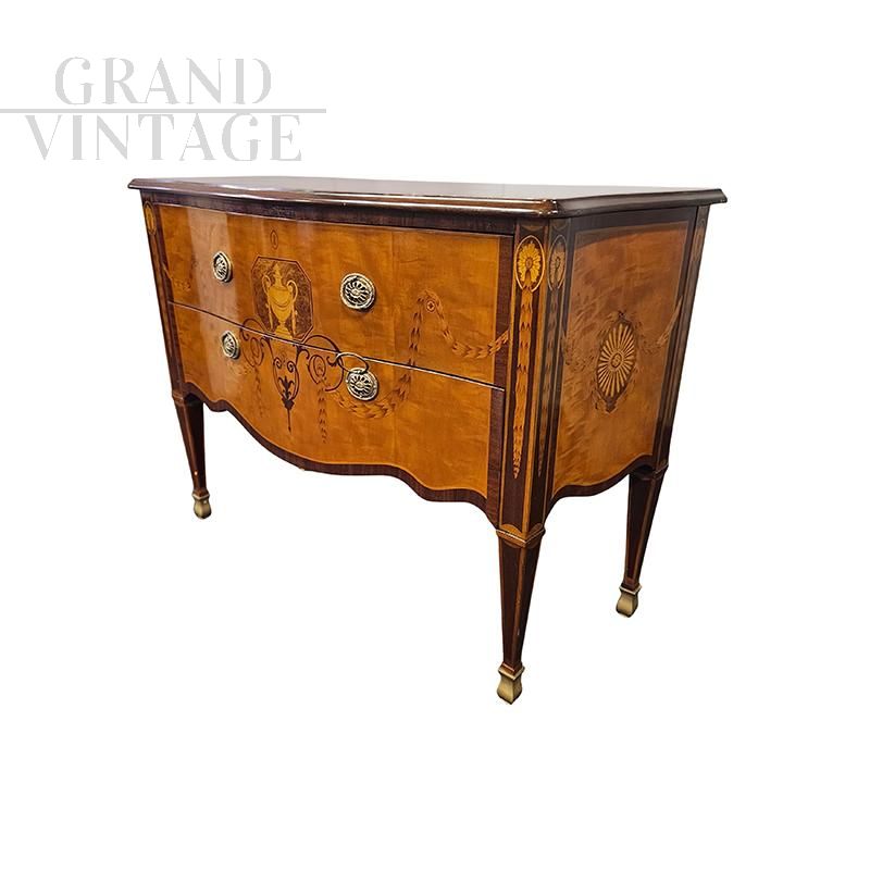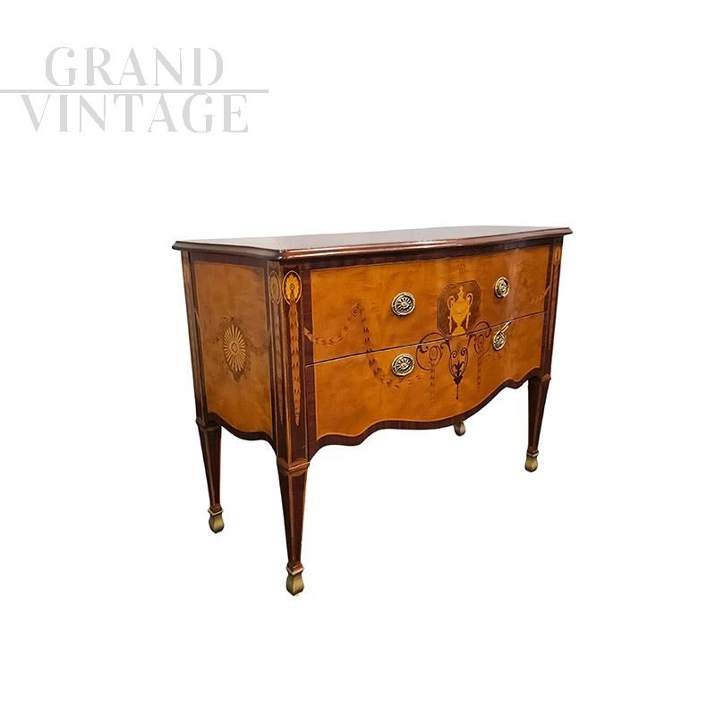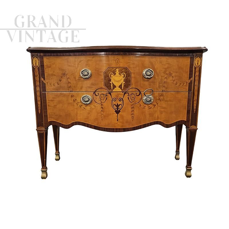 Piccolo comò in stile antico Luigi XVI in radica di noce con intarsi