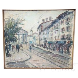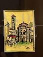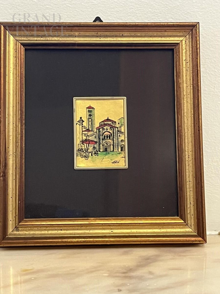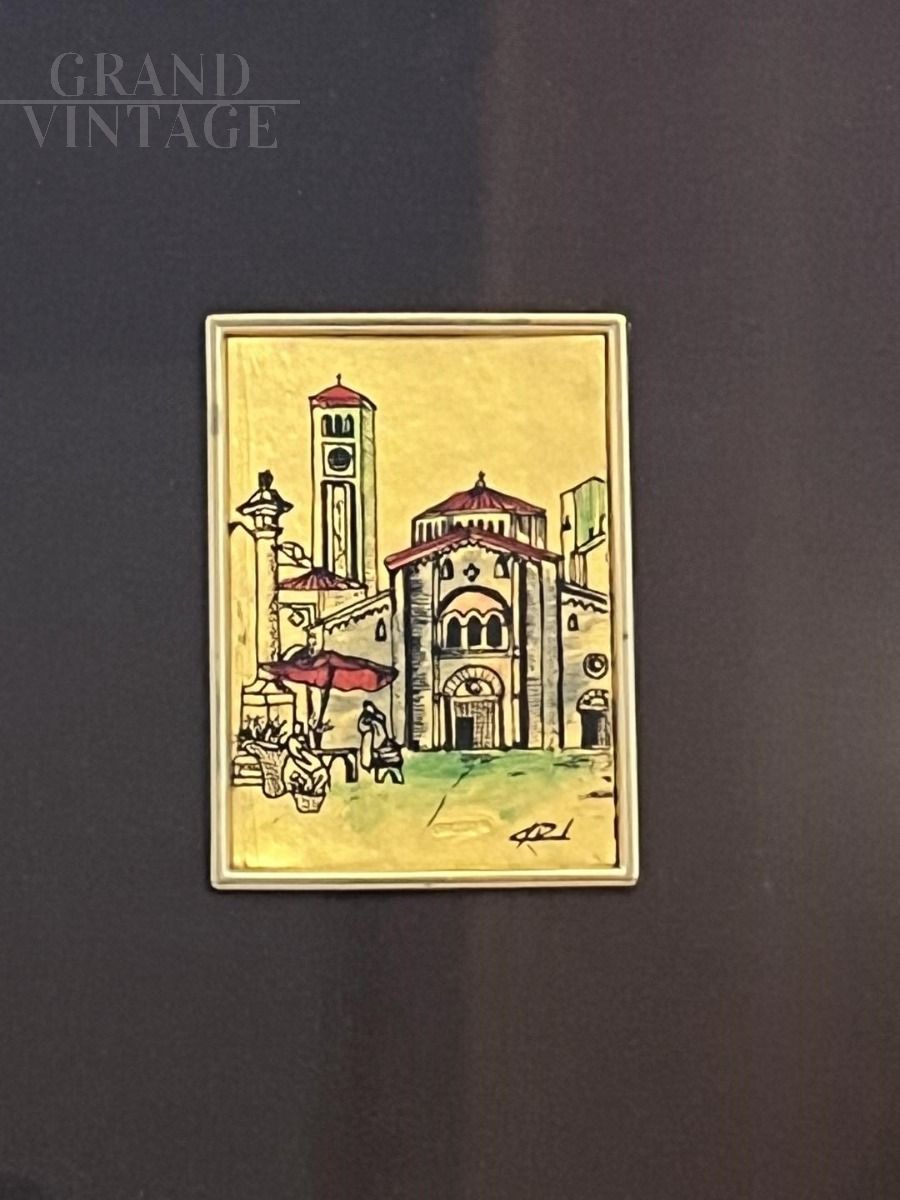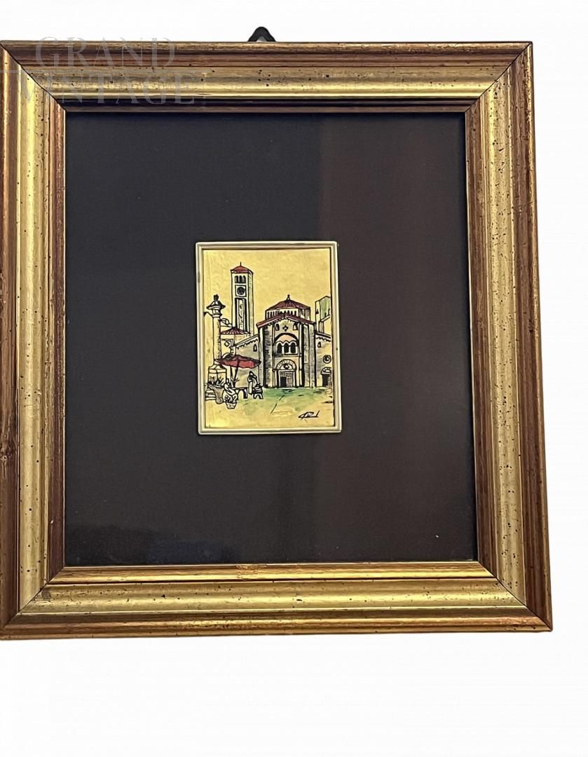 Piccolo quadro con litografia su foglia d’oro 23 kt, raffigurante la basilica milanese di San Babila e la sua piazza. Opera in ottime condizioni, accompagnata da certificato di autenticità.
