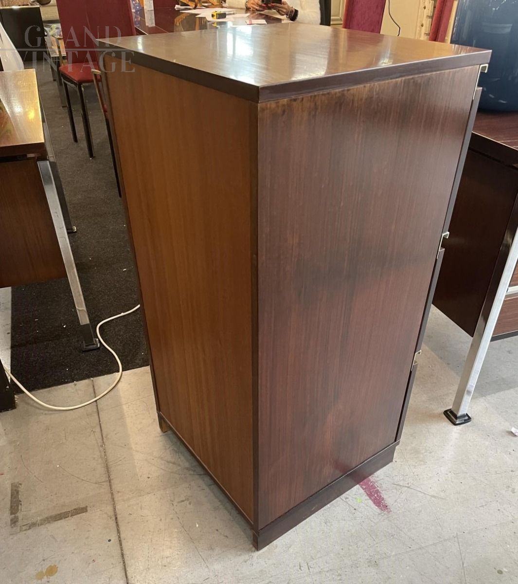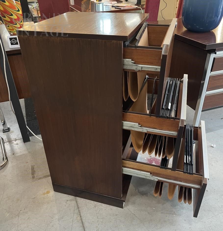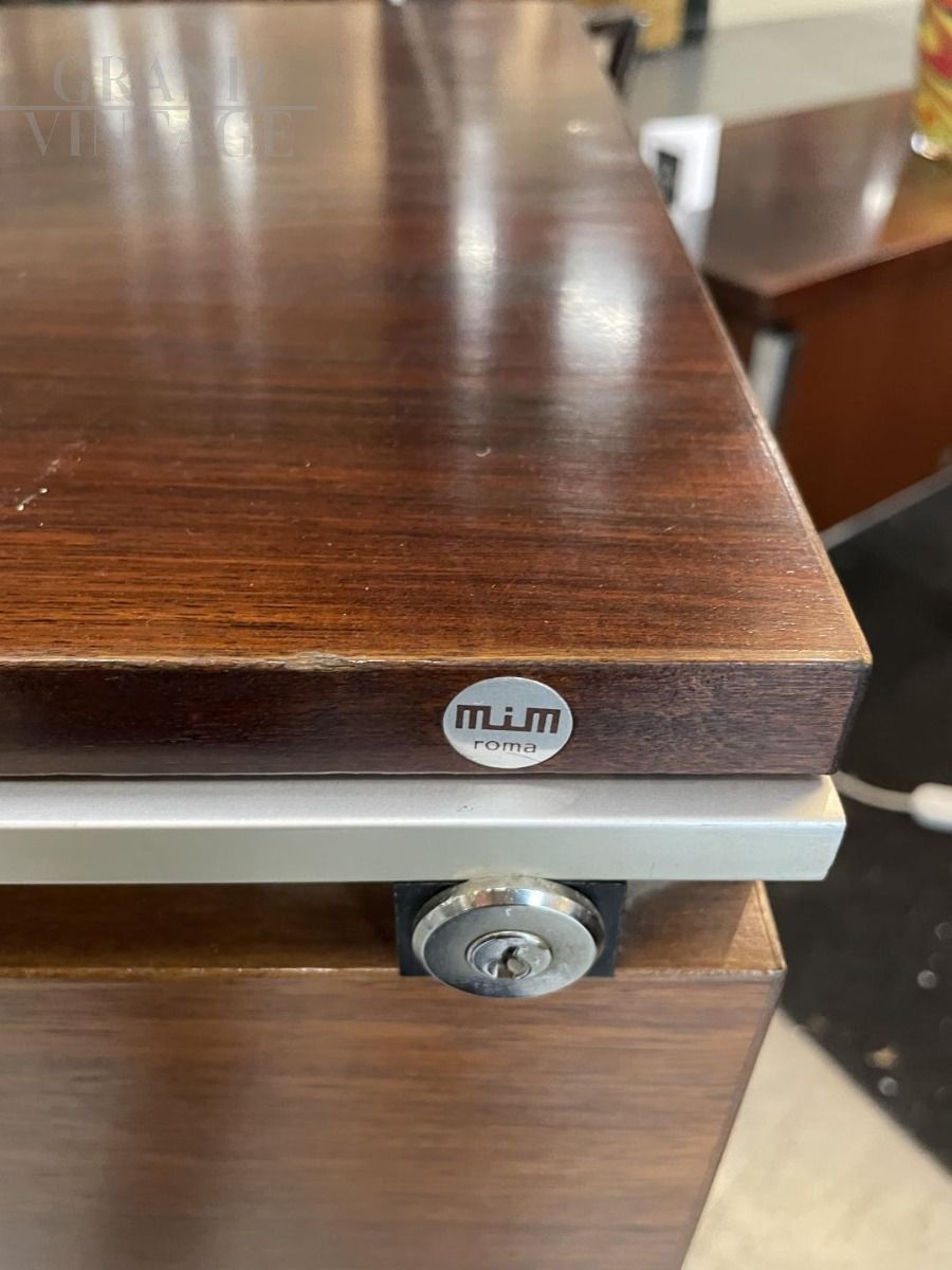 Piccolo schedario a cassettiera design di MIM Roma in legno e metallo cromato dotato di 3 cassetti capienti con porta documenti, Italia anni '70. Lo schedario è comodo e funzionale ed è perfetto da tenere in ufficio o anche in uno studio in casa grazie alle sue ridotte dimensioni.
