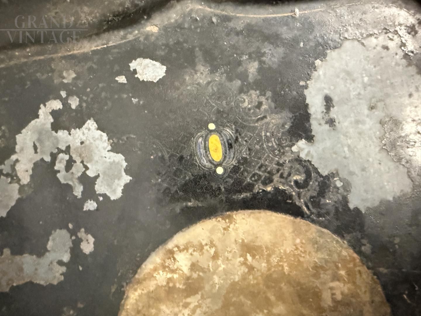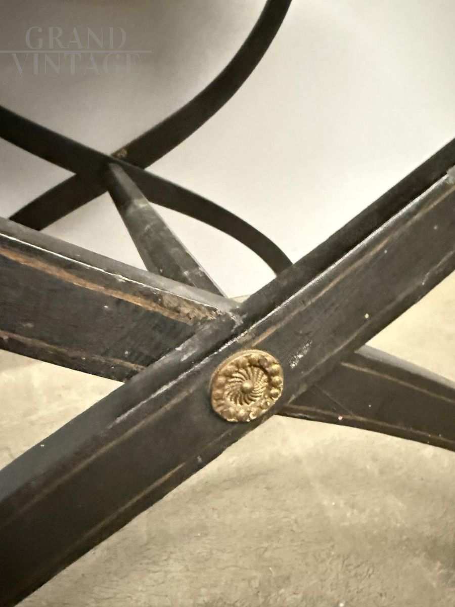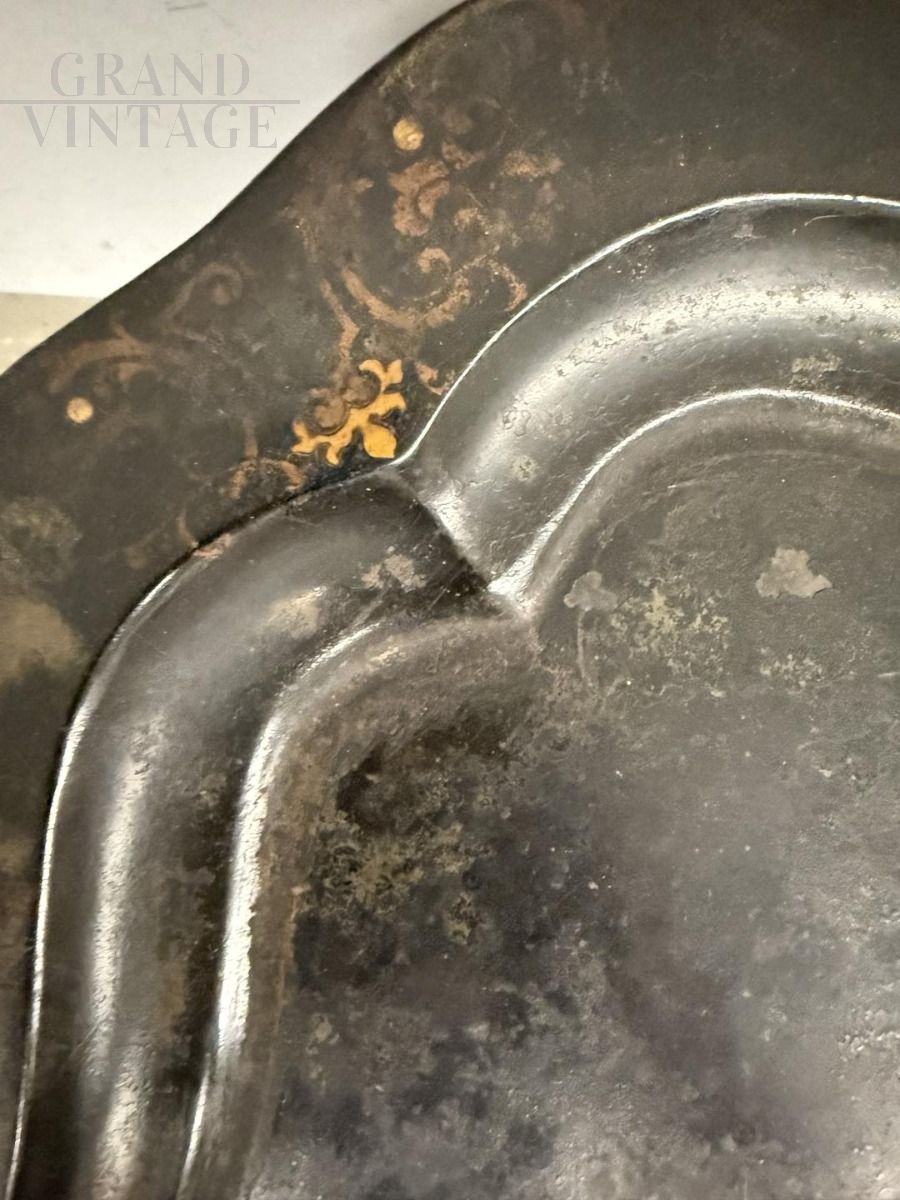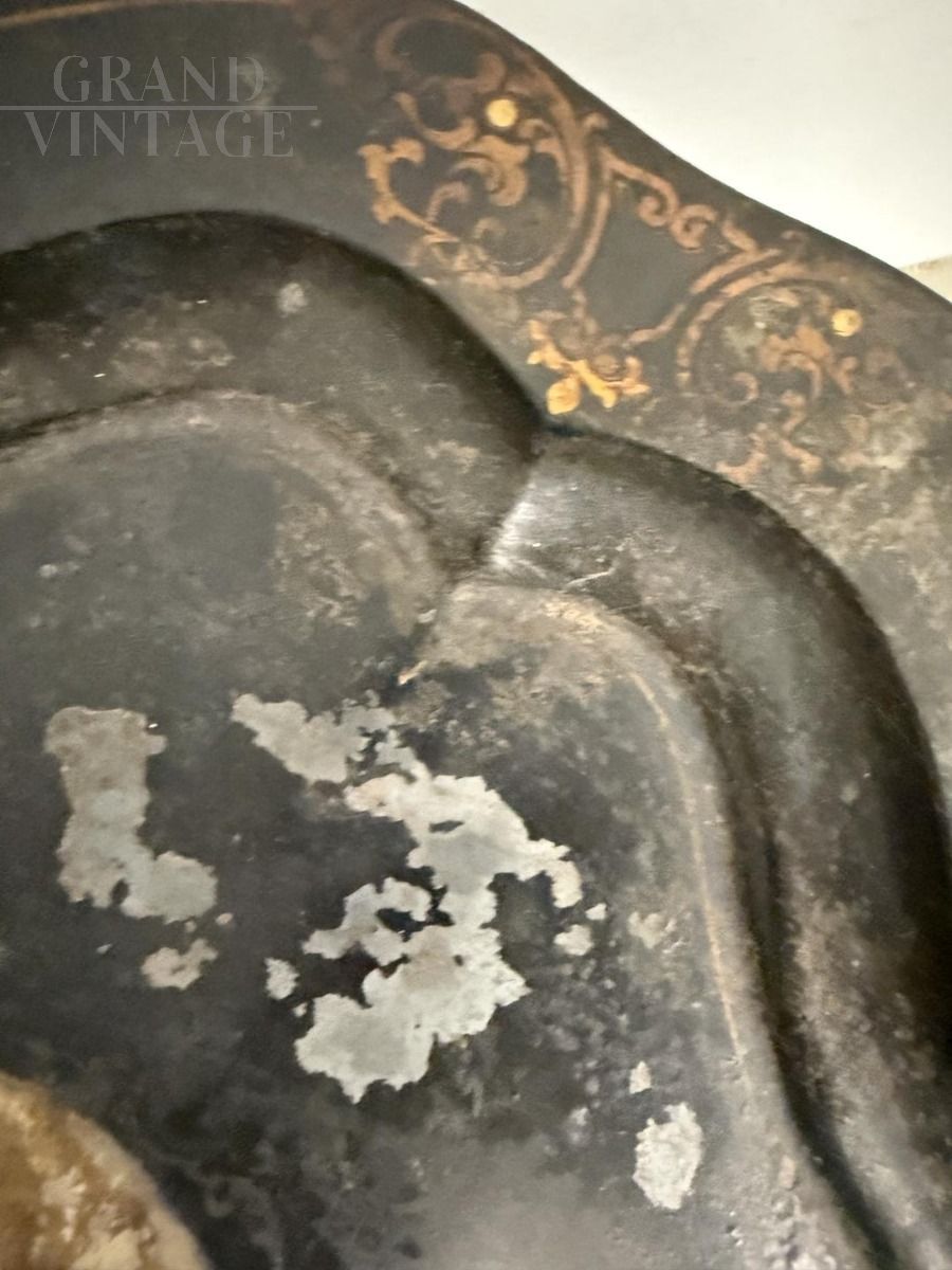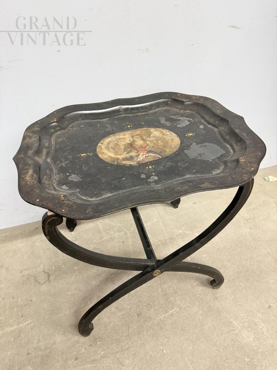Piccolo tavolino da picnic richiudibile antico del 1850 in legno laccato nero con inserti dorati, il piano è a vassoio dall'elegante forma mossa ed è arricchito da un dipinto di scena classica sul piano, 52 x 56 x 64cm.