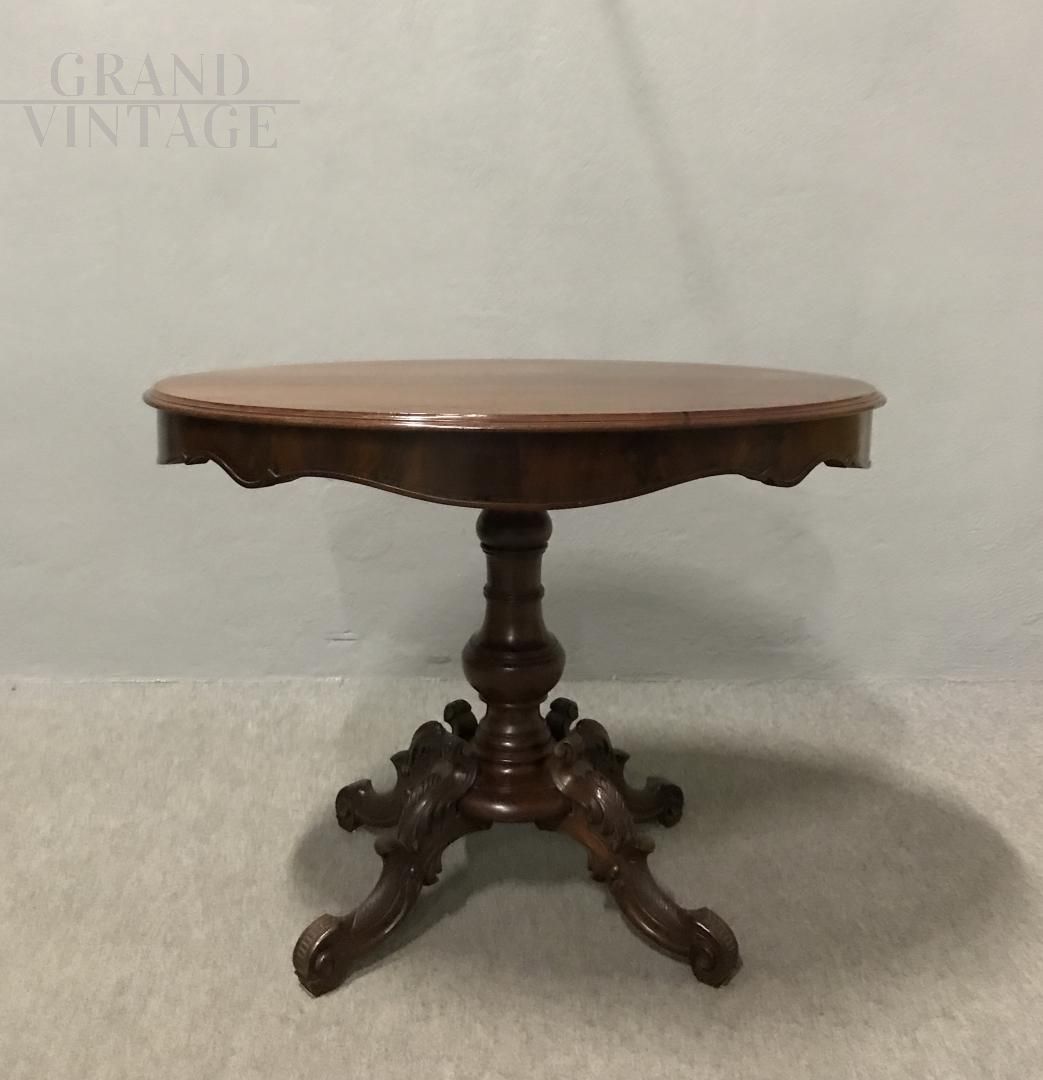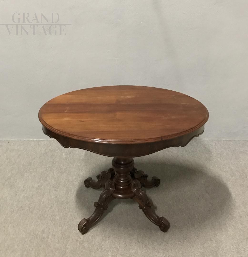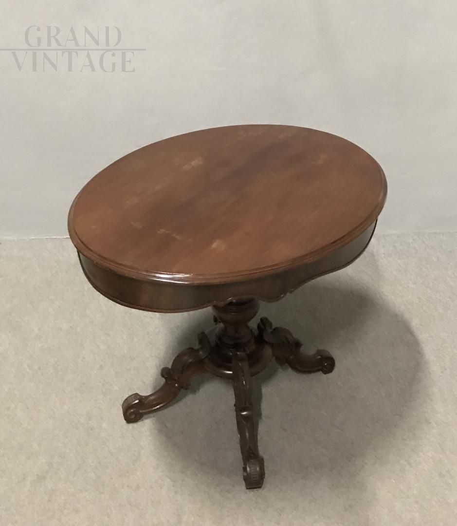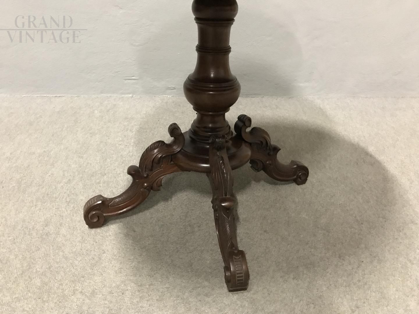 Tavolino antico, piccolo tavolo da appoggio della fine del XIX secolo, con gamba centrale tornita e quattro piedi intagliati.