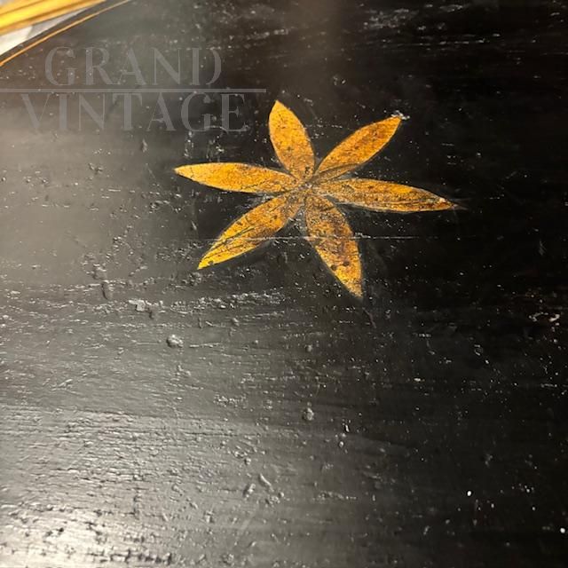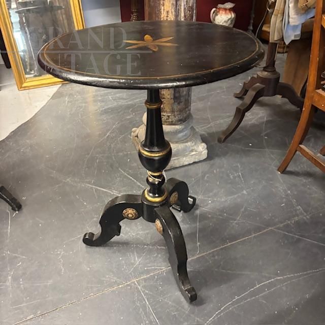 Piccolo tavolino da appoggio rotondo antico proveniente dalla toscana dei primi dell'800, in legno laccato nero con dettagli dorati, al centro del piano si trova una stella dorata. Il tavolino proviene da un'importante eredità.