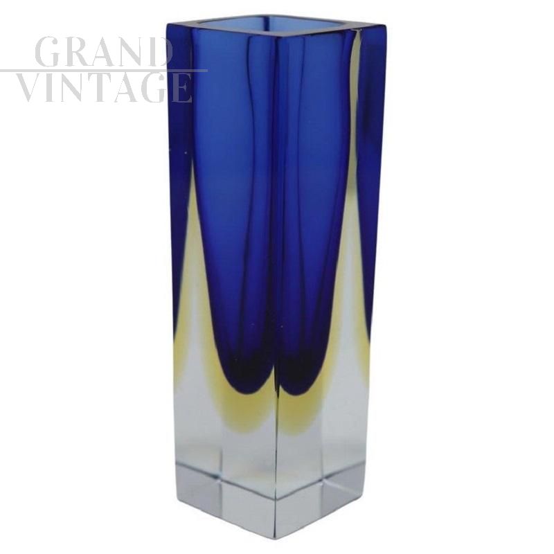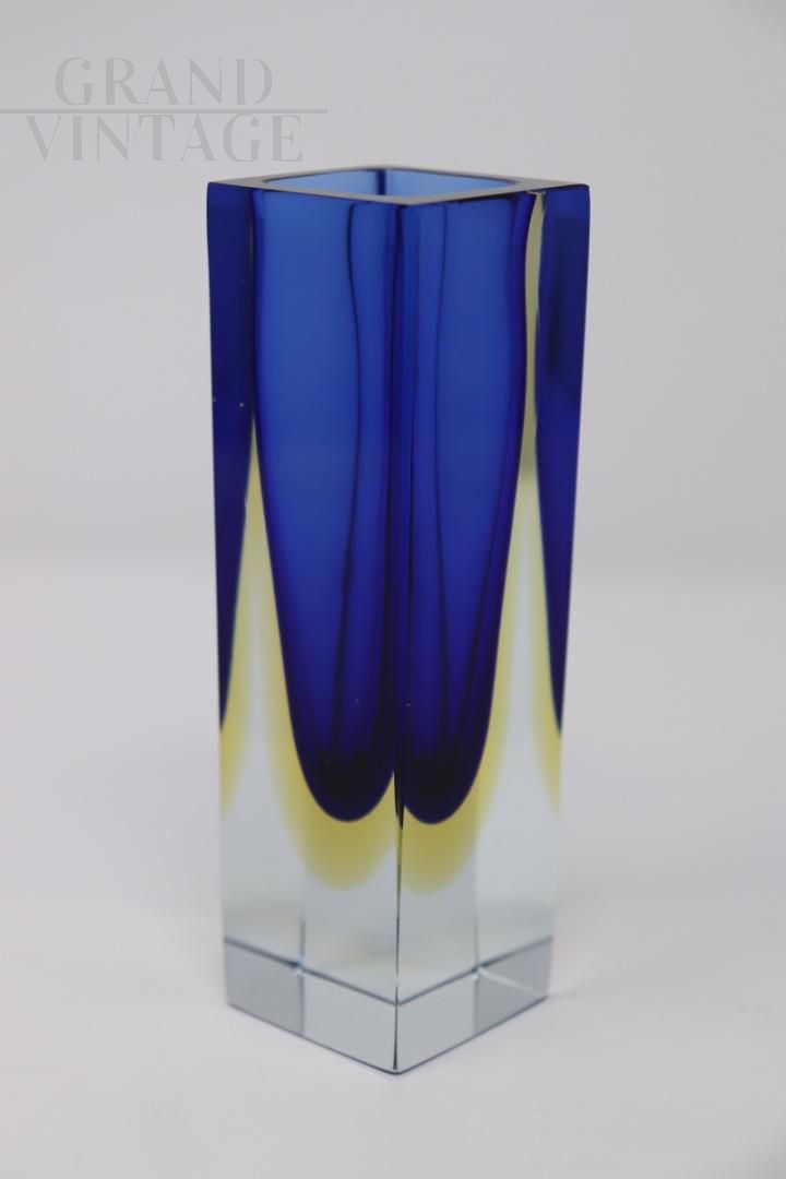 Piccolo vaso anni '70 in vetro di Murano sommerso blu e giallo