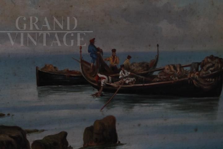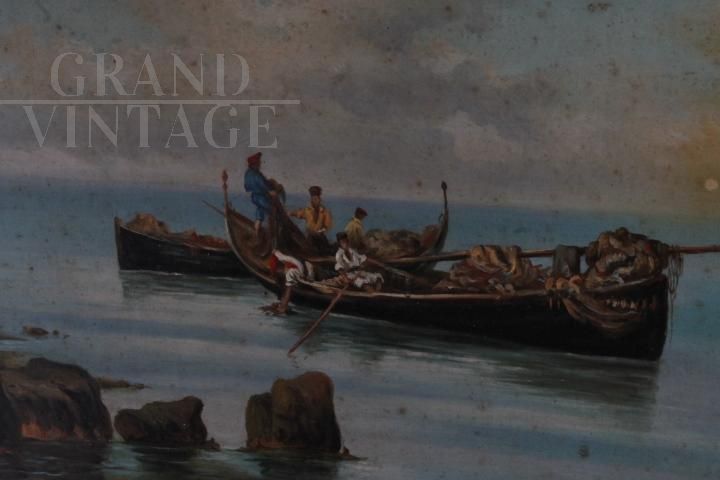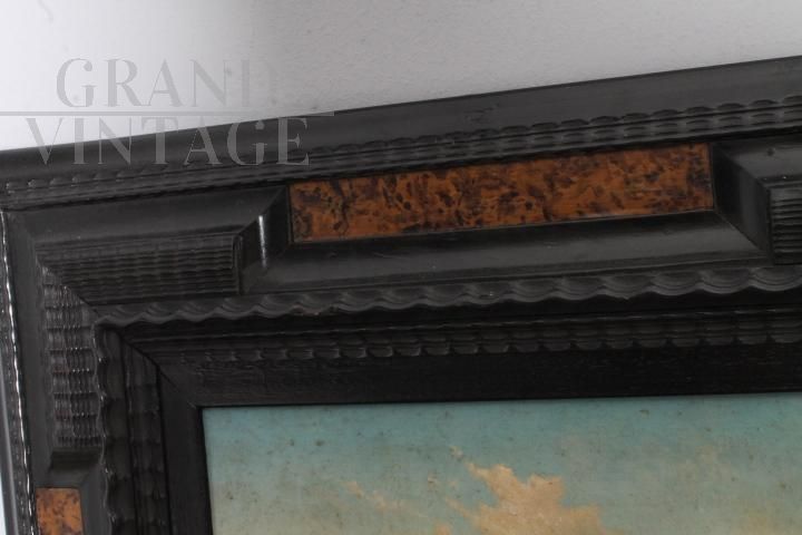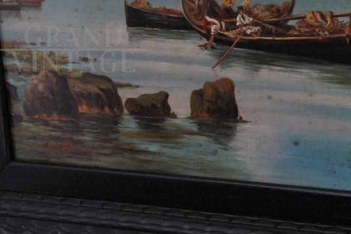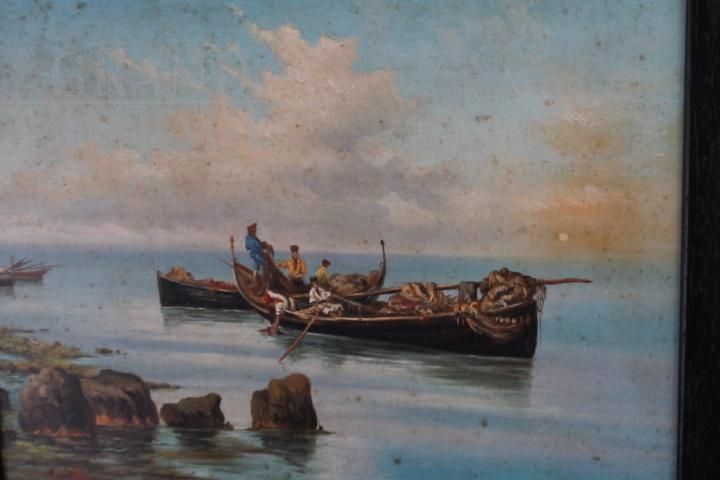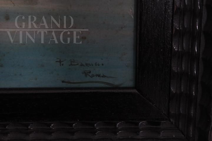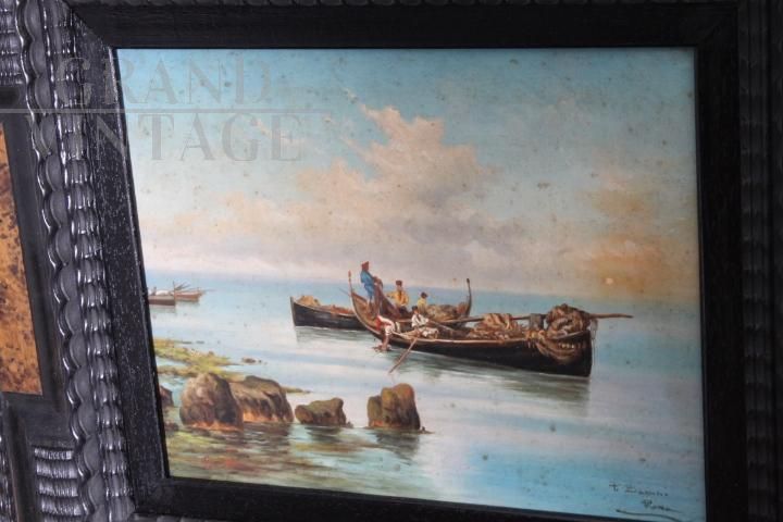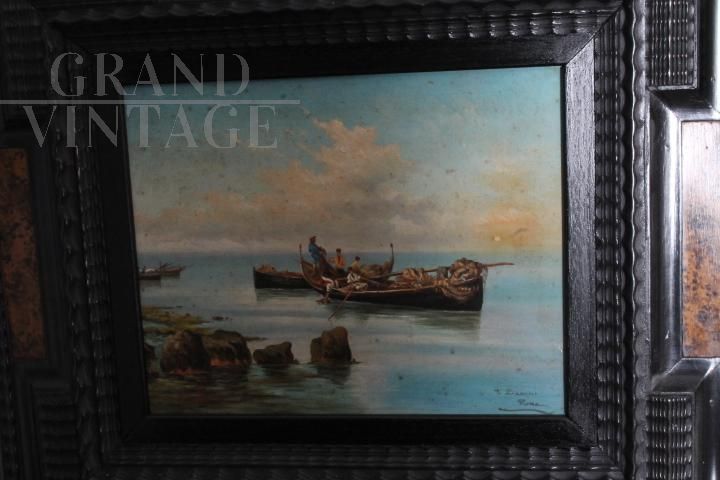 Dipinto classico del pittore romano Paolo Barucci dei primi del '900, olio su tavola raffigurante marina con pescatori, di bellissima qualità, completo di cornice antica in legno intagliato e laccato nero con decorazioni in radica. Non necessita di interventi di restauro.