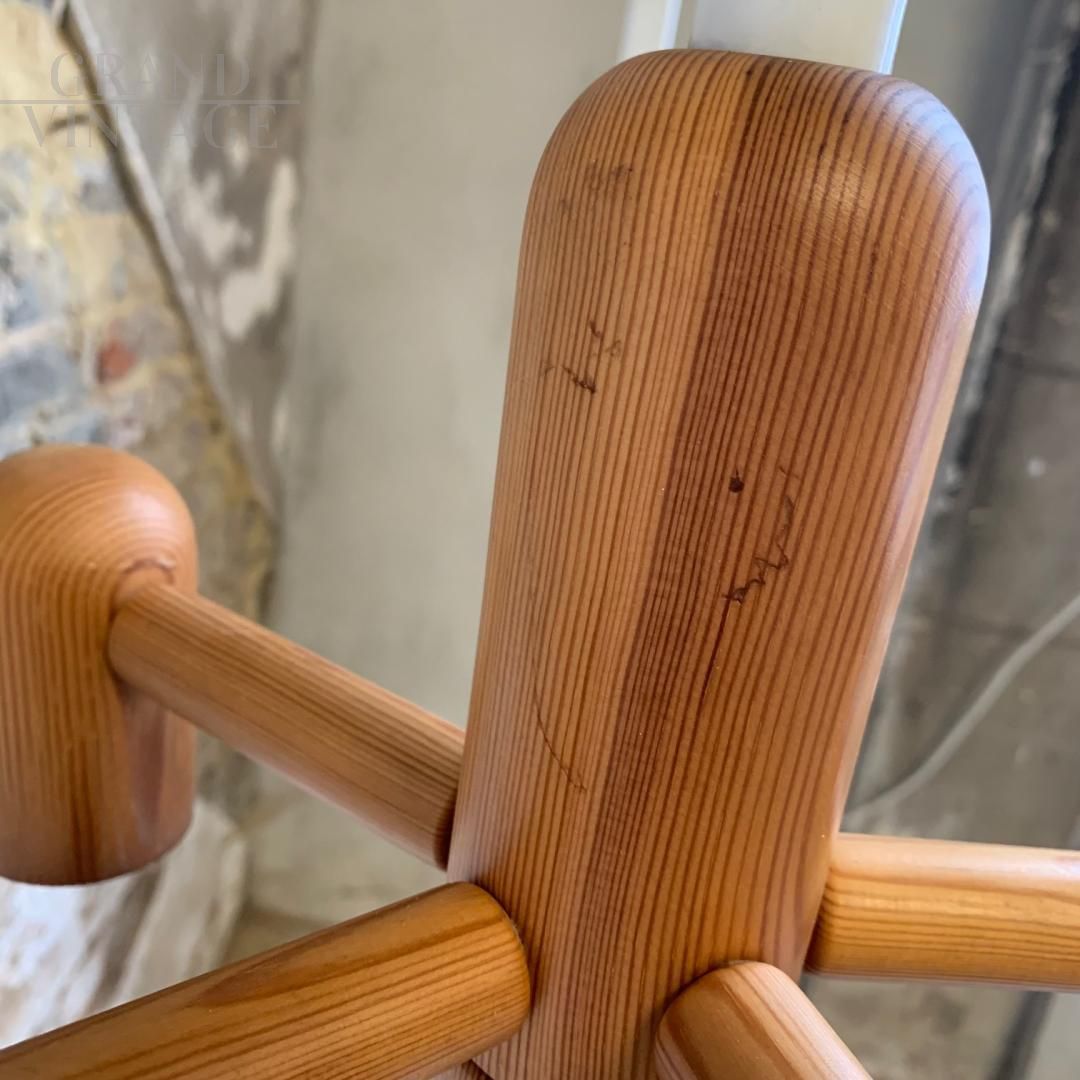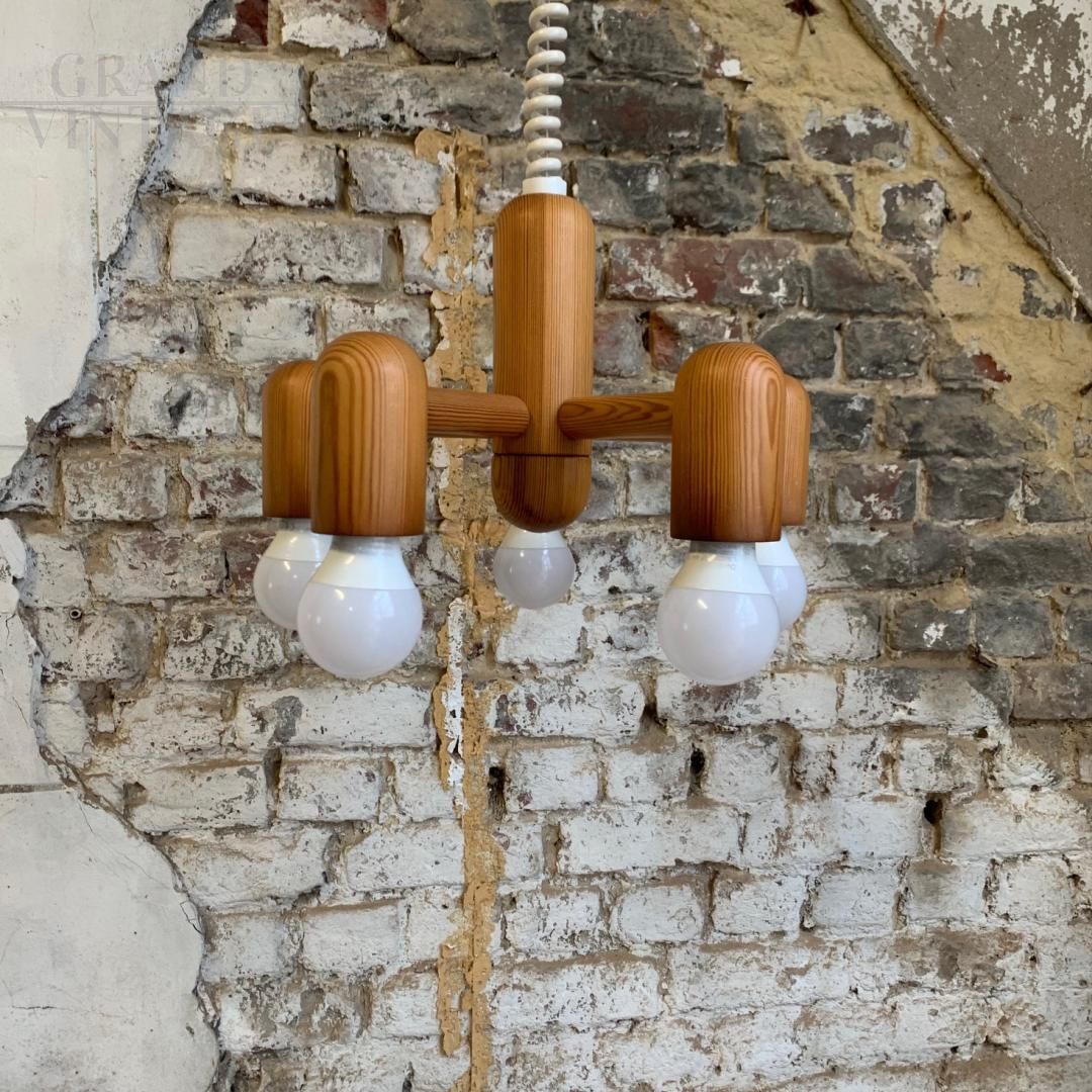 Lampadario vintage in legno di pino realizzato da Hustadt Leuchten negli anni '80 in bellissimo stile scandinavo, con 5 punti luce, lampadina non inclusa. In buone condizioni, presenta qualche naturale traccia del temopo.