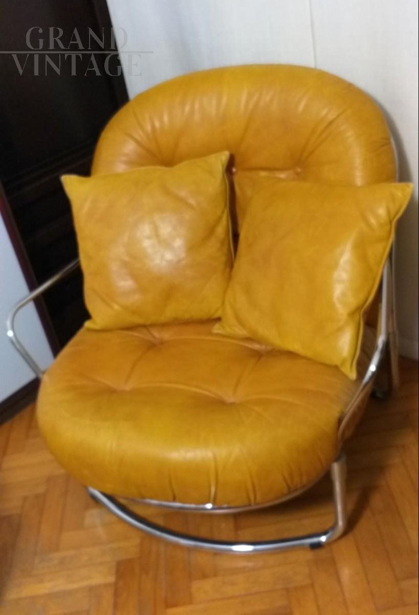 Bellissima poltrona di Carlo de Carli per Cinova completa di pouf e cuscini, in pelle color cognac e struttura in metallo cromato.