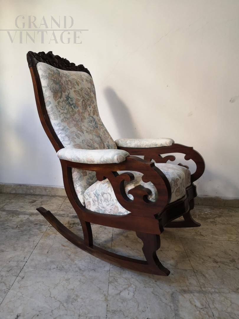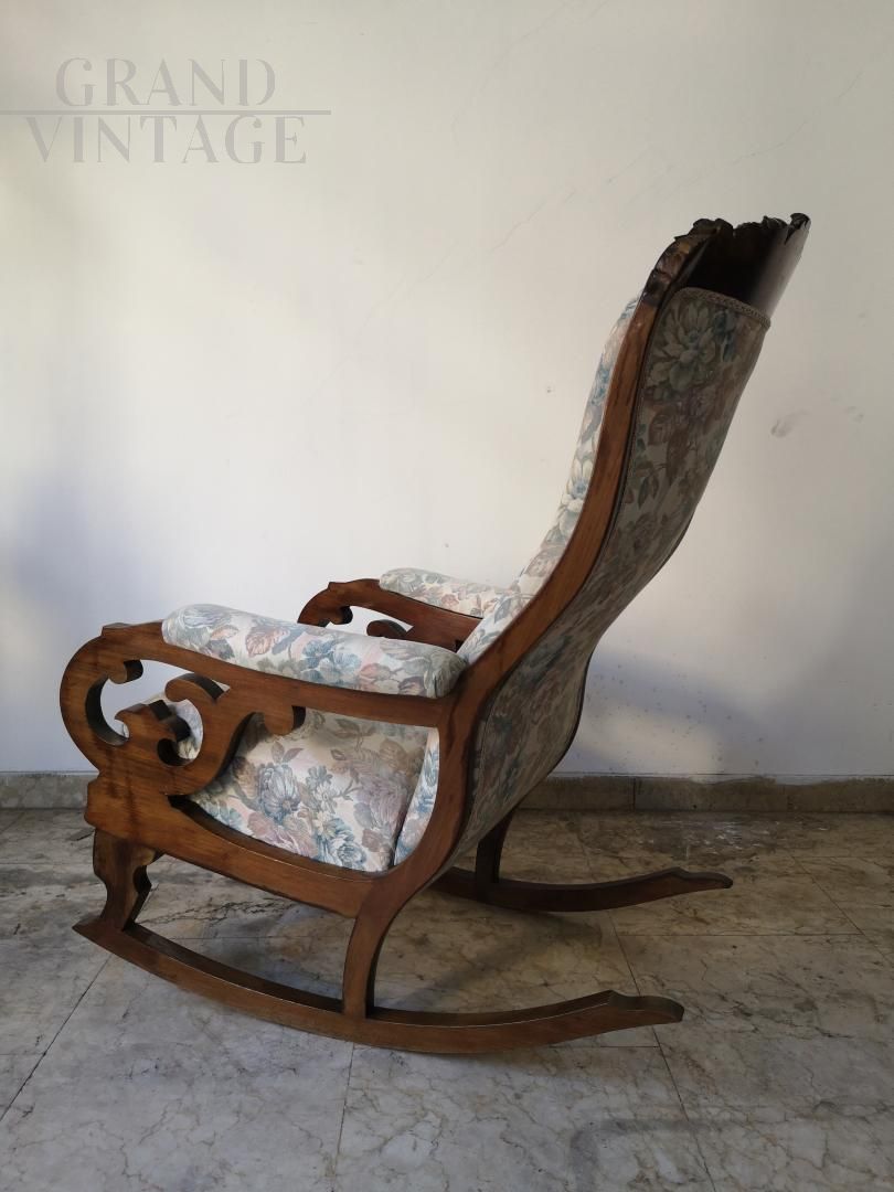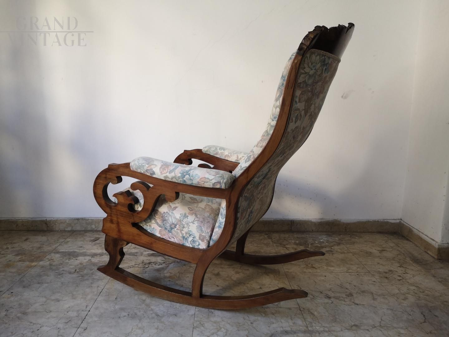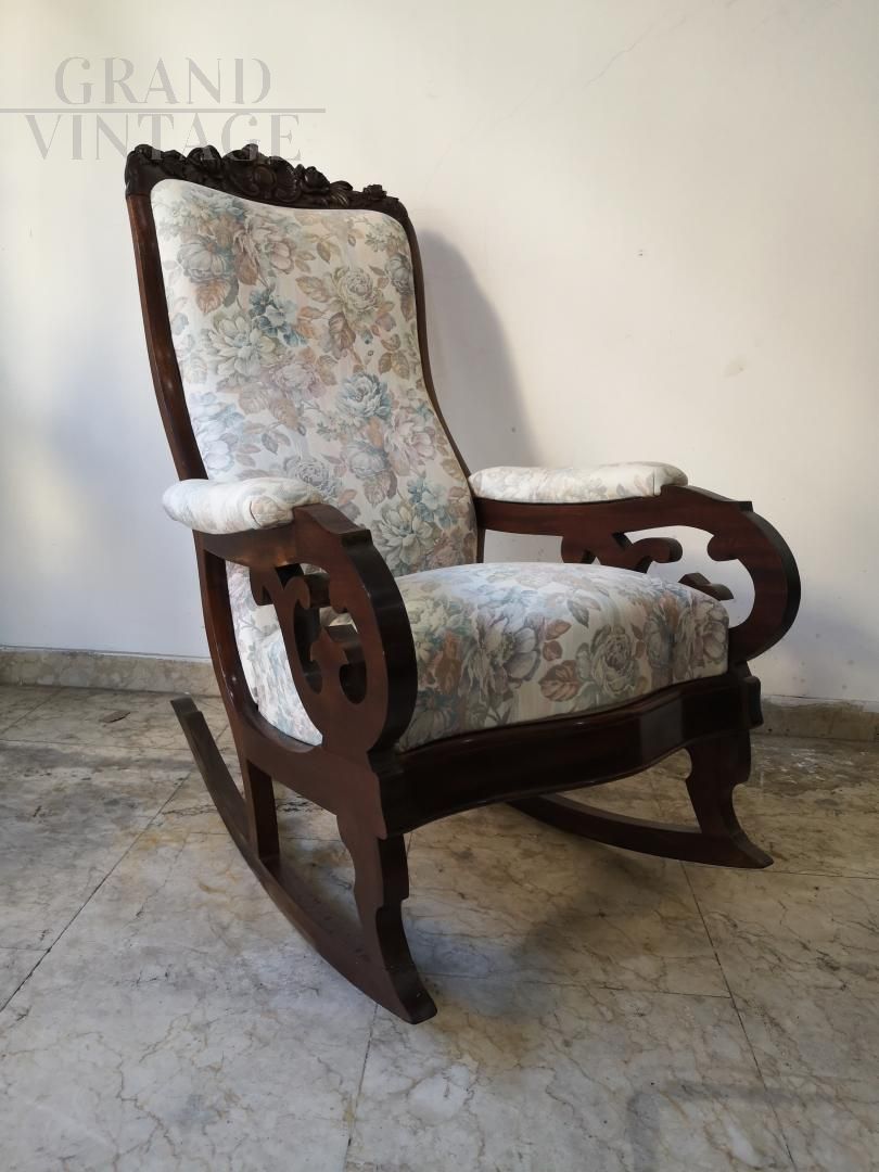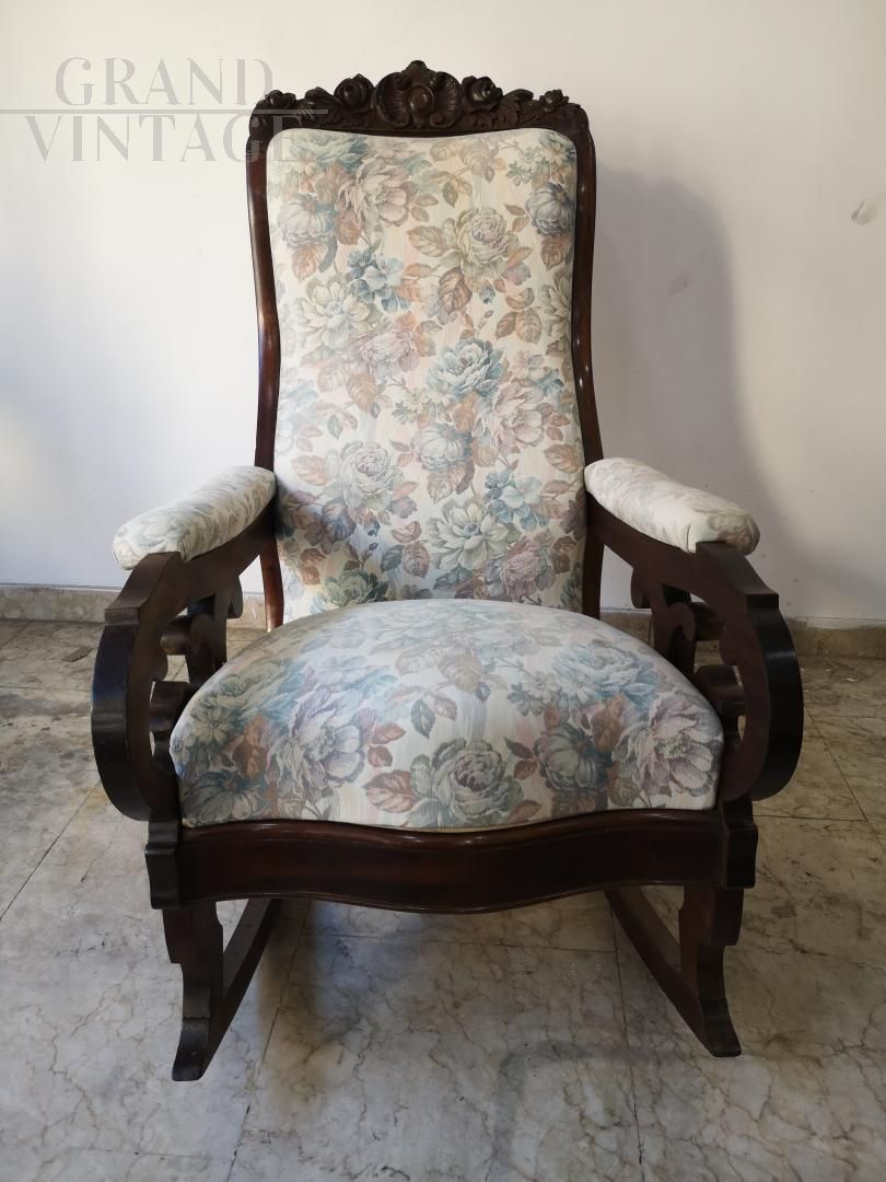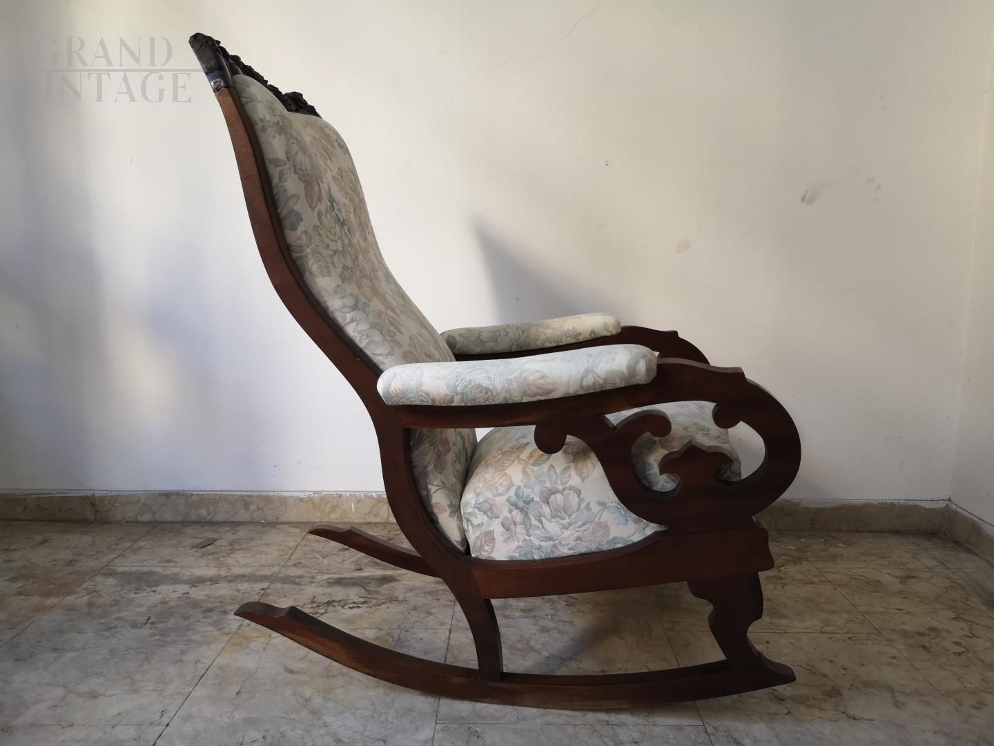 Poltrona a dondolo antica di epoca Luigi Filippo in noce intagliato e scolpito, imbottita e rivestita in stoffa floreale, Italia 1870 - 1880, in buone condizioni.