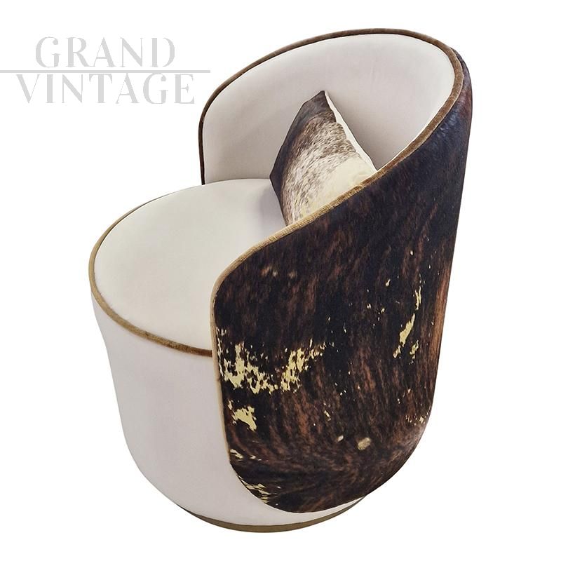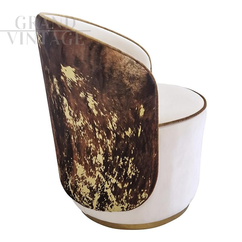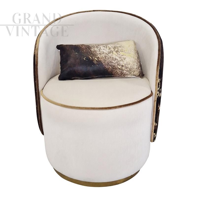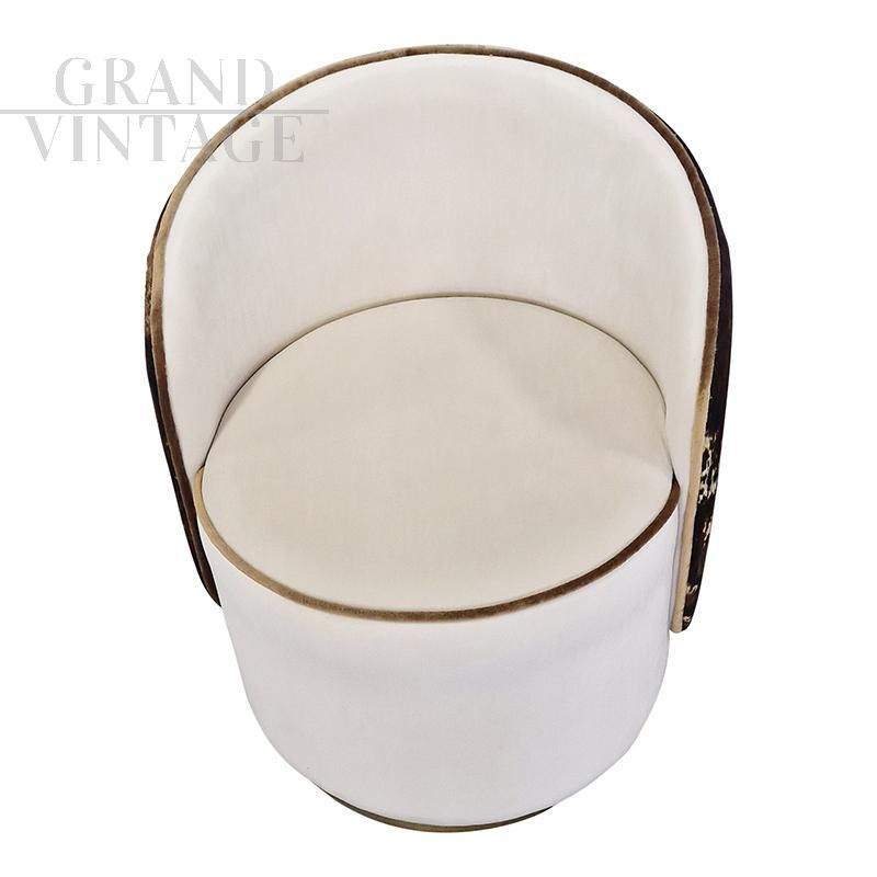 Poltrona a pozzetto in stile art déco in velluto bianco con retro in cavallino e con cuscino abbinato.