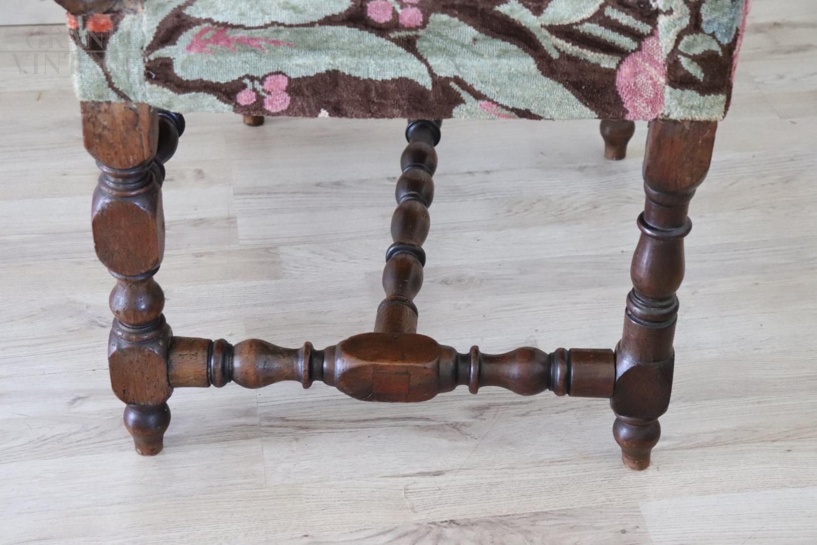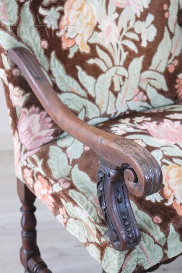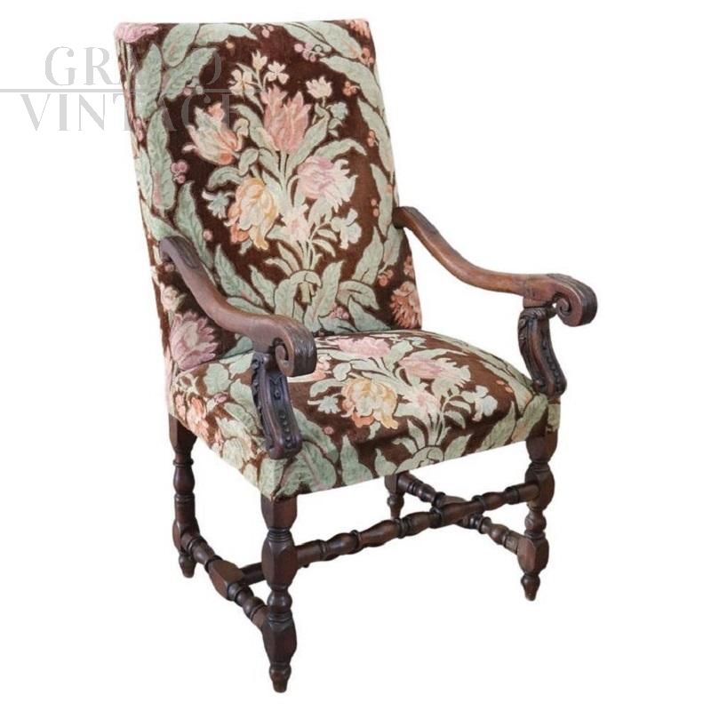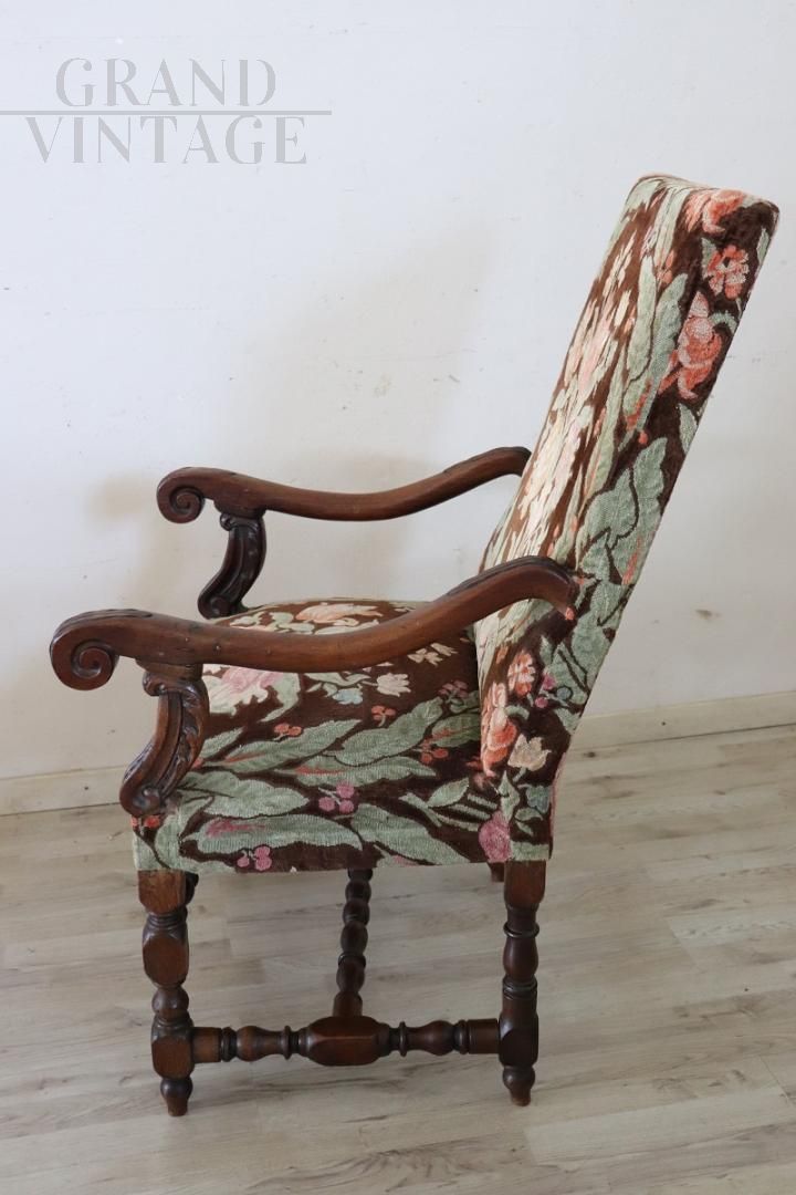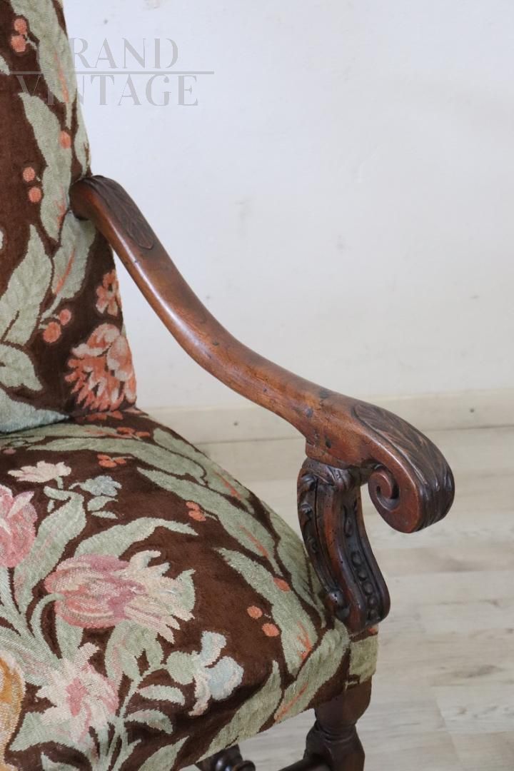 Maestosa poltrona a trono antica risalente ai primi decenni del XVIII secolo, realizzata durante il periodo Luigi XIV in noce massello con comodo schienale e seduta con imbottitura. Il suo design segue perfettamente la moda del periodo storico con braccioli mossi e gambe finemente tornite. L'imbottitura è rivestita con un tessuto caratterizzato da una decorazione floreale molto accattivante. Una comoda poltrona che si presta a diversi utilizzi: potete usarla alla scrivania, come capotavola o per abbellire il vostro salotto. Da un punto di vista conservativo, il legno è in ottime condizioni, il tessuto è in buone condizioni, la seduta presenta segni d'uso ed è morbida, potete sostituire l'imbottitura. Prezzo trattabile. Altezza della seduta 56 cm.