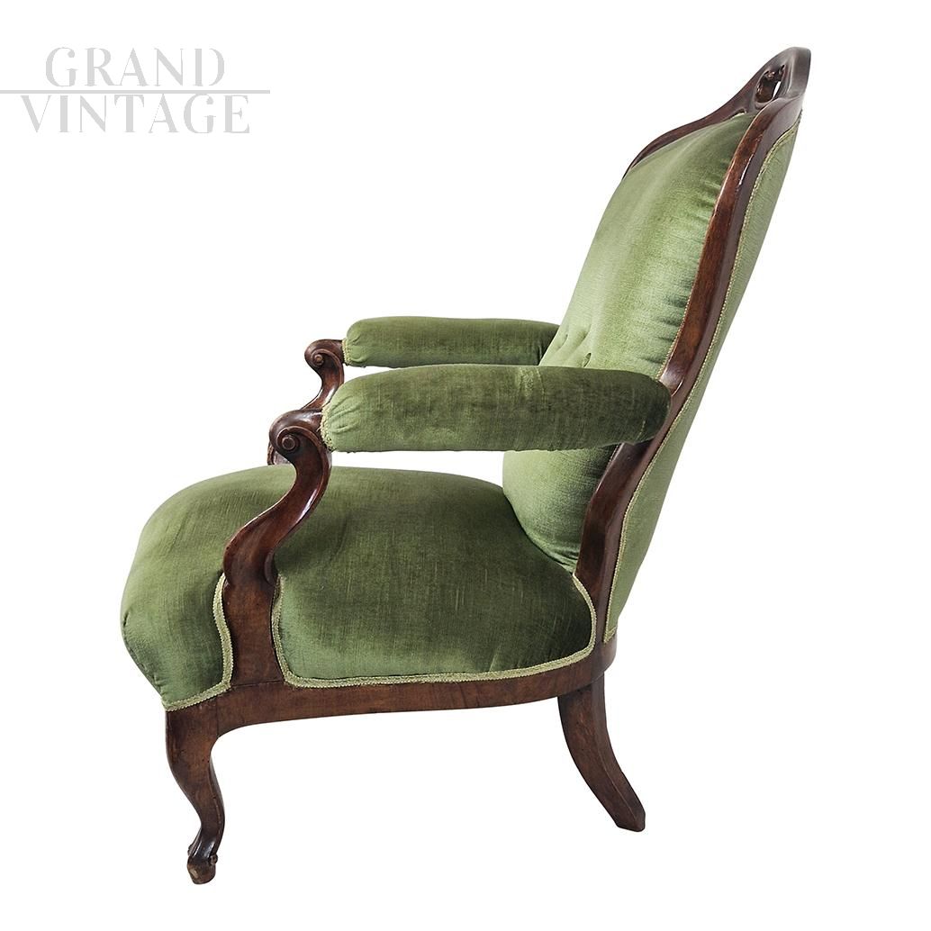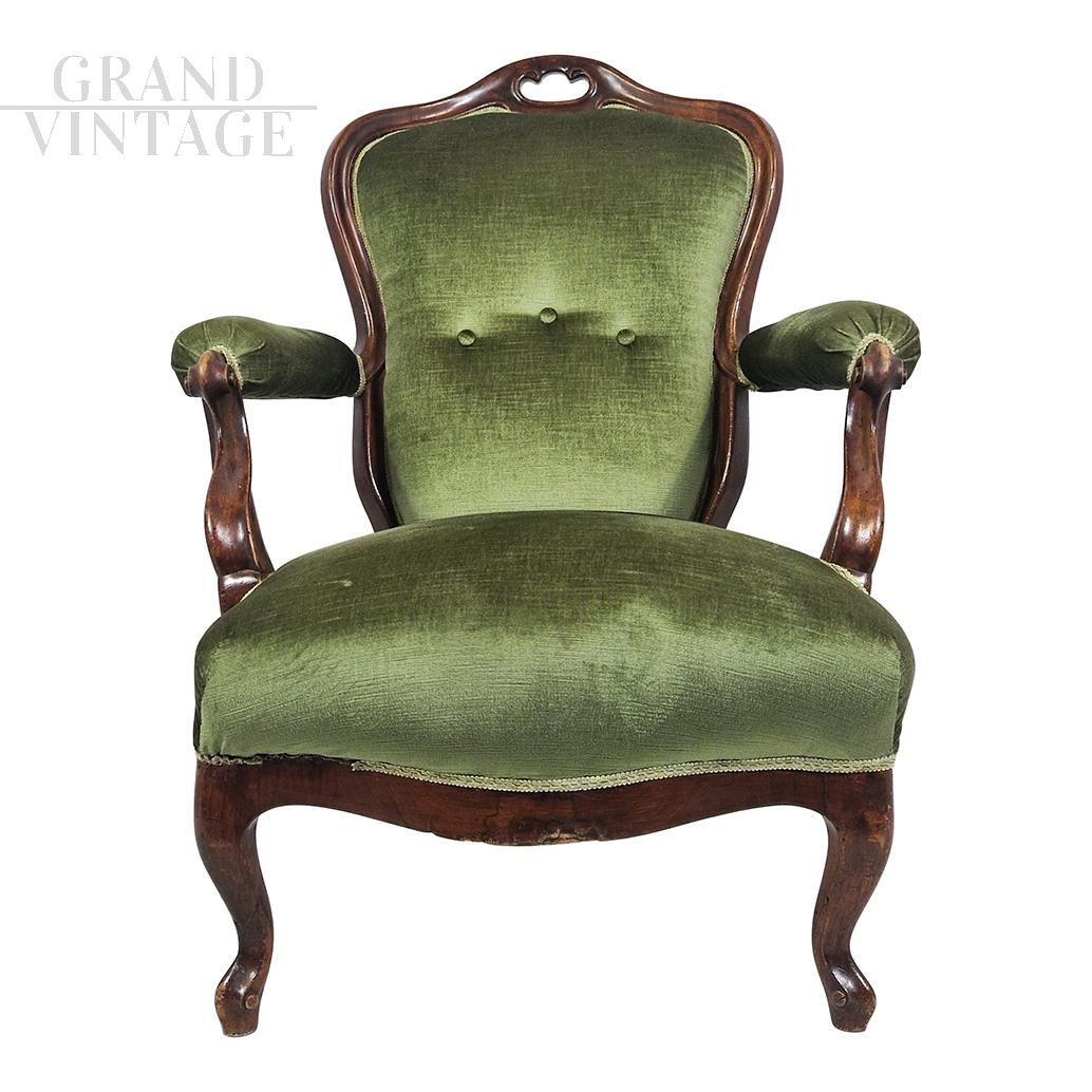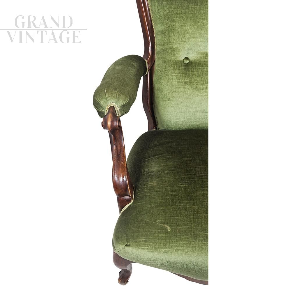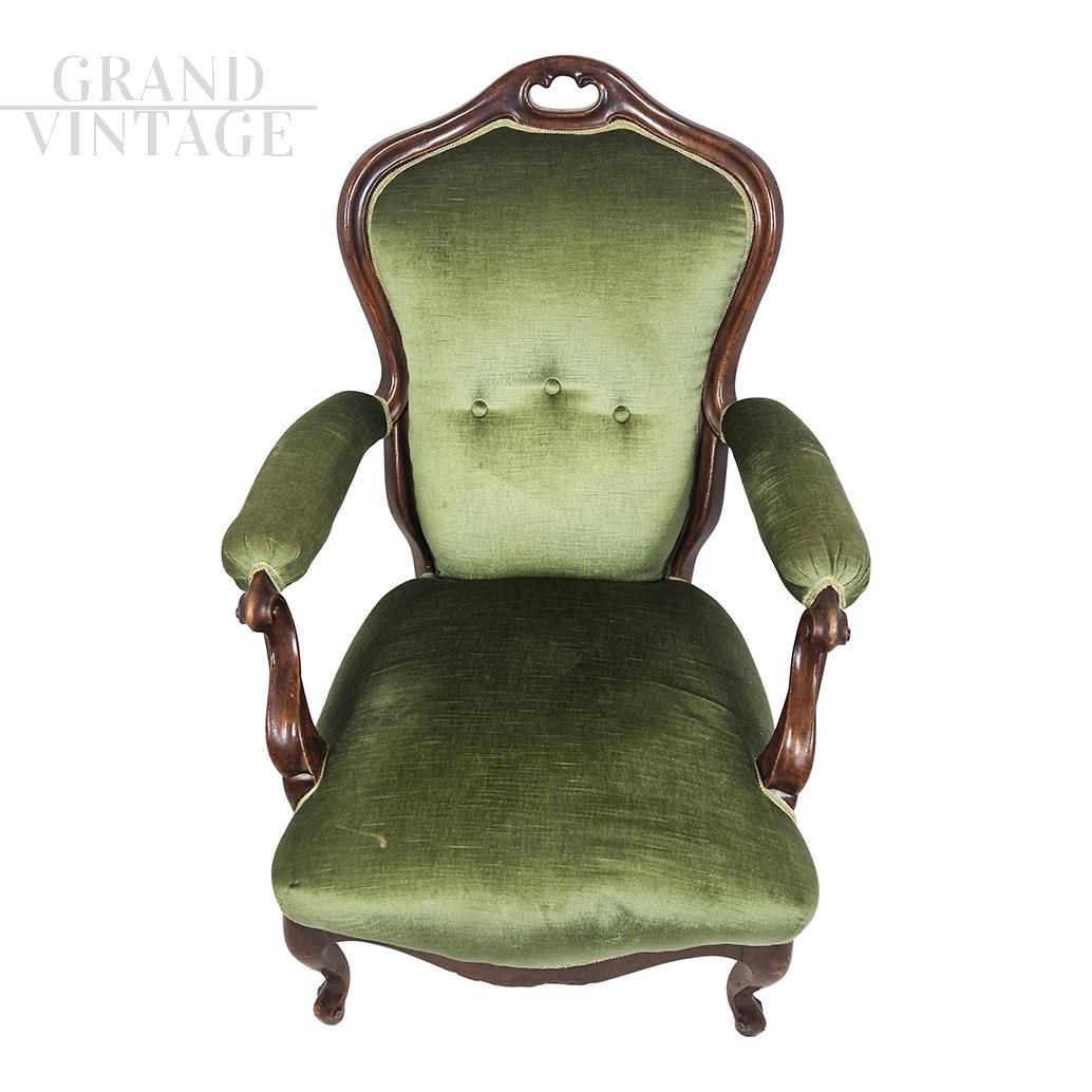 Poltrona antica di epoca Luigi Filippo in velluto di Genova verde