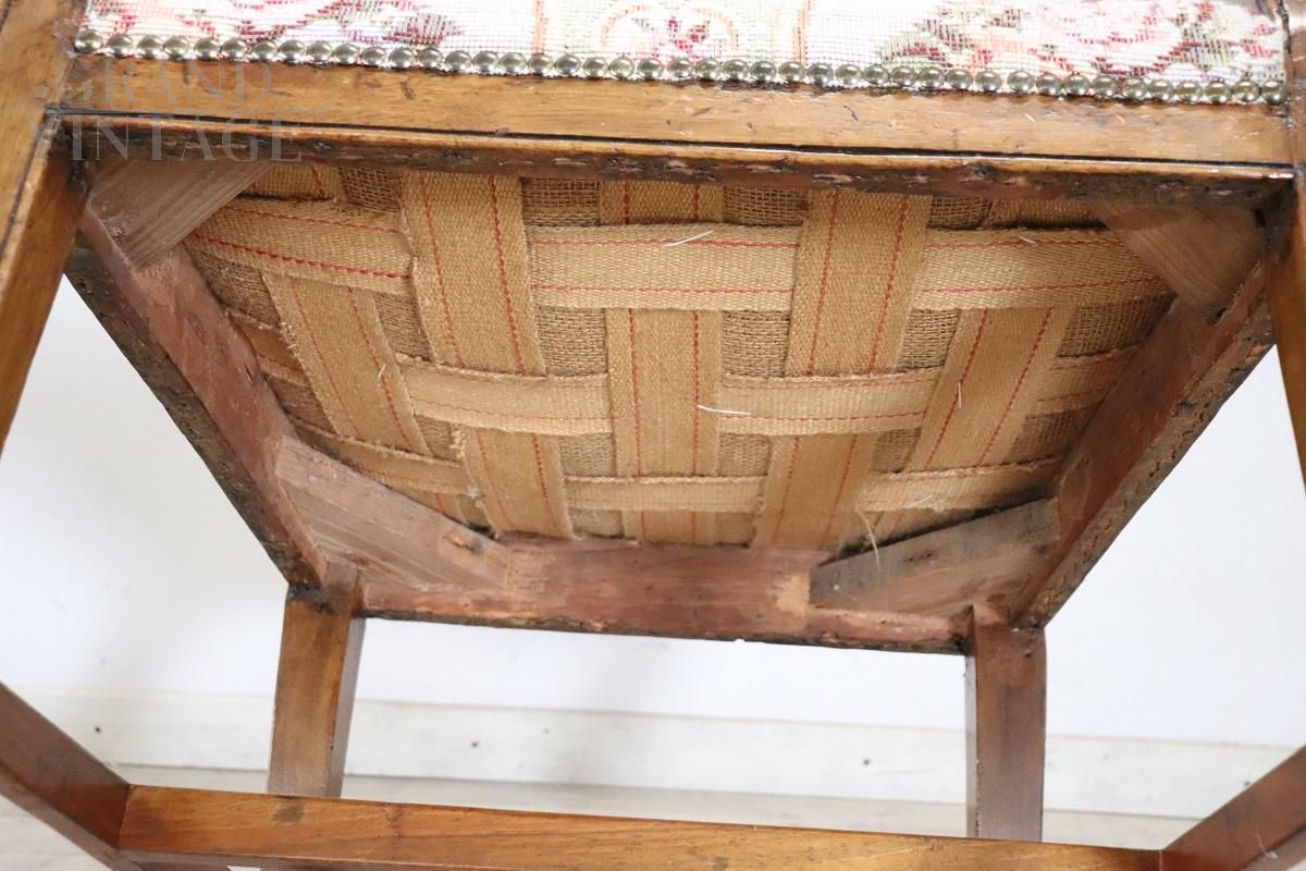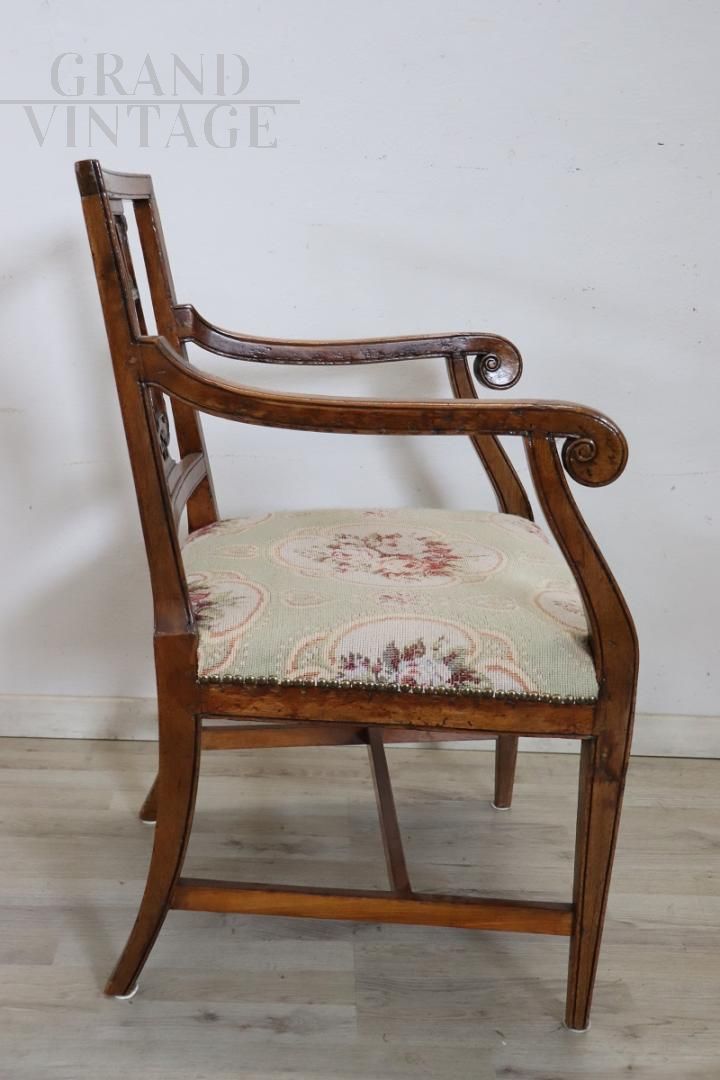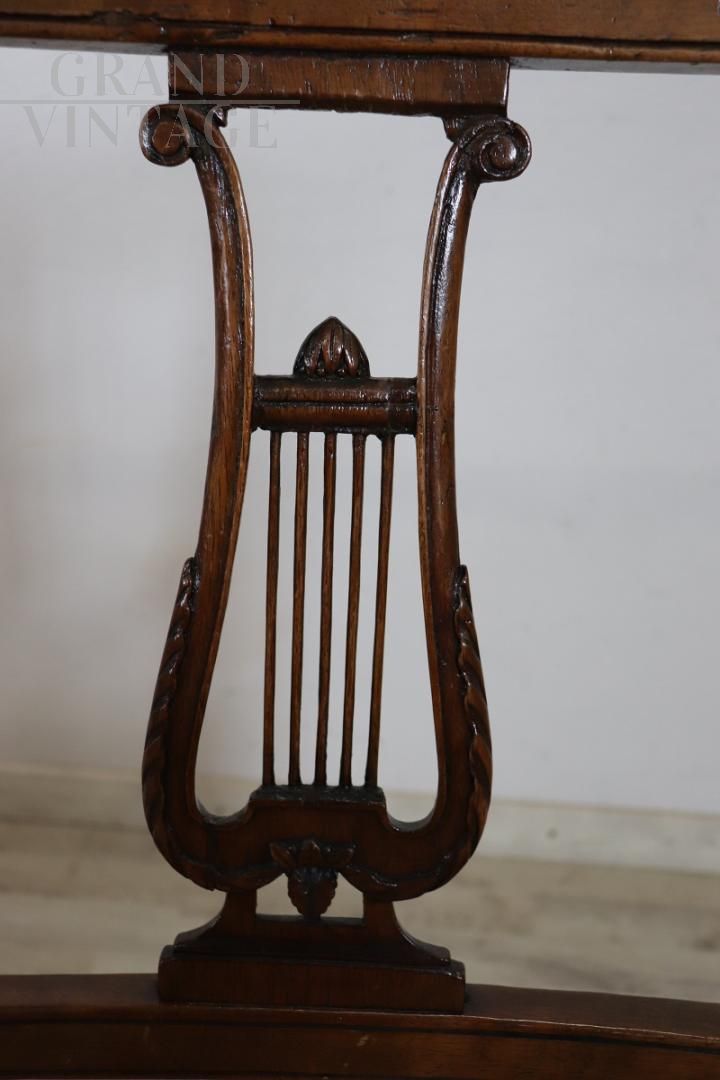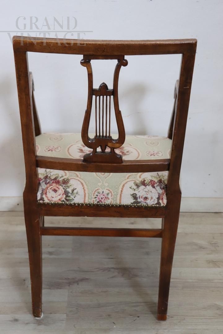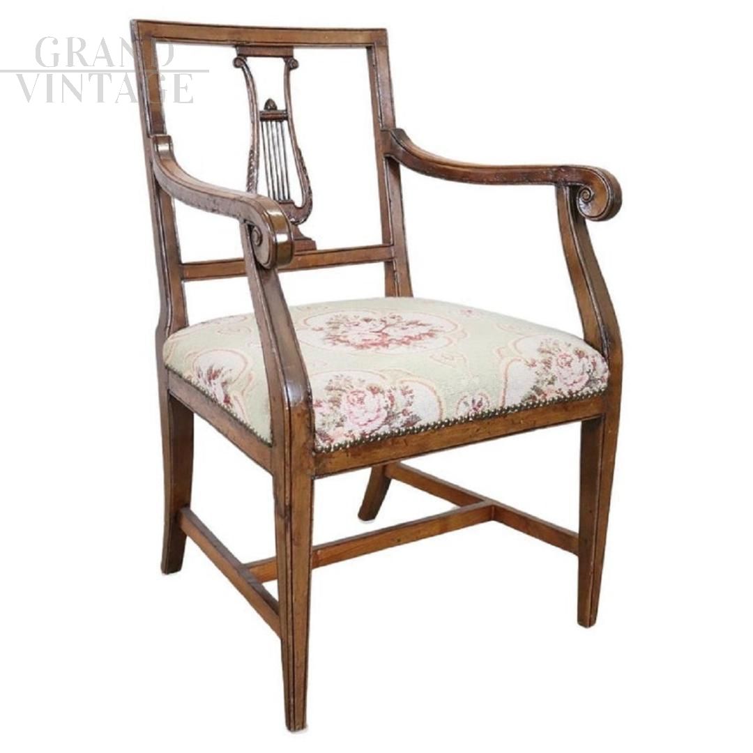Bella poltrona antica italiana del XVIII secolo, del periodo Luigi XVI, in legno di noce massello. La poltrona è molto semplice ed essenziale. Bellissimo lo schienale decorato con una lira intagliata nel legno. Ottime le condizioni dell’imbottitura e del tessuto. Perfetta per essere utilizzata come poltrona da scrivania. La poltrona è in perfette condizioni d’epoca, pronta per essere utilizzata nella vostra casa. Perfetta per essere collocata in una casa di campagna.