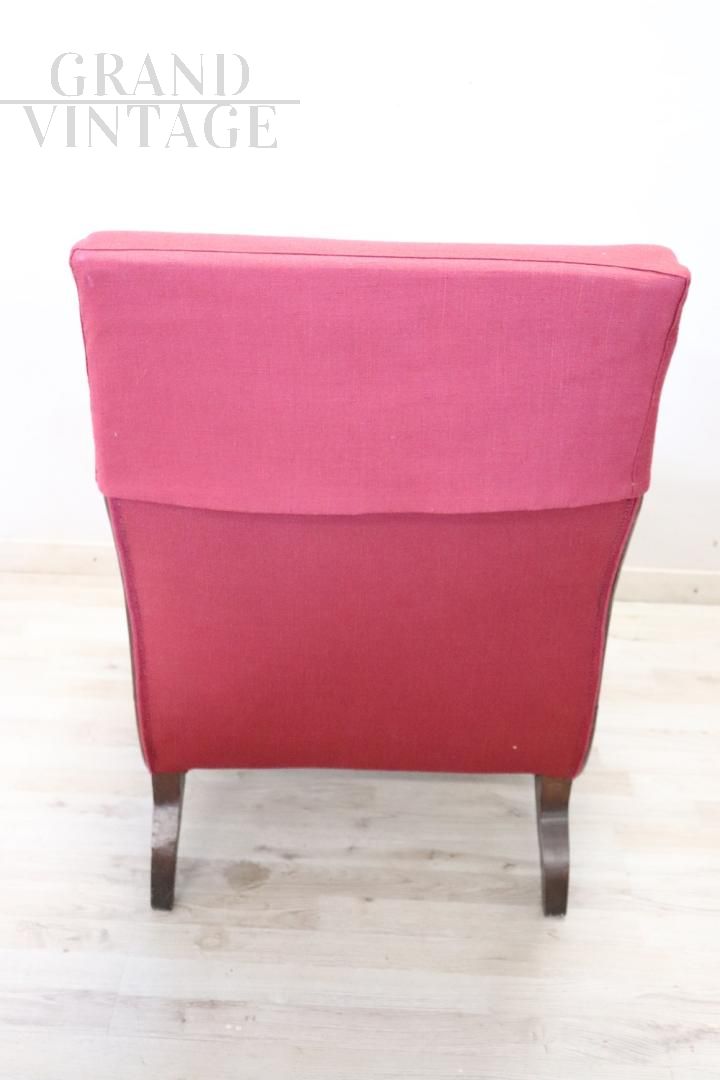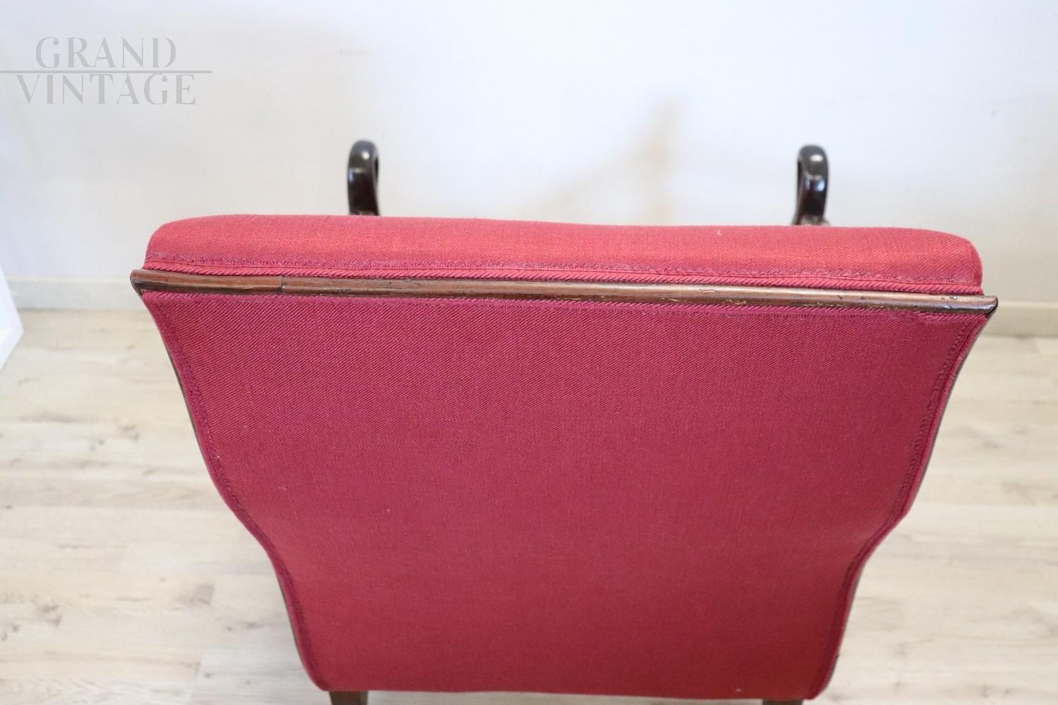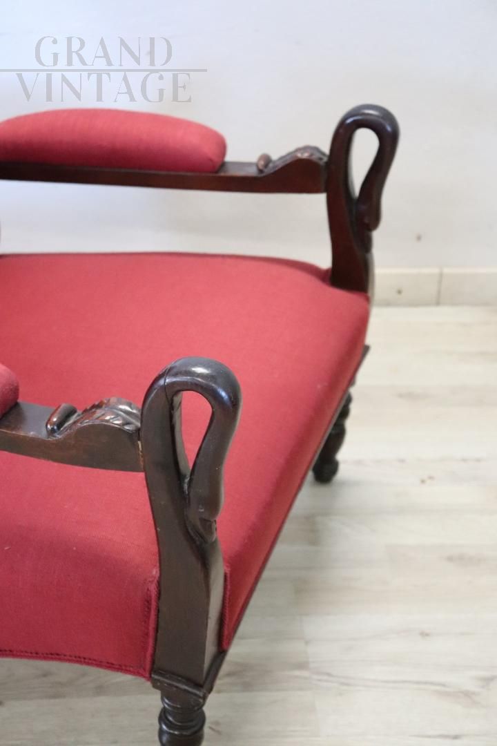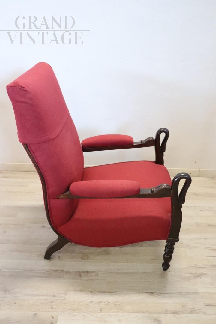 Bellissima poltrona antica della prima metà del'800 in legno di noce, con elegante tessuto rosso, caratterizzata da un raffinato lavoro ad intaglio nel legno con braccioli a testa di cigno. Seduta comoda e avvolgente ideale da relax o conversazione. Perfette condizioni generali sia del legno che di tappezzeria e tessuto, ottimo prezzo trattabile.