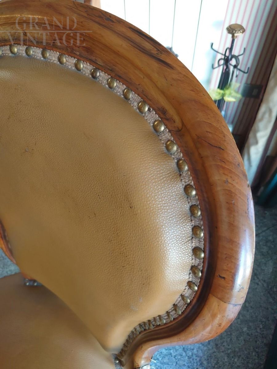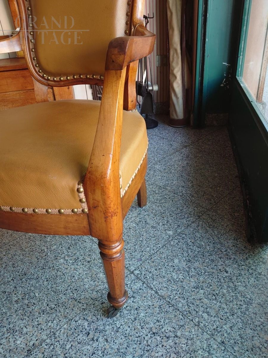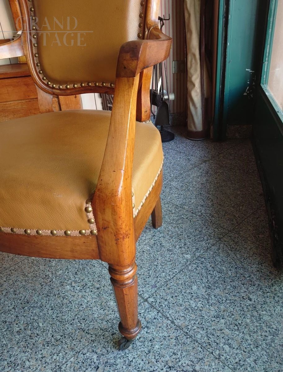 Poltrona antica dei primi dell'800 in legno massello di noce, rivestita in pelle color nocciola, completa di rotelle nelle gambe anteriori.