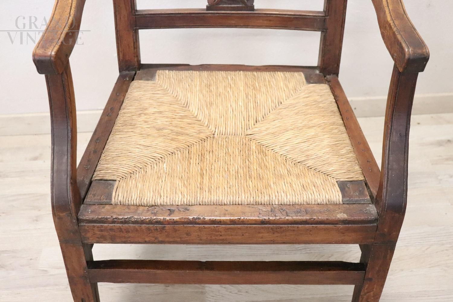 Bellissima poltrona rustica antica italiana del XVIII secolo, periodo Luigi XVI, in legno di noce massello. La poltrona è molto semplice ed essenziale, bella la decorazione in legno dello schienale. La seduta è ampia e confortevole in paglia rustica. La poltrona è in perfette condizioni d'epoca, perfetta per essere collocata in una casa di campagna. Ottime condizioni generali, ottimo prezzo trattabile