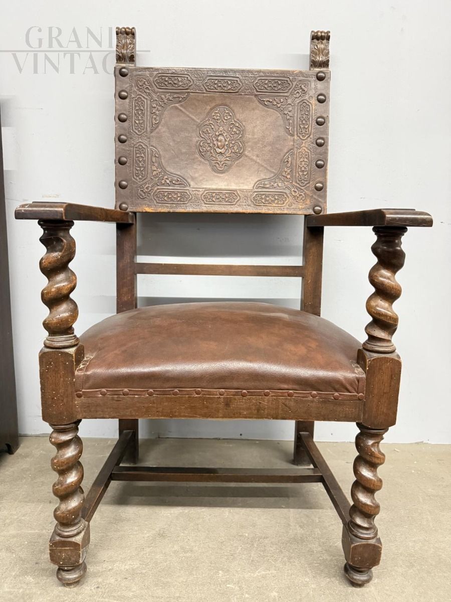 Poltrona antica neorinascimentale con braccioli e cuoio stampato, XIX secolo